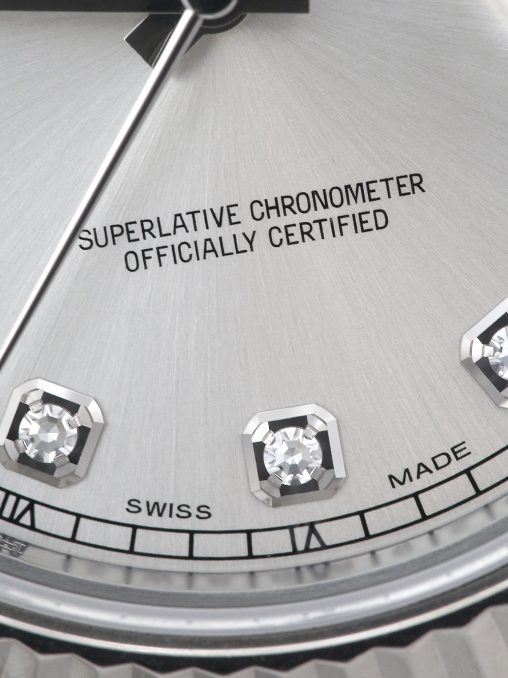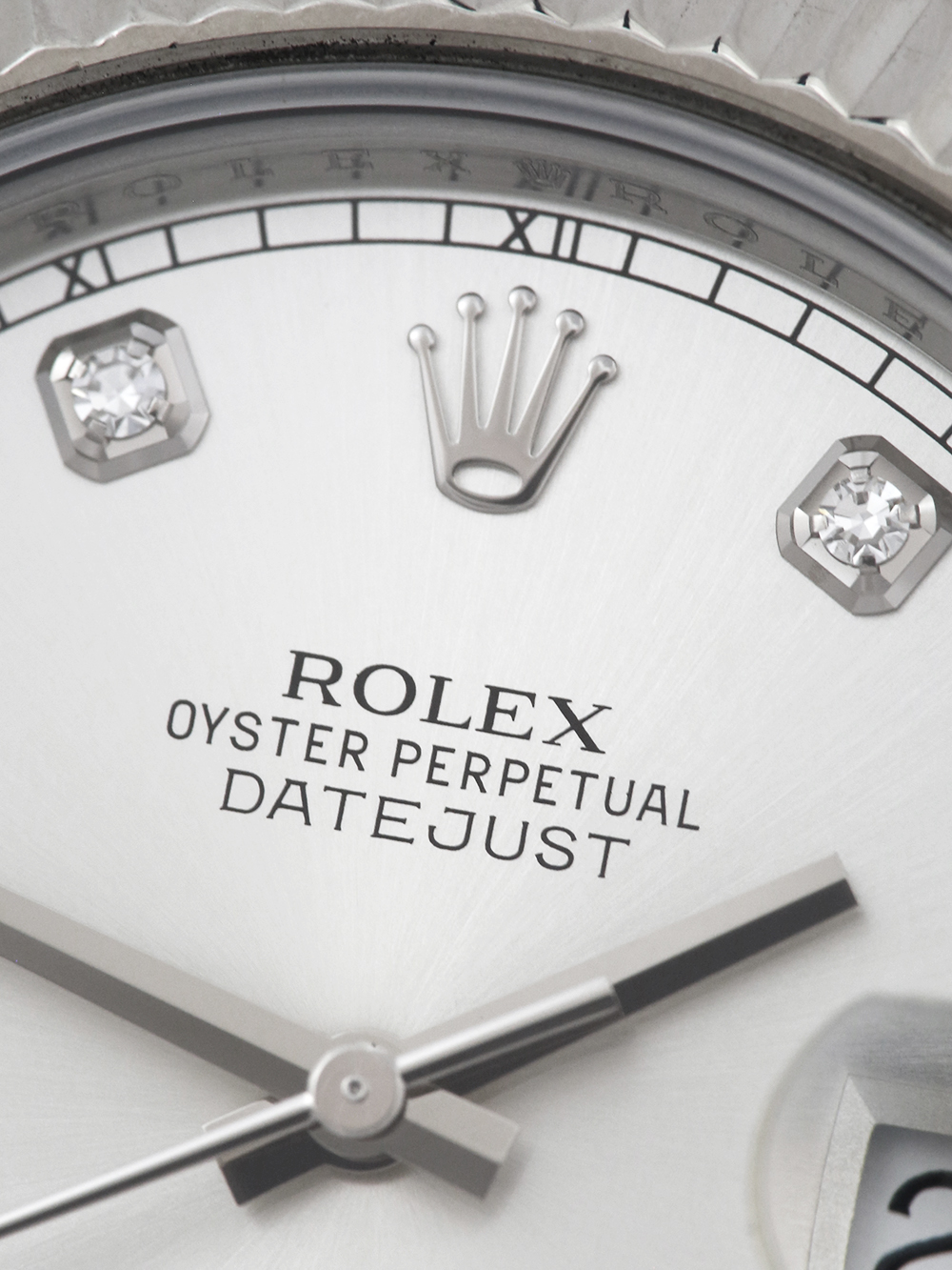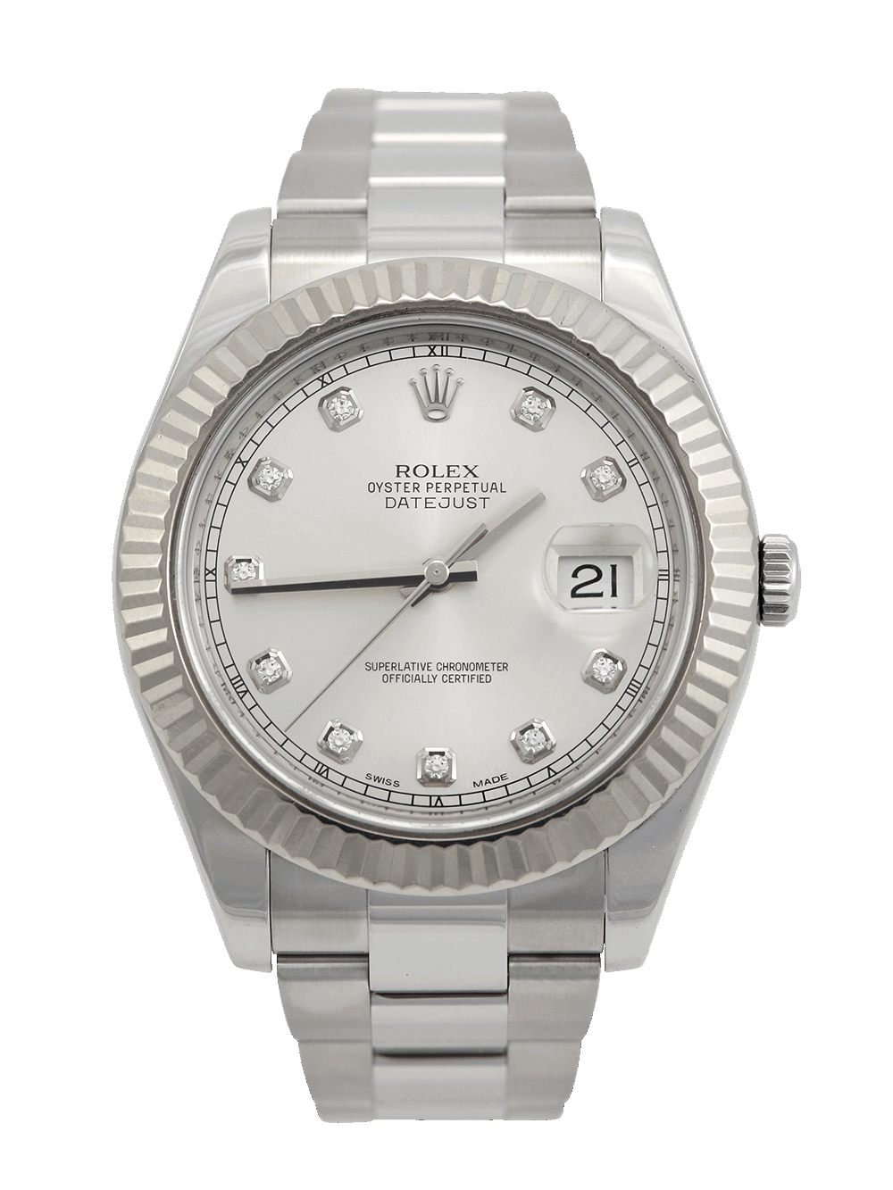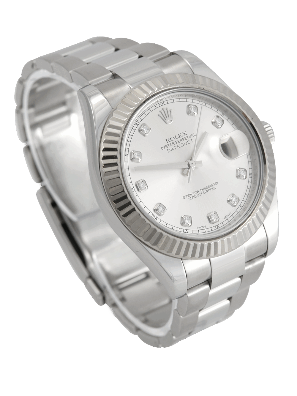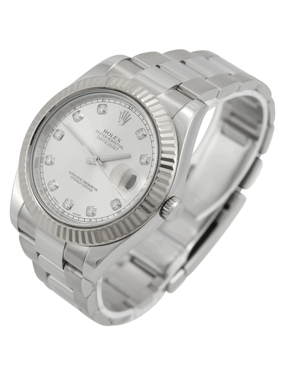 A previously owned in pristine condition a chronometer rated, automatic movement Rolex Datejust II, model reference 116334. Featuring a 41mm stainless steel case, housing a silver diamond dot dial with a date aperture at 3 o’clock and an external cyclops. The dial is surrounded by a white gold fluted bezel. This watch comes on a full retail length stainless steel Rolex Oyster bracelet with a folding Oysterclasp.
