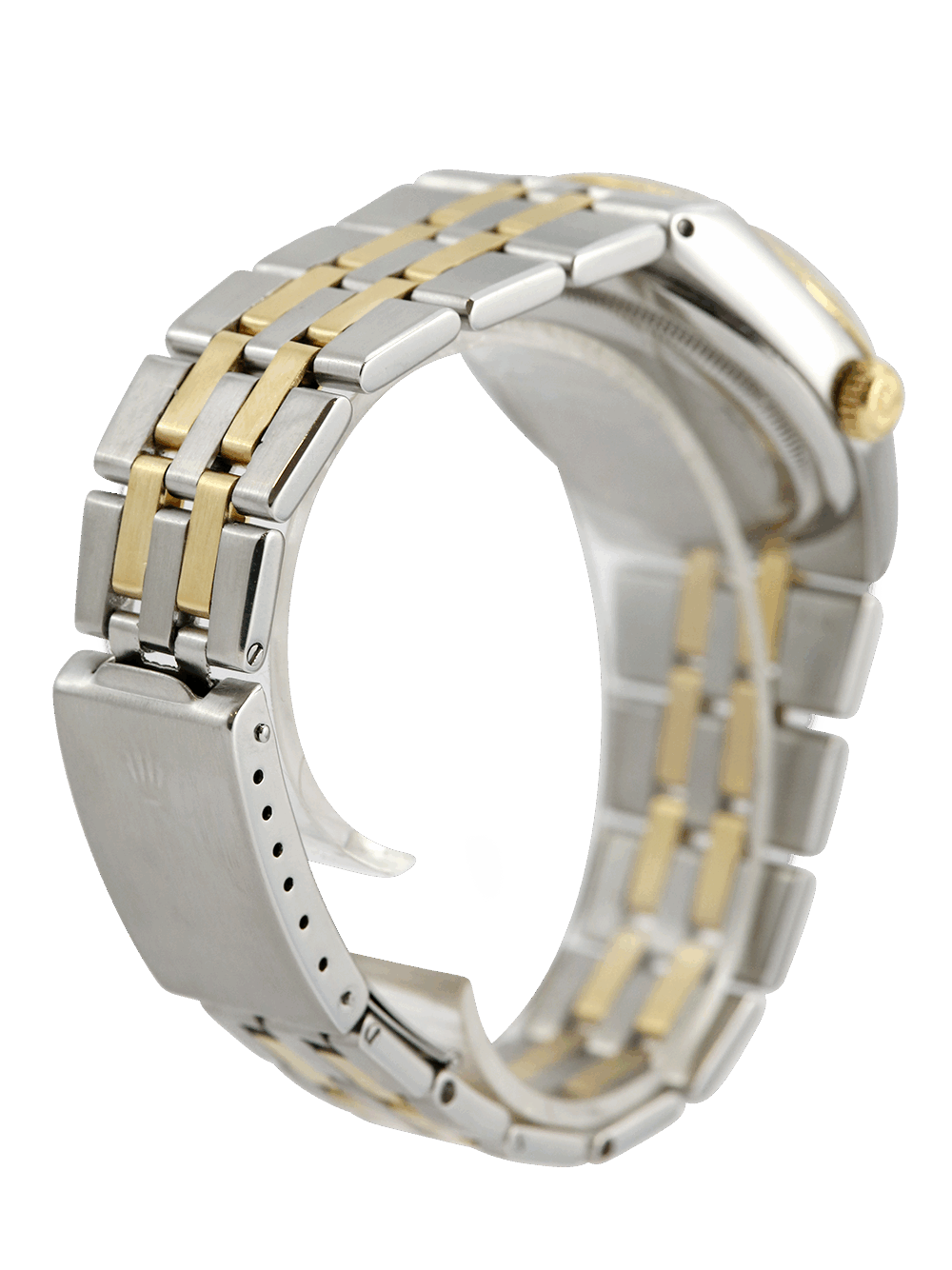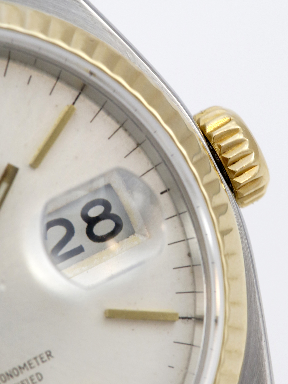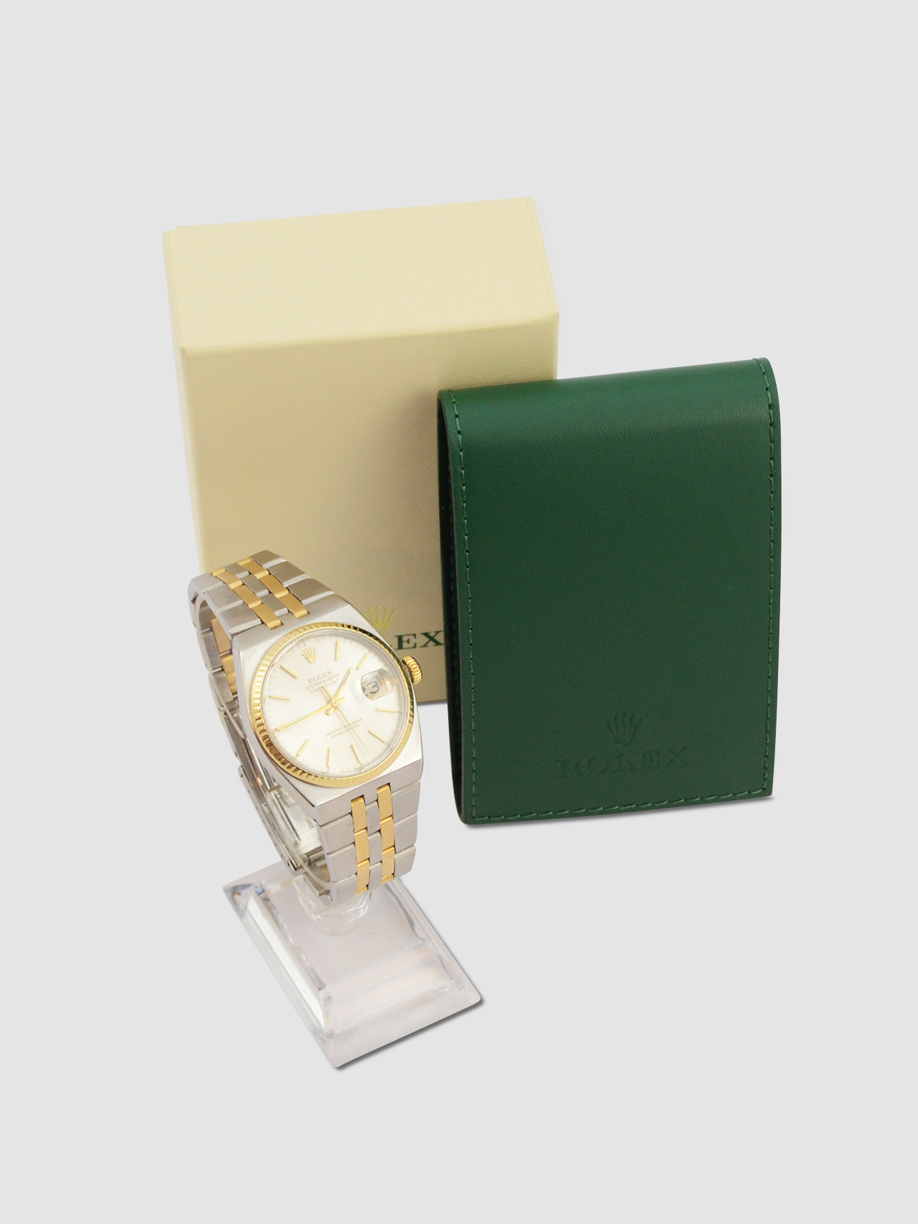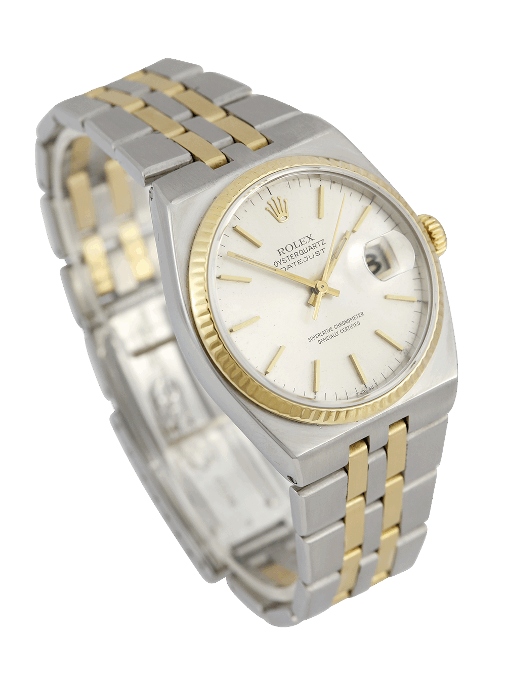 A very good vintage condition, pre-owned, superlative chronometer certified, quartz movement Rolex Oysterquartz Datejust model reference 17013. Featuring a 36mm stainless steel & yellow gold bimetal case, housing a silver baton dial with a date aperture at 3 o’clock. The dial is surrounded by a slim yellow gold fluted bezel. All presented on a stainless steel and yellow gold Rolex Oyster Quartz bracelet. The ’71’ serial number dates this watch as circa 1980.