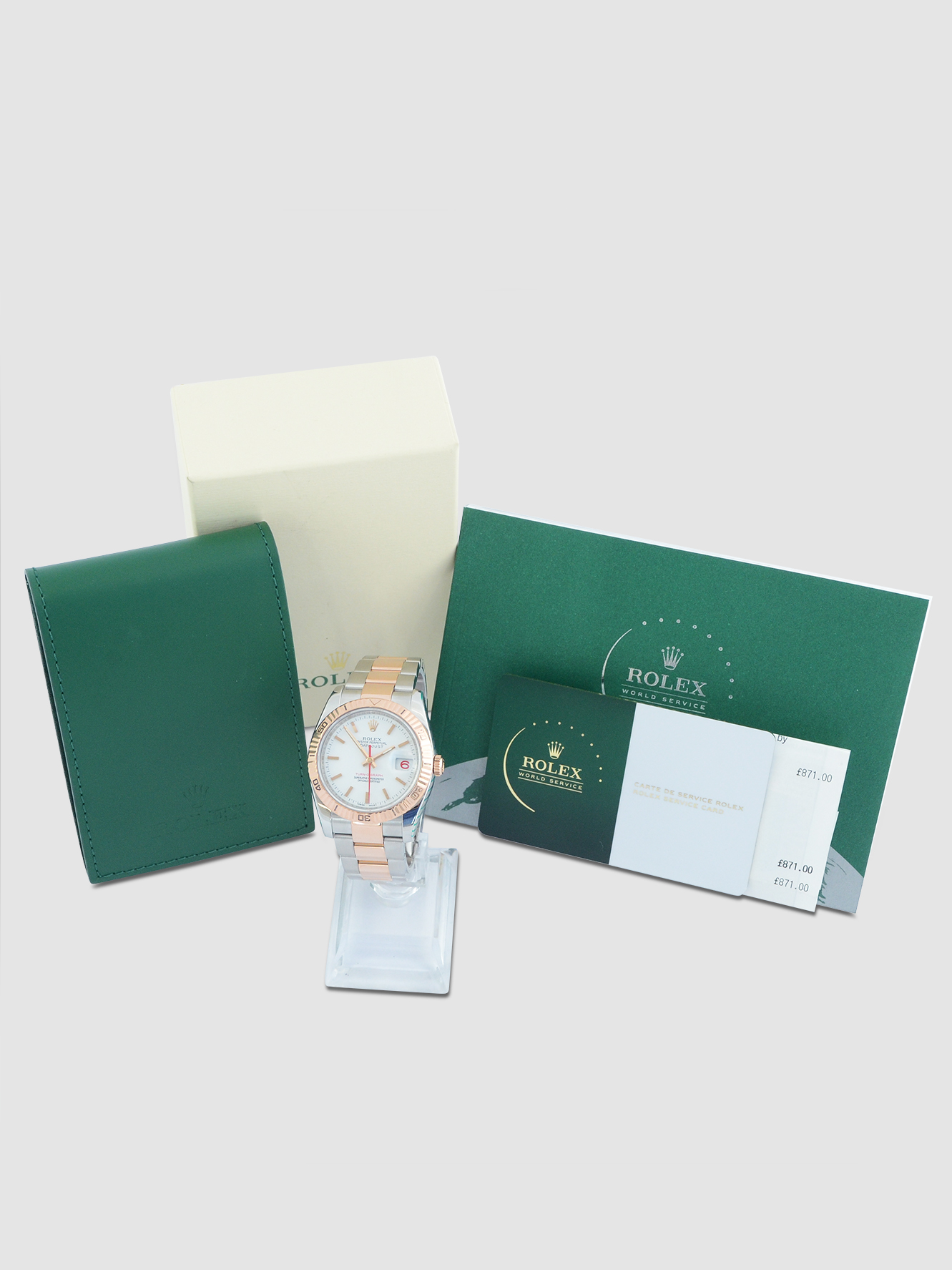 As with all of our watches which have had manufacture service work completed this watch includes the original Rolex service box, the original Rolex service pouch, an original Rolex service manual and the new passport style digital Rolex service warranty card dated March 2025 and the original service receipt (£871).