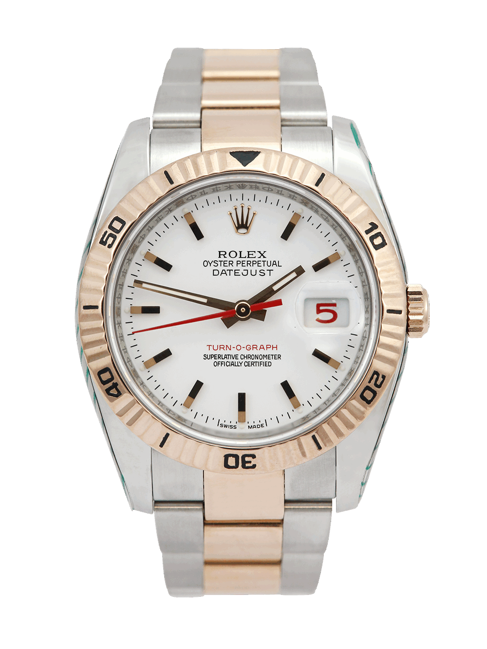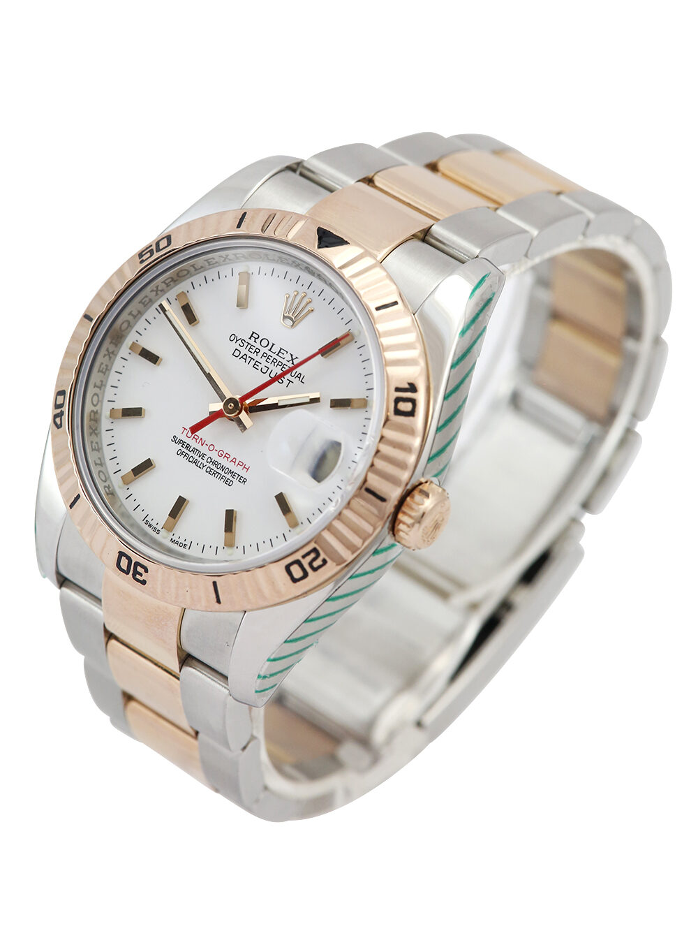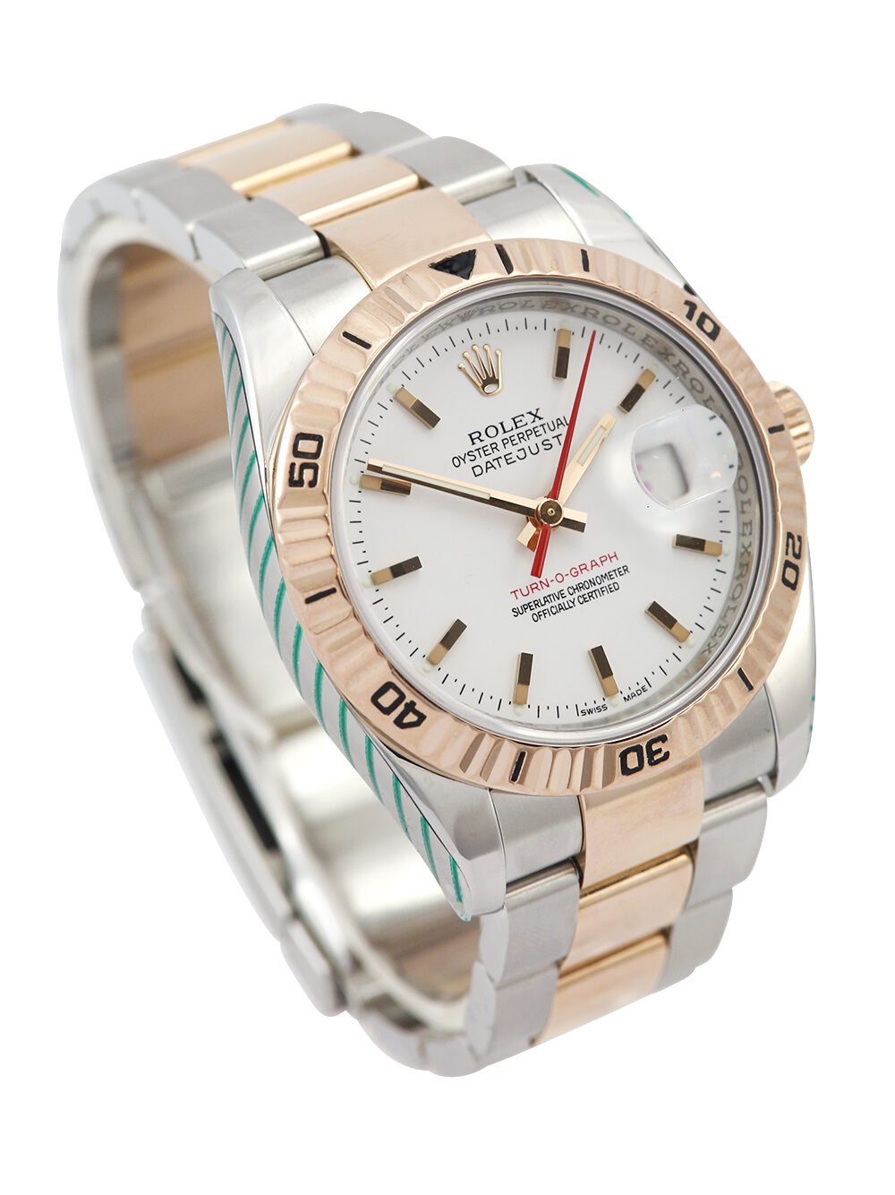 A very good pre-owned condition, chronometer certified, automatic movement Rolex Datejust Turn-O-Graph, model reference 116261. Featuring 36mm stainless steel & rose gold case housing a white baton dial with a striking red seconds hand and red numeral date aperture located at 3 o’clock. The dial is surrounded by a rose gold bi-directional rotating fluted bezel. Presented on a bi-metal Rolex Oyster bracelet with an Oysterclasp. This particular watch is supplied as watch only and the Rolex service provenance as detailed below. Late ‘D’ serial suggests a circa 2009 year of manufacture.