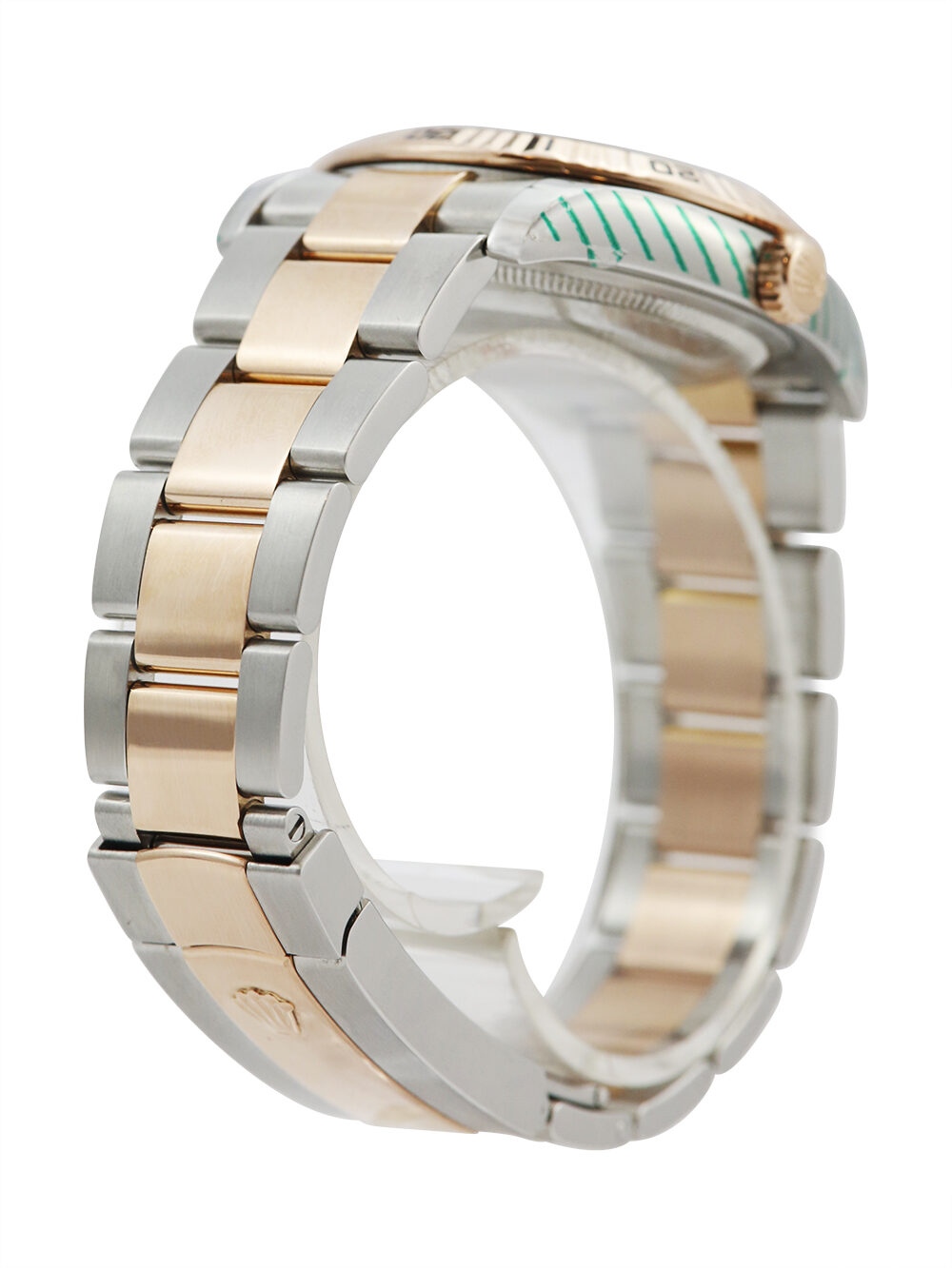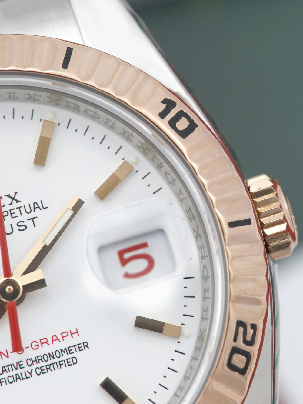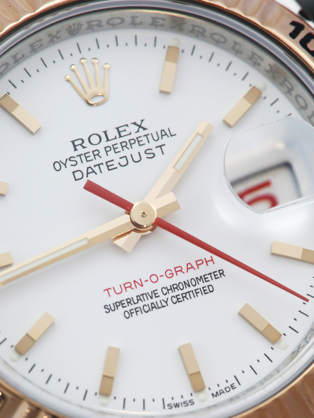 A very good pre-owned condition, chronometer certified, automatic movement Rolex Datejust Turn-O-Graph, model reference 116261. Featuring 36mm stainless steel & rose gold case housing a white baton dial with a striking red seconds hand and red numeral date aperture located at 3 o’clock. The dial is surrounded by a rose gold bi-directional rotating fluted bezel. Presented on a bi-metal Rolex Oyster bracelet with an Oysterclasp. This particular watch is supplied as watch only and the Rolex service provenance as detailed below. Late ‘D’ serial suggests a circa 2009 year of manufacture.