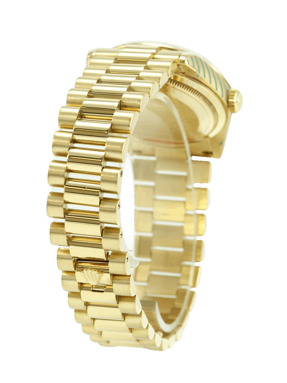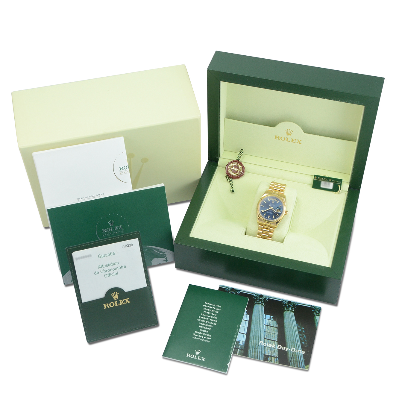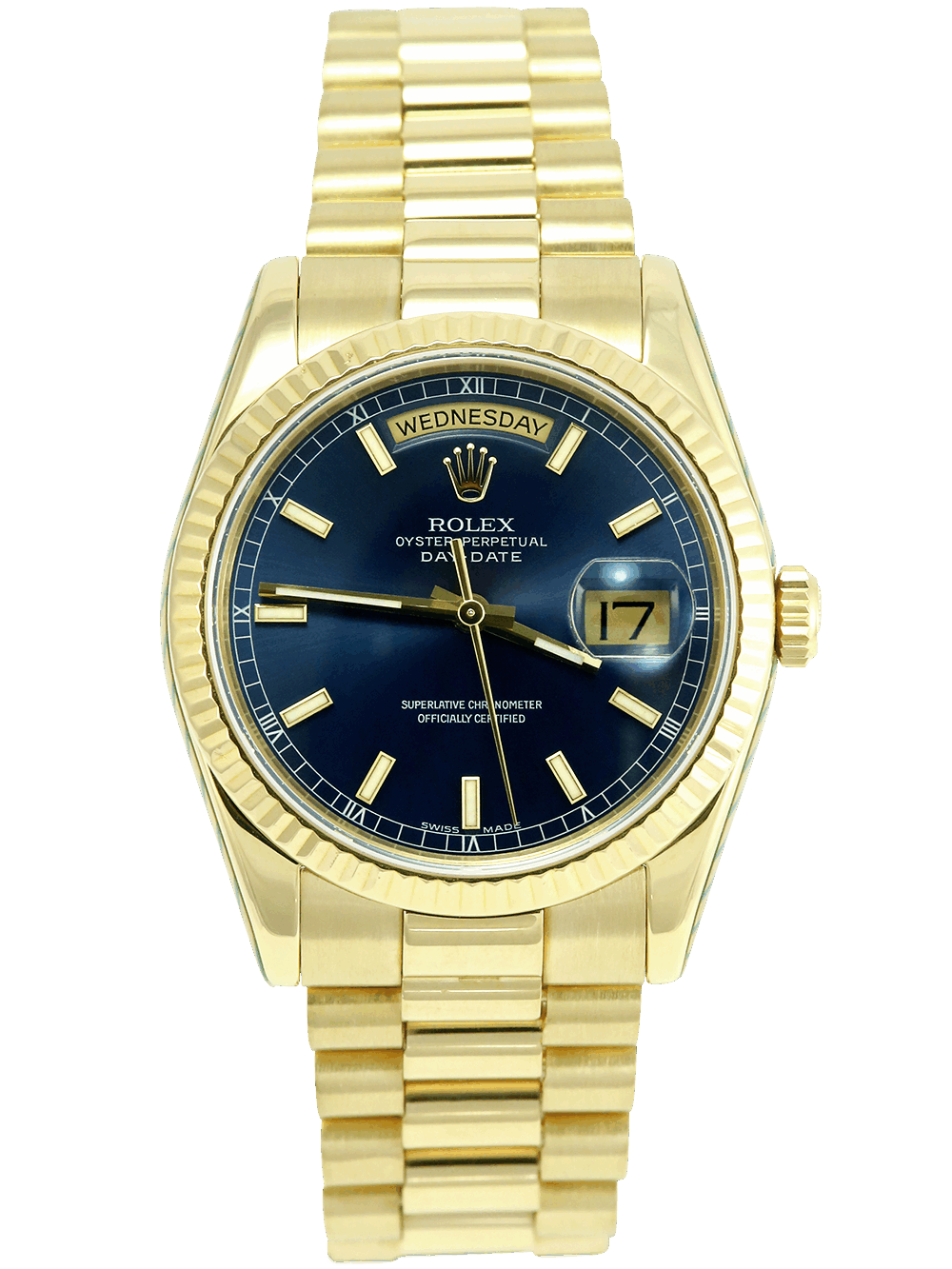An excellent condition, pre-owned, chronometer certified automatic movement Rolex Day-Date, model reference 118238. Featuring a 36mm yellow gold case with a extremely rare navy blue dial with applied gold baton hour markers. The dial further shows a weekday aperture at 12 o’clock and a date aperture at 3 o’clock with an external cyclops; both of these can be changed conveniently thanks to the double quickset feature. The dial is surrounded by a yellow gold fluted bezel. All presented on a full retail length yellow gold Rolex President bracelet with a concealed crown clasp.