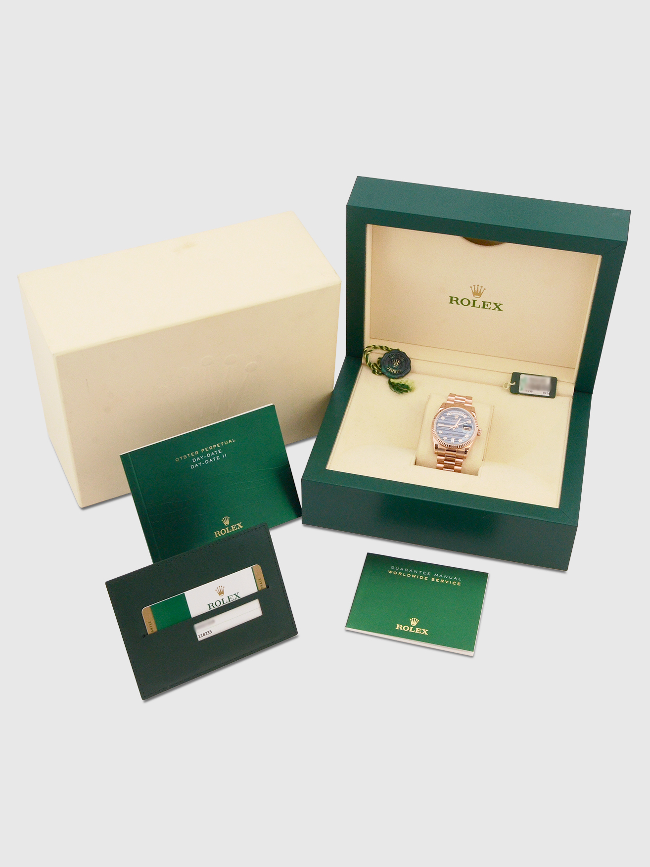 This watch is supplied as shown in the images with both of the original Rolex inner and outer boxes, the two original Rolex manuals, the two original Rolex swing tags, the original Rolex warranty card holder and the original Rolex warranty card dated June 2018 when first supplied new.