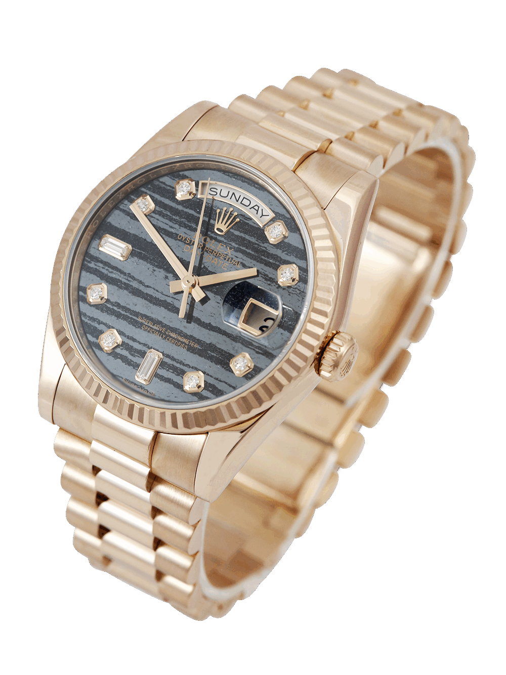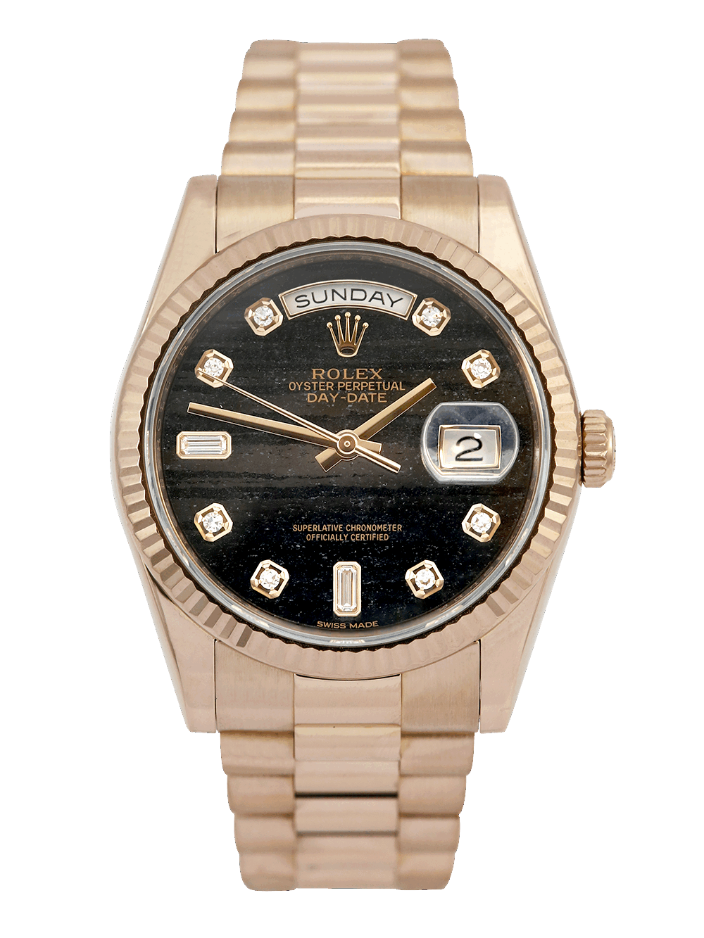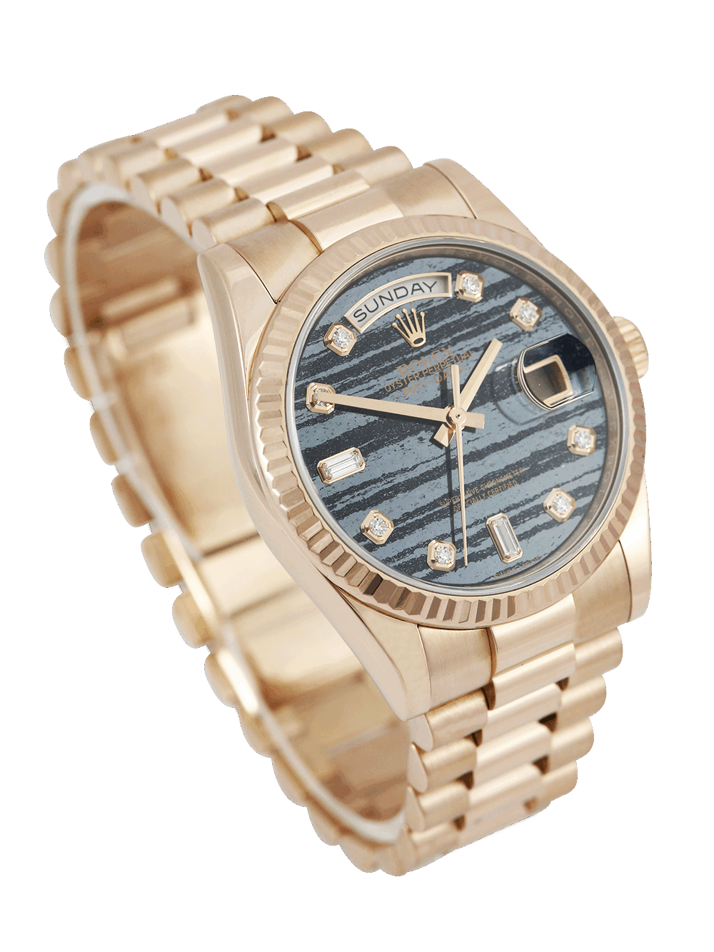 An excellent condition pre-owned rose gold chronometer certified automatic movement 36mm case size Rolex Day-Date 118235 featuring a Ferrite diamond dot dial housing a date aperture at 3 O’clock with an external Cyclops and day aperture in-between 11 & 1 O’clock surrounded by a rose gold fluted bezel on a rose gold Rolex President bracelet