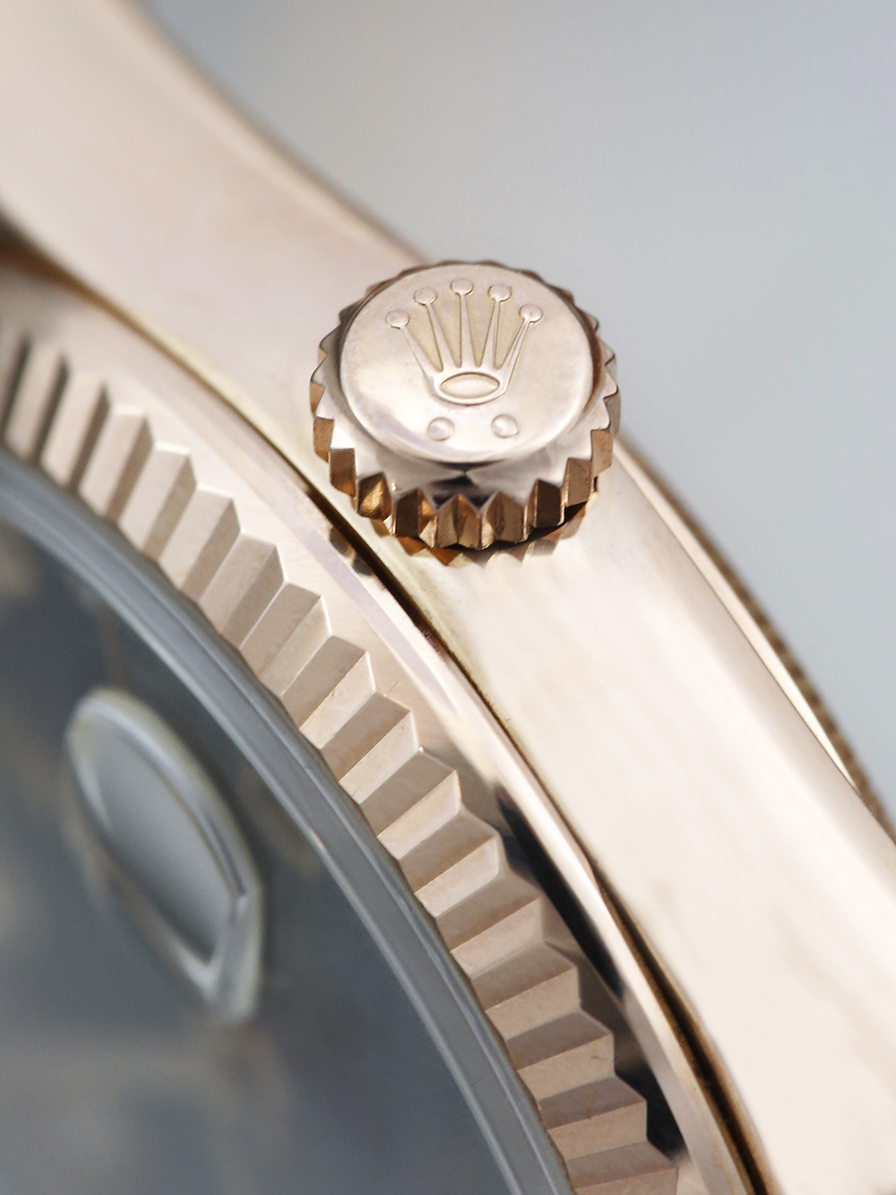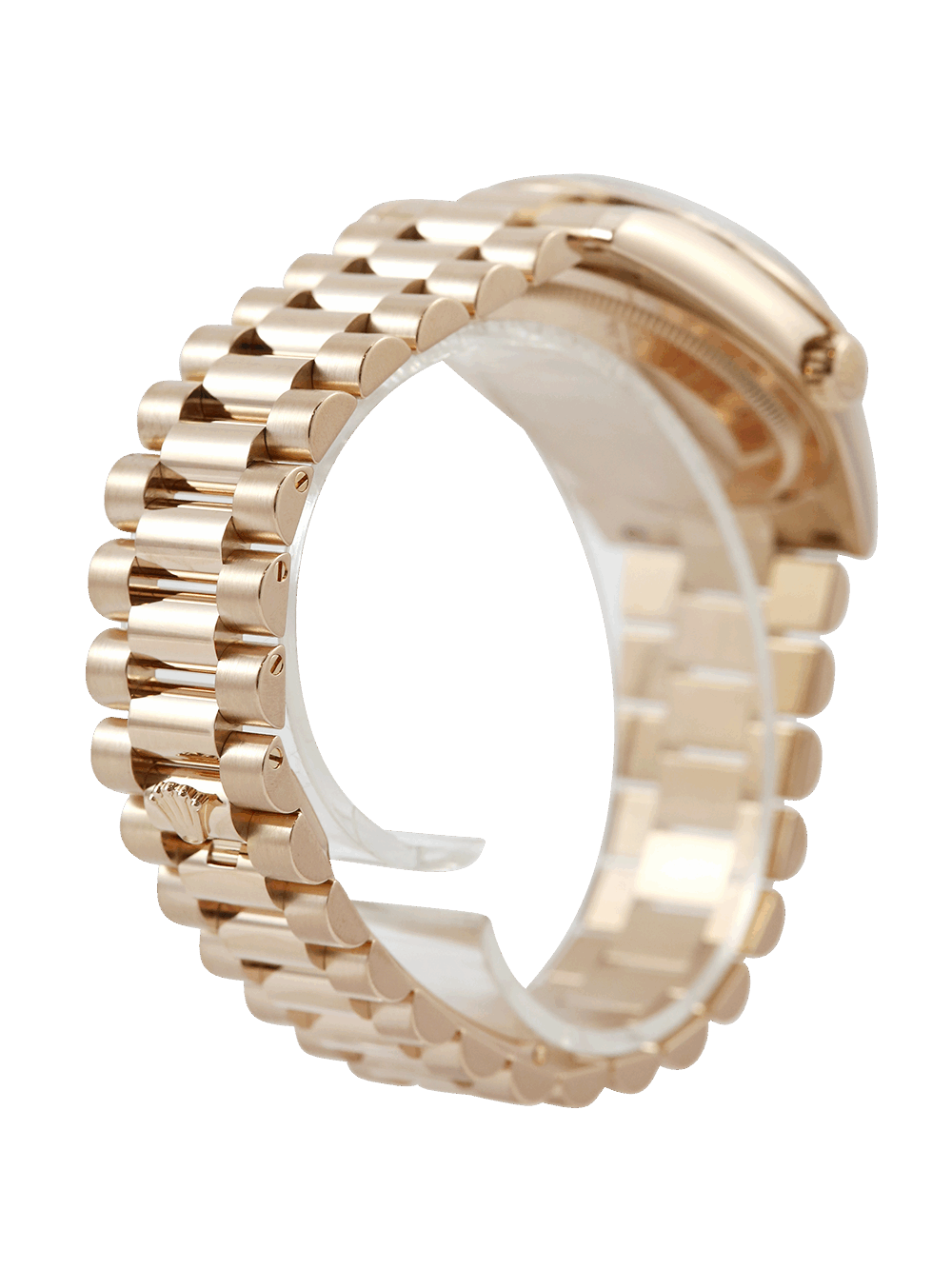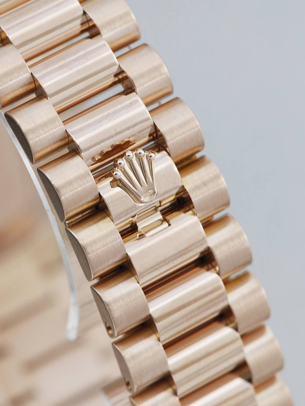An excellent condition pre-owned rose gold chronometer certified automatic movement 36mm case size Rolex Day-Date 118235 featuring a Ferrite diamond dot dial housing a date aperture at 3 O’clock with an external Cyclops and day aperture in-between 11 & 1 O’clock surrounded by a rose gold fluted bezel on a rose gold Rolex President bracelet