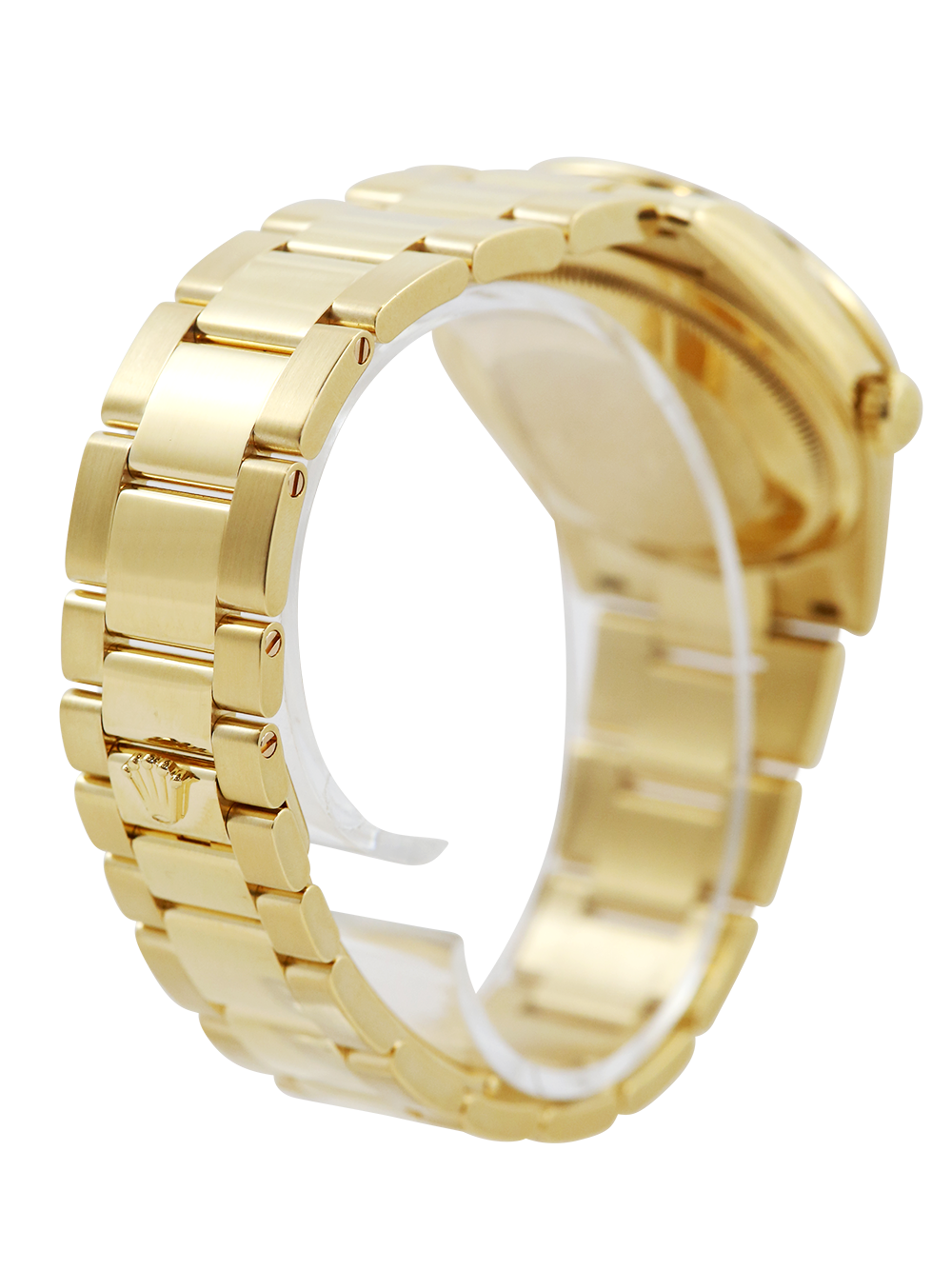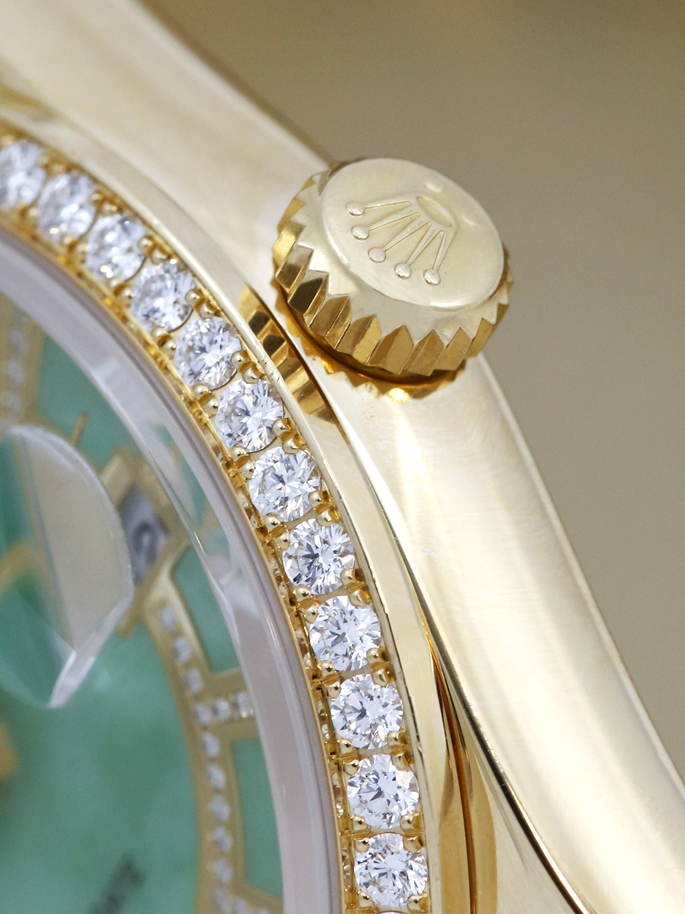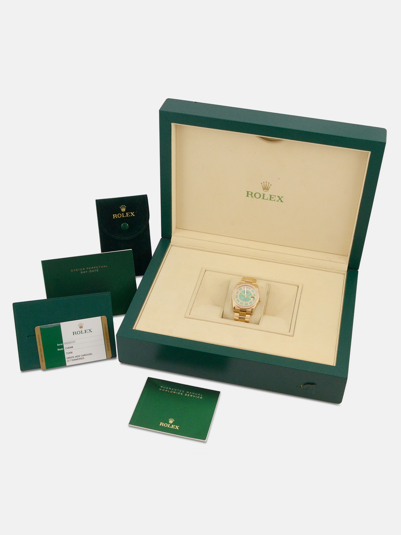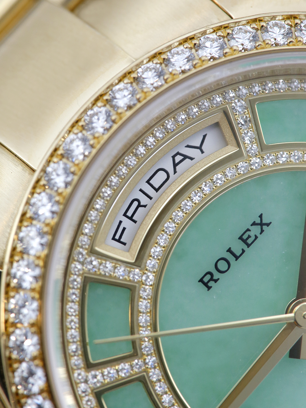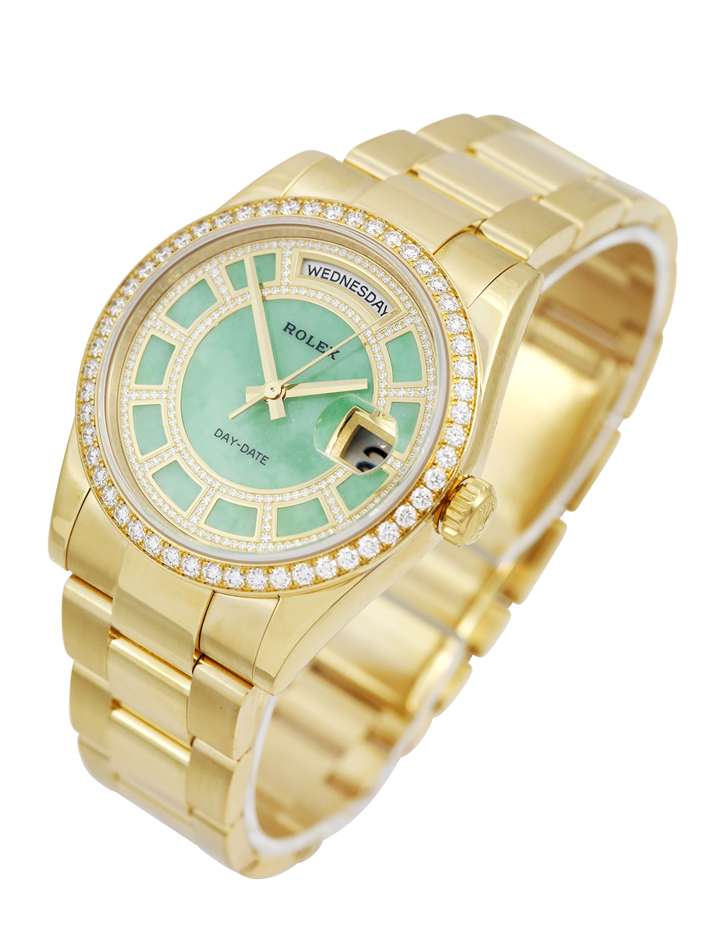 An excellent condition pre-owned yellow gold chronometer rated automatic movement 36mm case size Rolex Day-Date model reference 118348 featuring a very rare green jade carousel dial mounted with 217 diamonds. housing an external Cyclops date aperture at 3 O’clock and a day aperture in-between 11 & 1 O’clock. The dial is surrounded by a factory set round brilliant cut Diamond bezel and the watch comes on a full retail length yellow gold Rolex oyster bracelet with a folding concealed clasp.