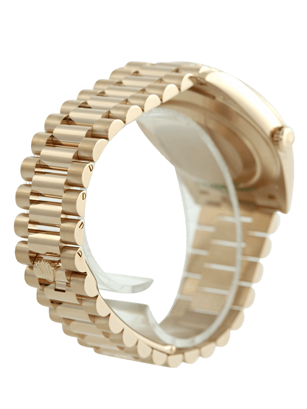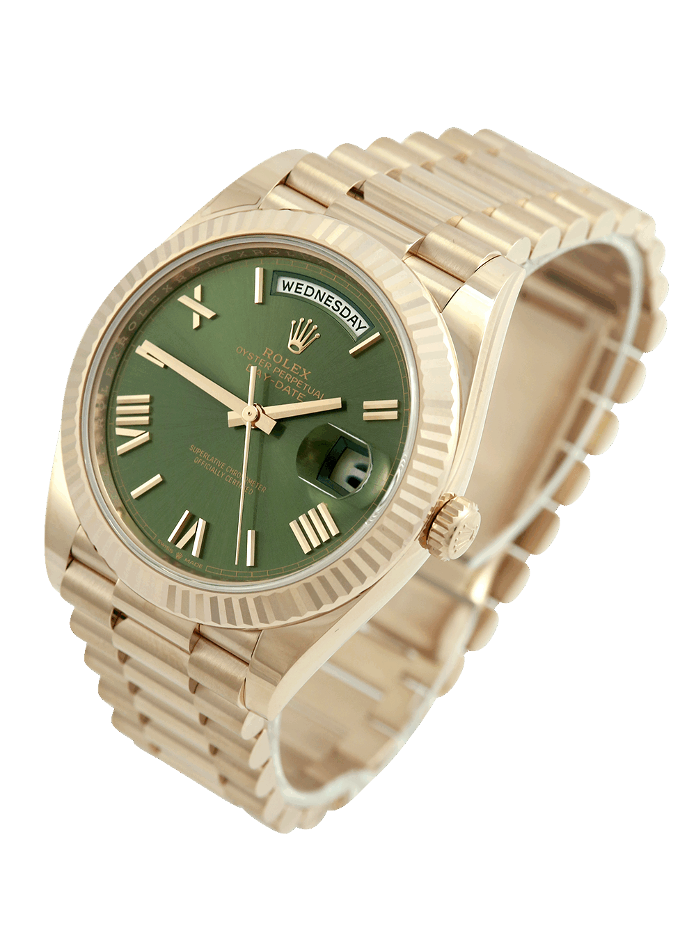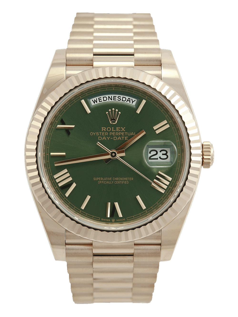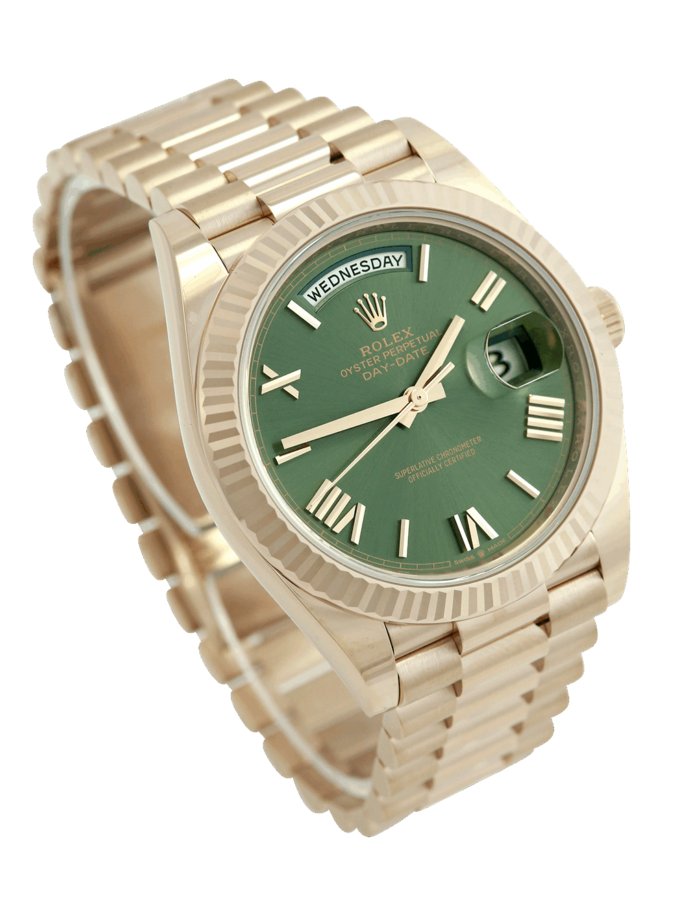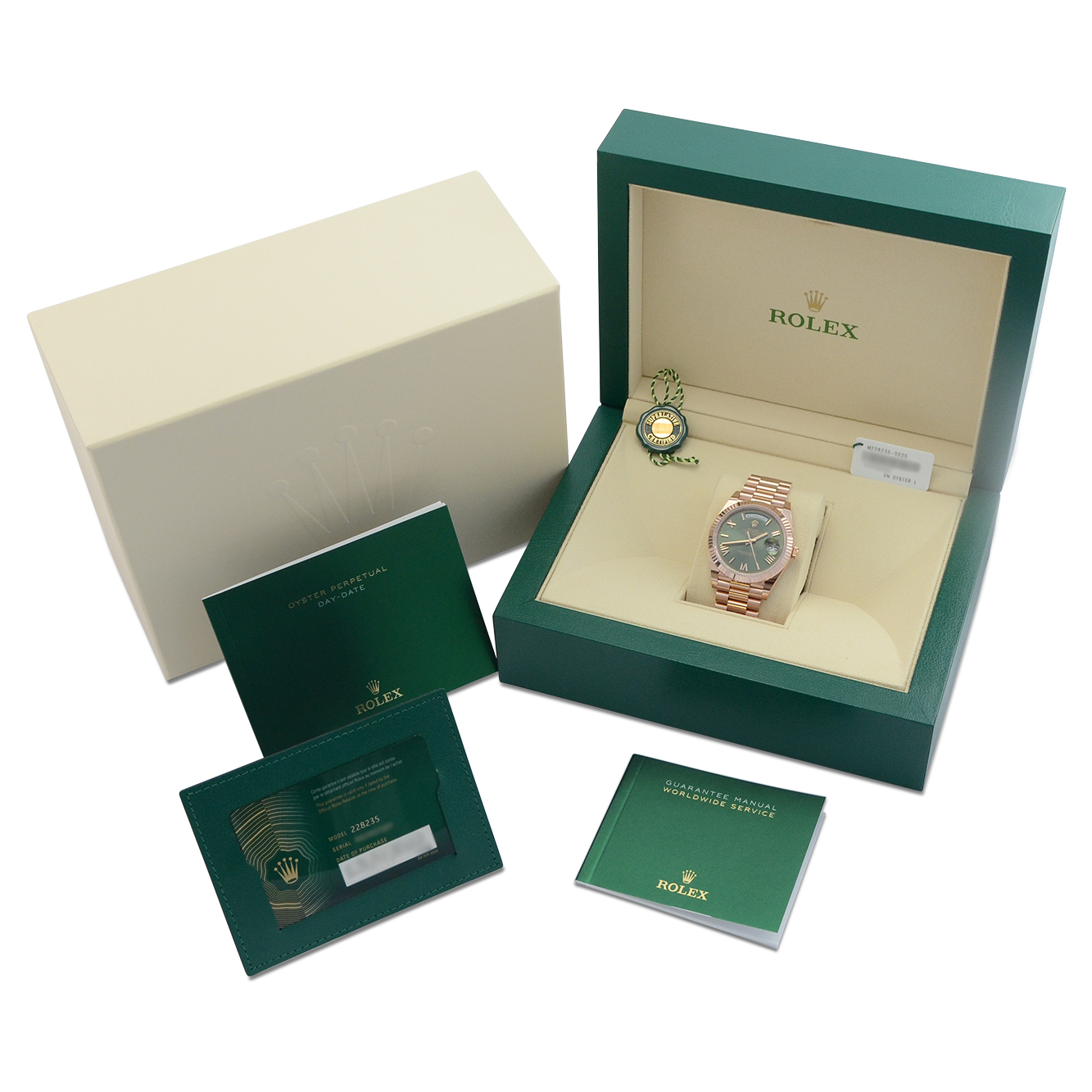A brand new, unworn and unsized with some factory stickers still in untampered a 40mm case size rose gold superlative chronometer, calibre 3255, automatic movement Rolex Day-Date 40 model reference 228235 featuring an olive green Roman numeral dial housing a date aperture at 3 O’clock with an external Cyclops and day aperture in-between 11 & 1 O’clock surrounded by a rose gold fluted bezel. This particular watch comes on a full retail length rose gold Rolex President bracelet.