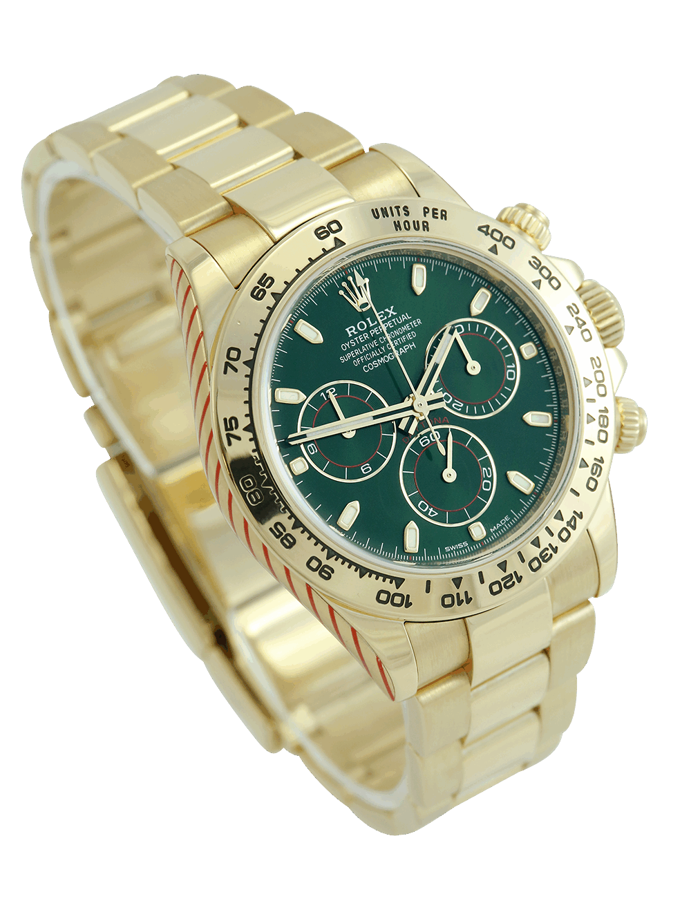 Rolex Daytona 116508 Yellow Gold Green Dial Serviced by Rolex Unworn Since Service Stickers