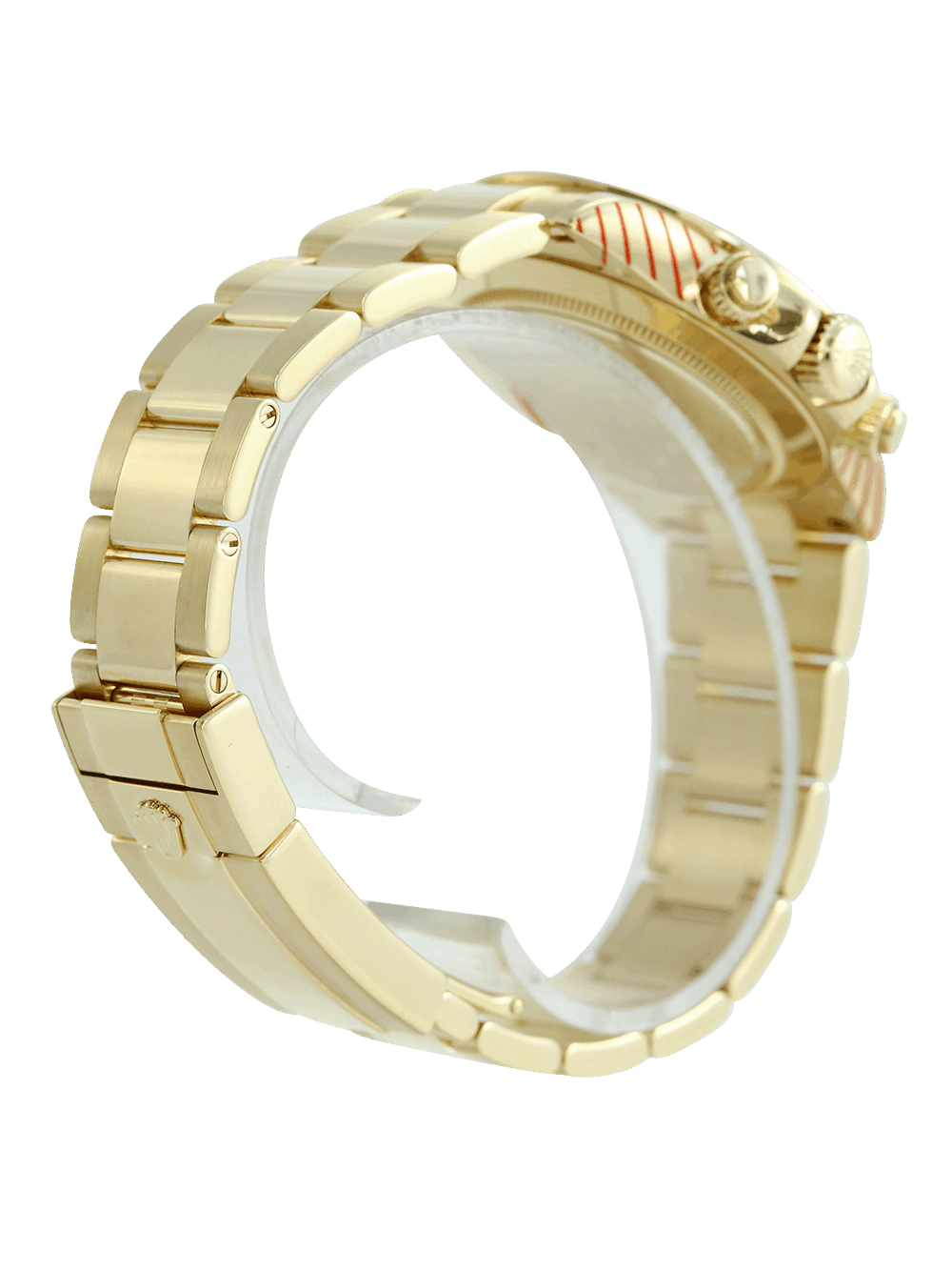 A prefect condition pre-owned 40mm case size yellow gold superlative chronometer, calibre 4130, automatic movement Rolex Daytona model reference 116508 featuring a green baton dial with gold outlined green sub-dials housing red inner rings. The 6 o’clock sub-dial has the word Daytona written in red above it and the dial is surrounded by a yellow gold units per hour bezel. This particular watch comes on a full retail length yellow gold Rolex Oyster bracelet.