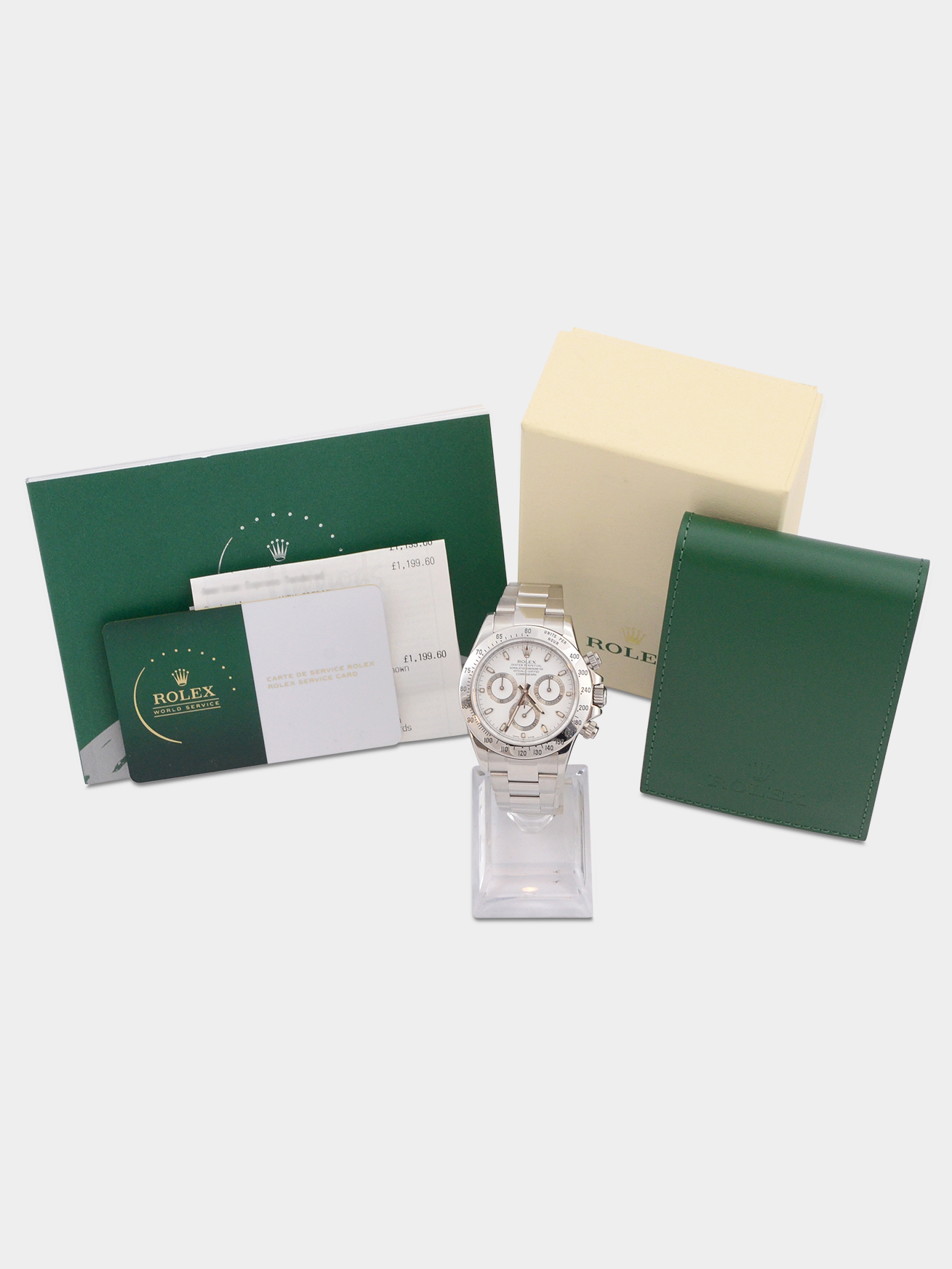 We are delighted to offer for sale this fine example of arguably the world’s most desirable wrist watch. This particular watch is presented unworn since having completed a complete Rolex service. With no expense spared work carried out the peace of mind for the new owner is best described as “priceless”. A uncompromised and unquestionable Rolex Daytona ready to be collected by or shipped to the new proud owner.