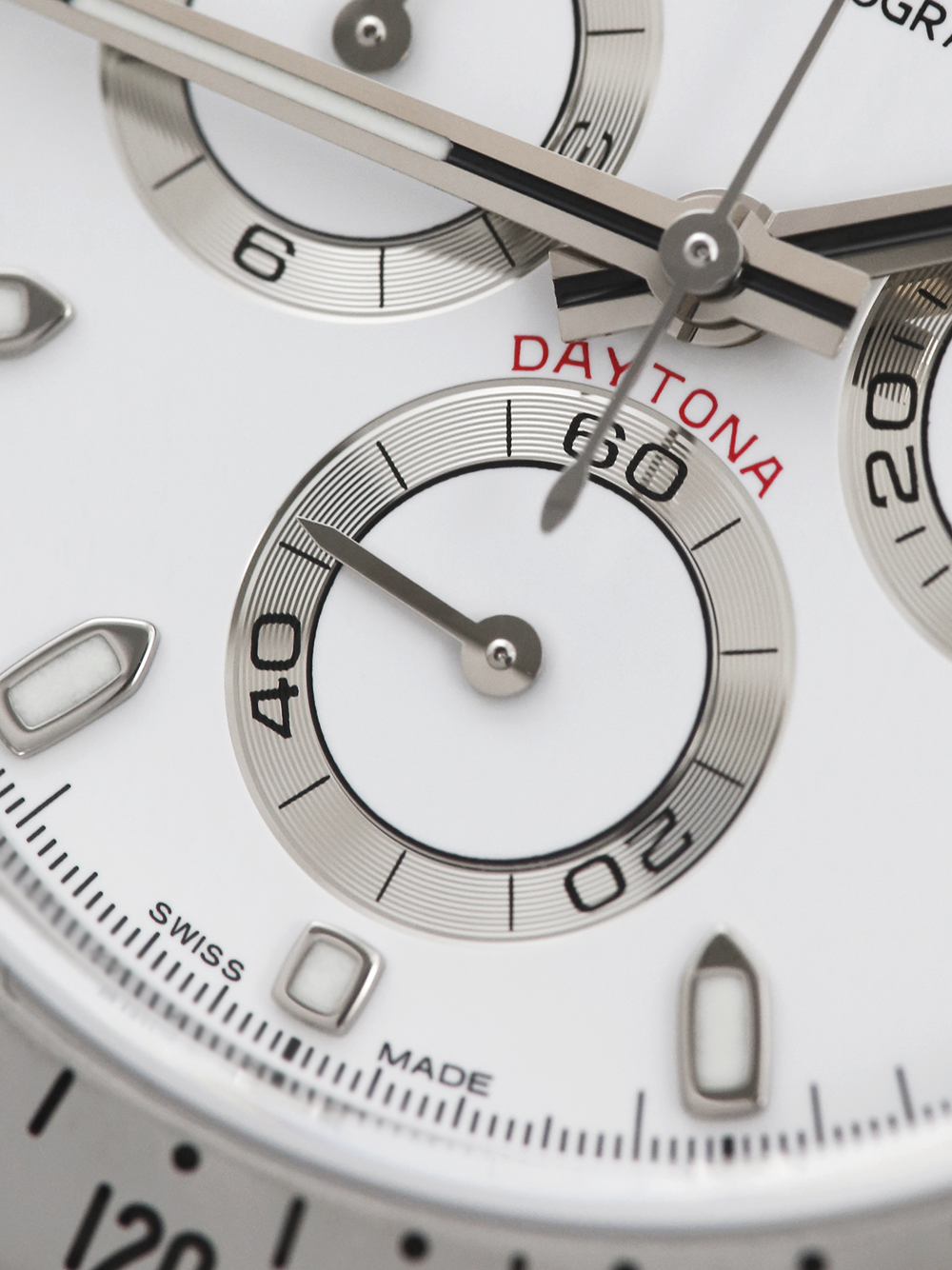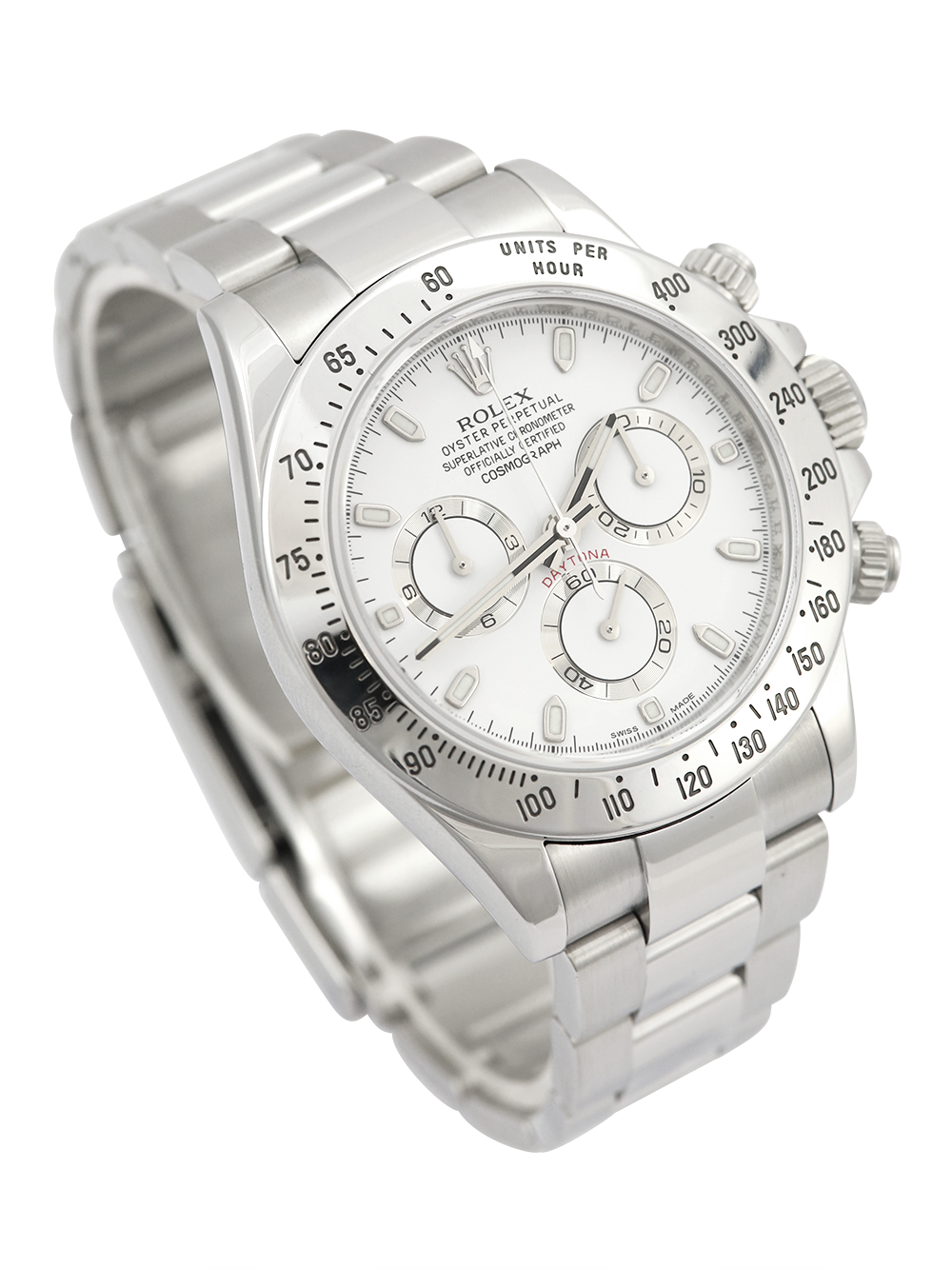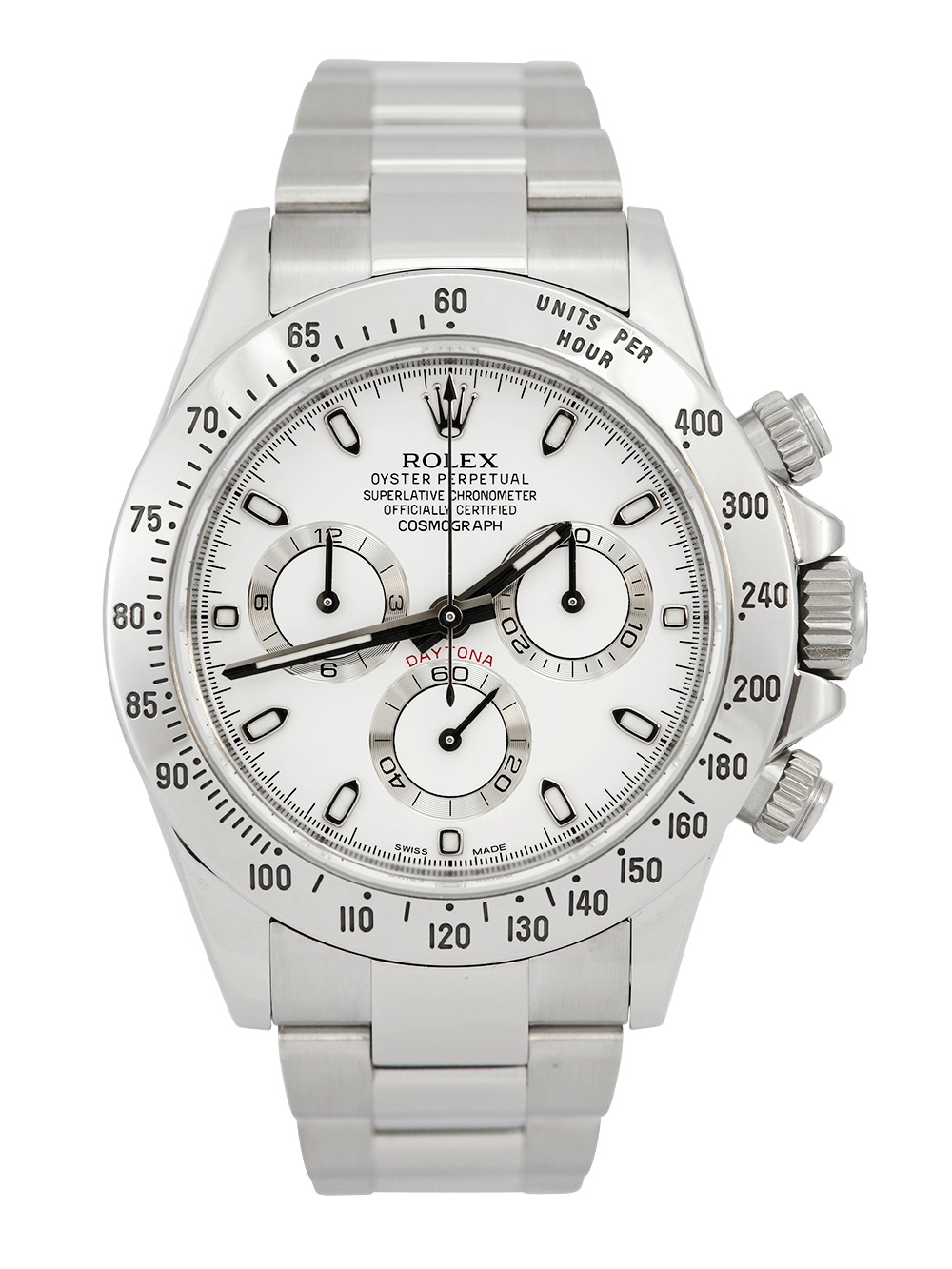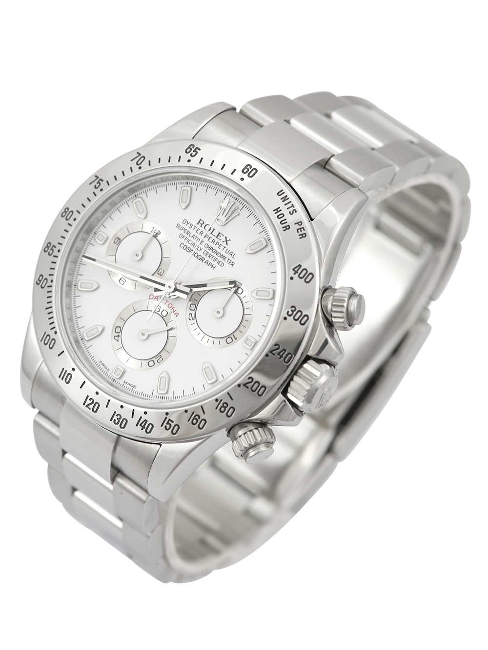 An excellent condition pre-owned stainless steel chronometer certified automatic movement Rolex Daytona model reference 116520 featuring a white baton dial housing silver outlined white sub-dials surrounded by a stainless steel units per hour bezel on a full retail length stainless steel Rolex Oyster bracelet.