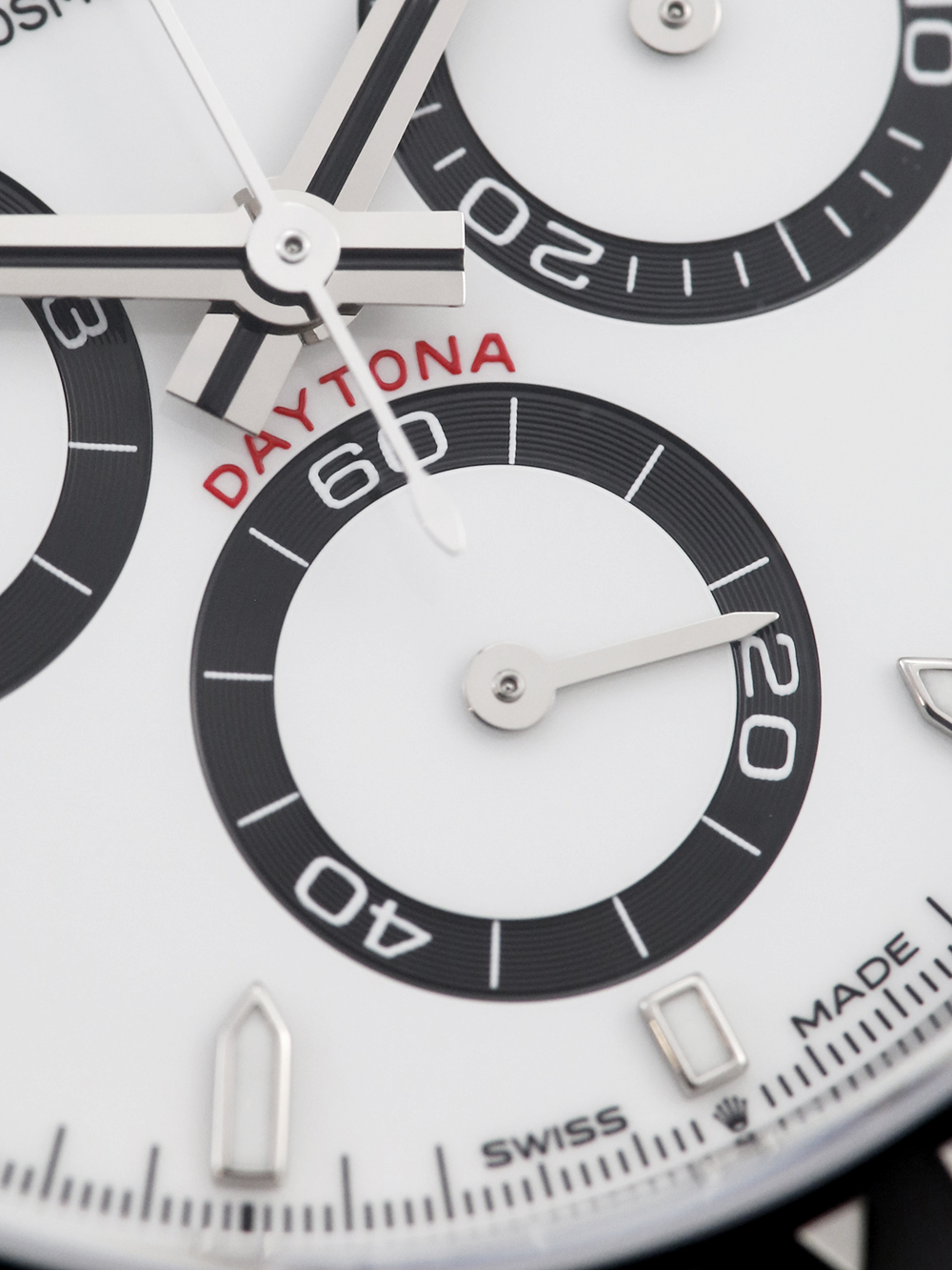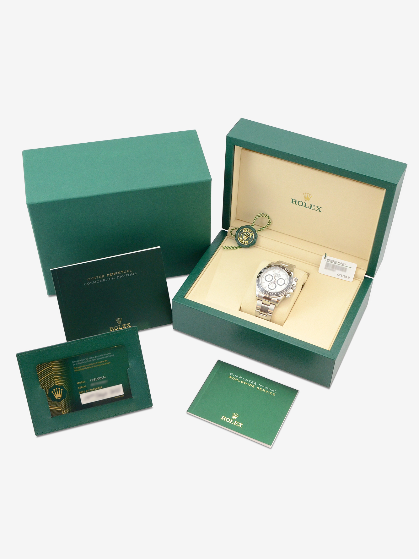 As mentioned above a brand new, unworn and unsized stainless steel 40mm case size superlative chronometer, the latest calibre 4131 automatic movement Rolex Daytona model reference 126500LN featuring a white baton dial housing black-rimmed white sub-dials surrounded by a black ceramic units per hour bezel on a full retail length stainless steel Rolex Oyster bracelet.