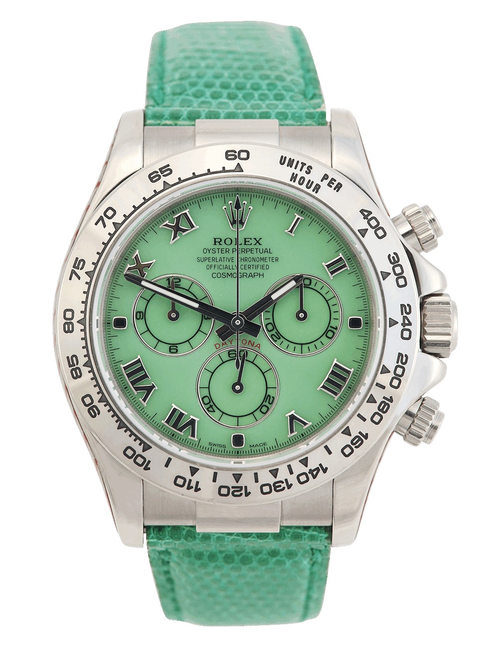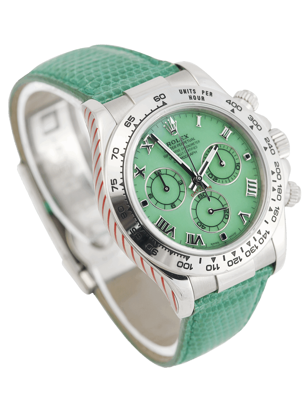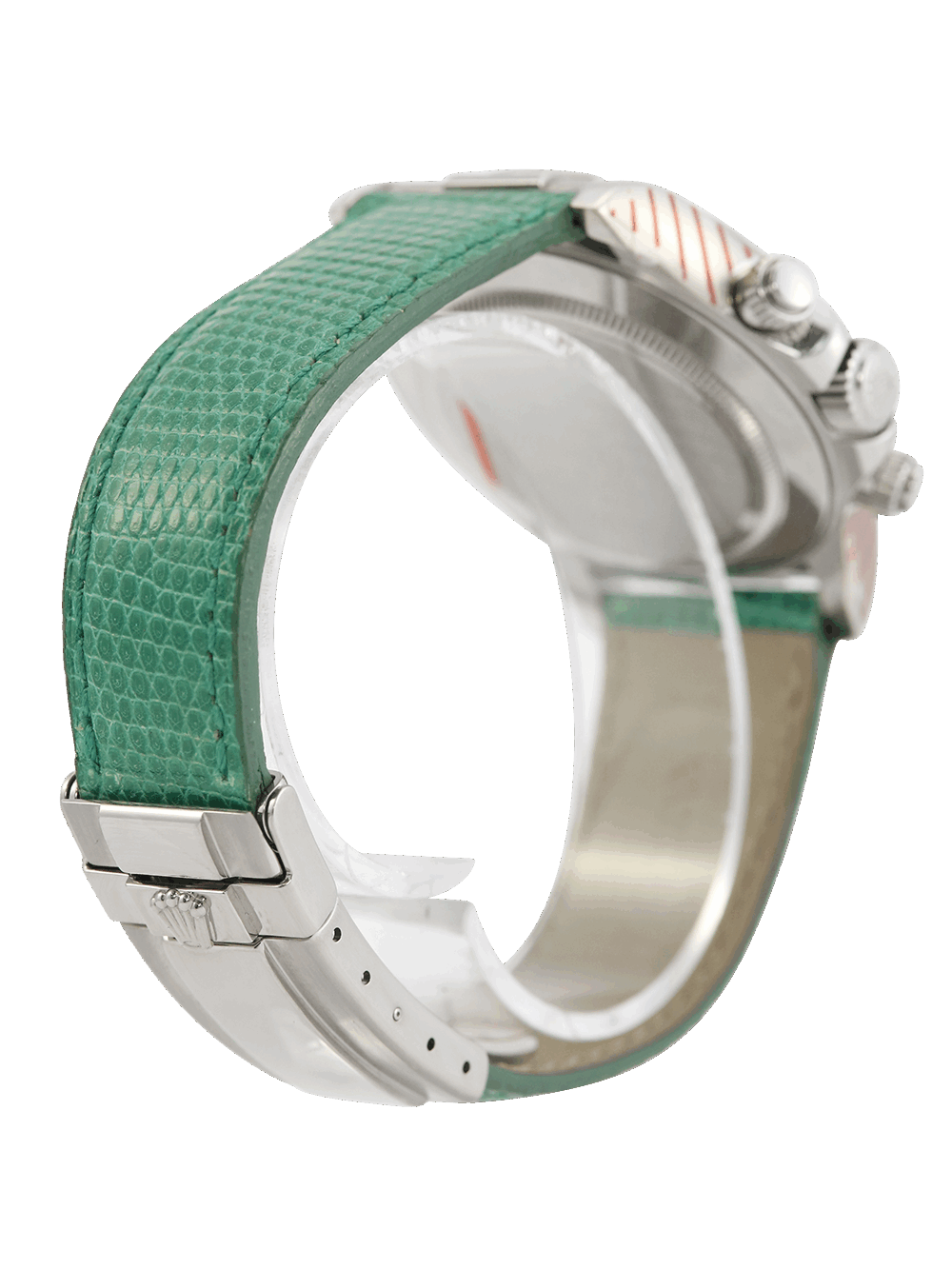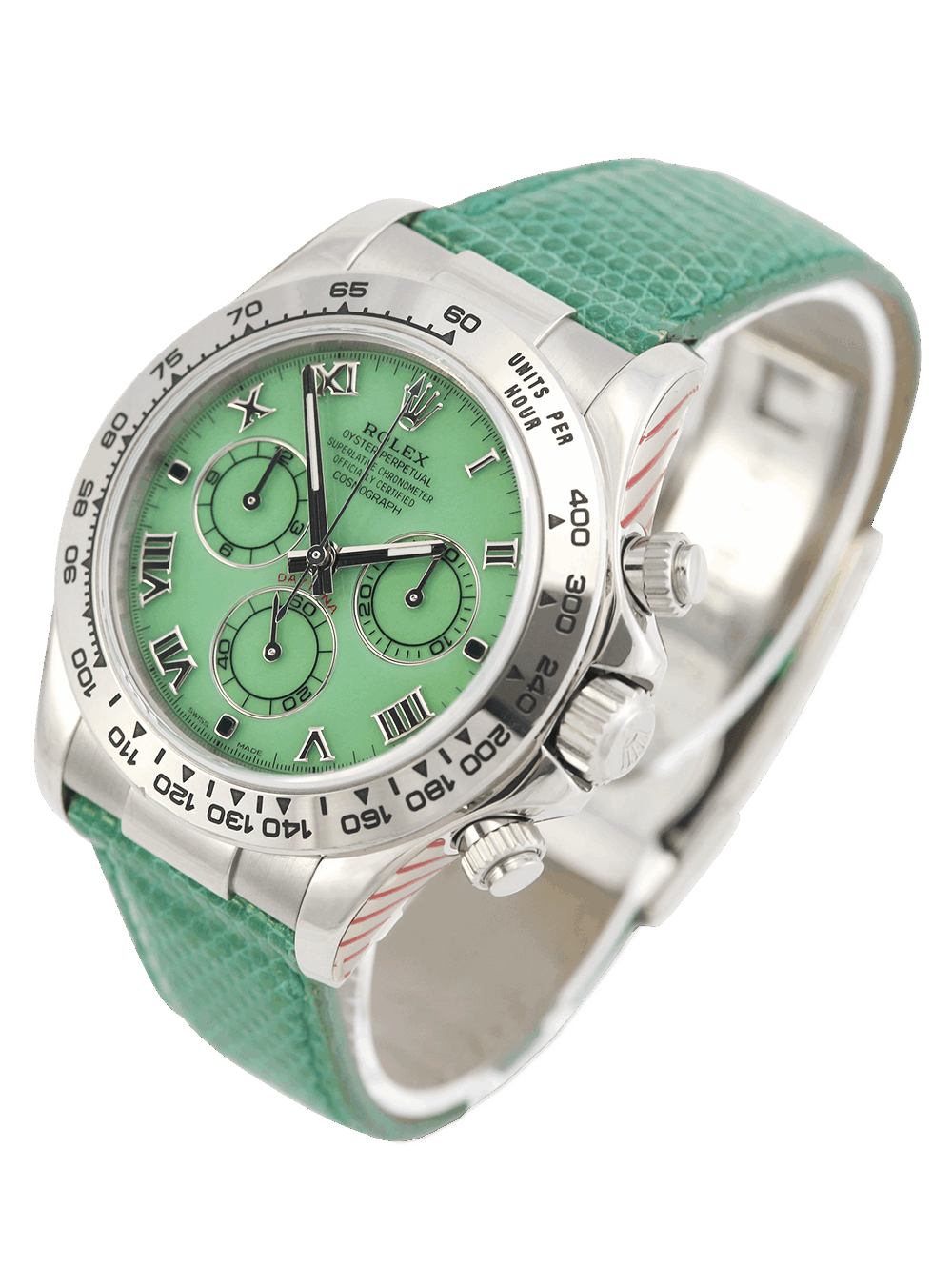 This particular Rolex Daytona with the model reference 116519 is presented on a green lizard skin strap, housing in a 40mm 18K white gold case a green Chrysoprase dial, Roman numeral hour markers, 3 chronograph sub-dials, automatic movement and waterproof to 100m. This watch has a serial: K83XXXX and was produced in circa 2000.
