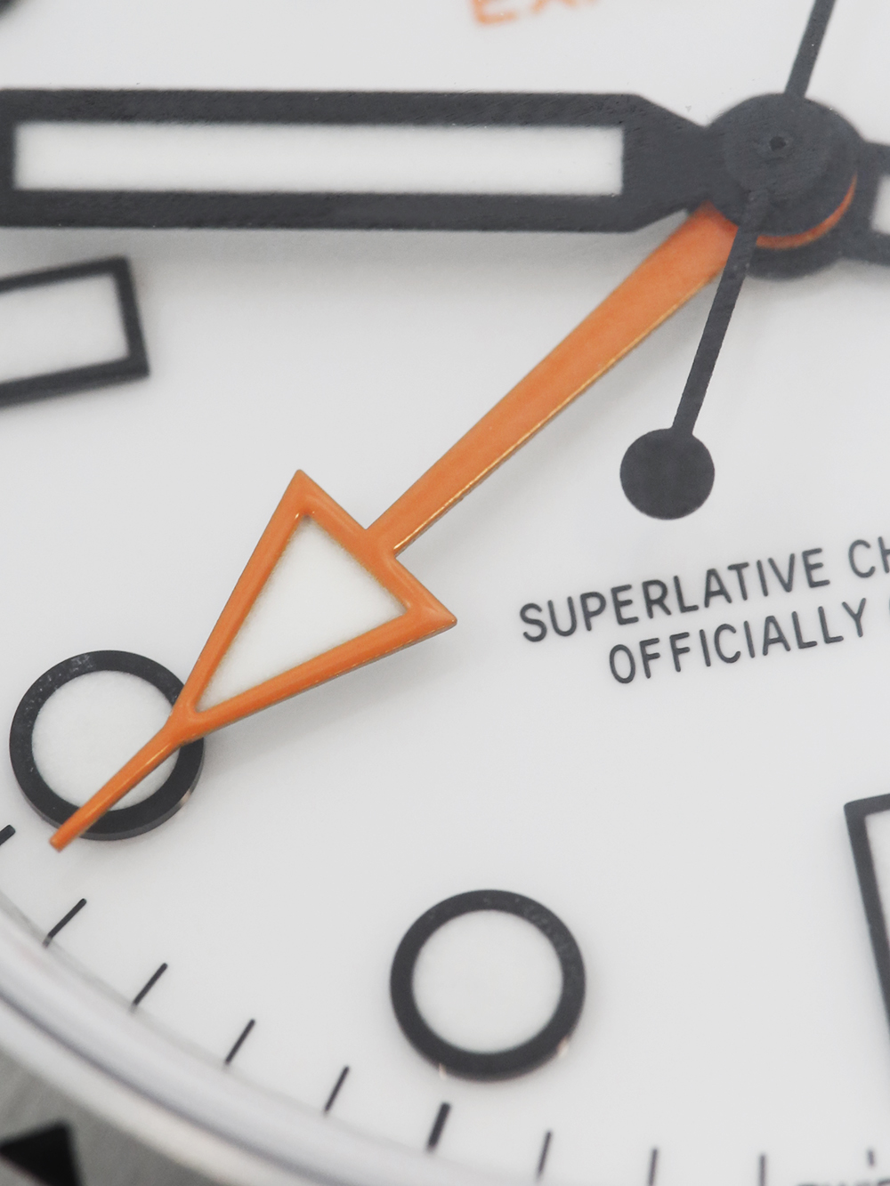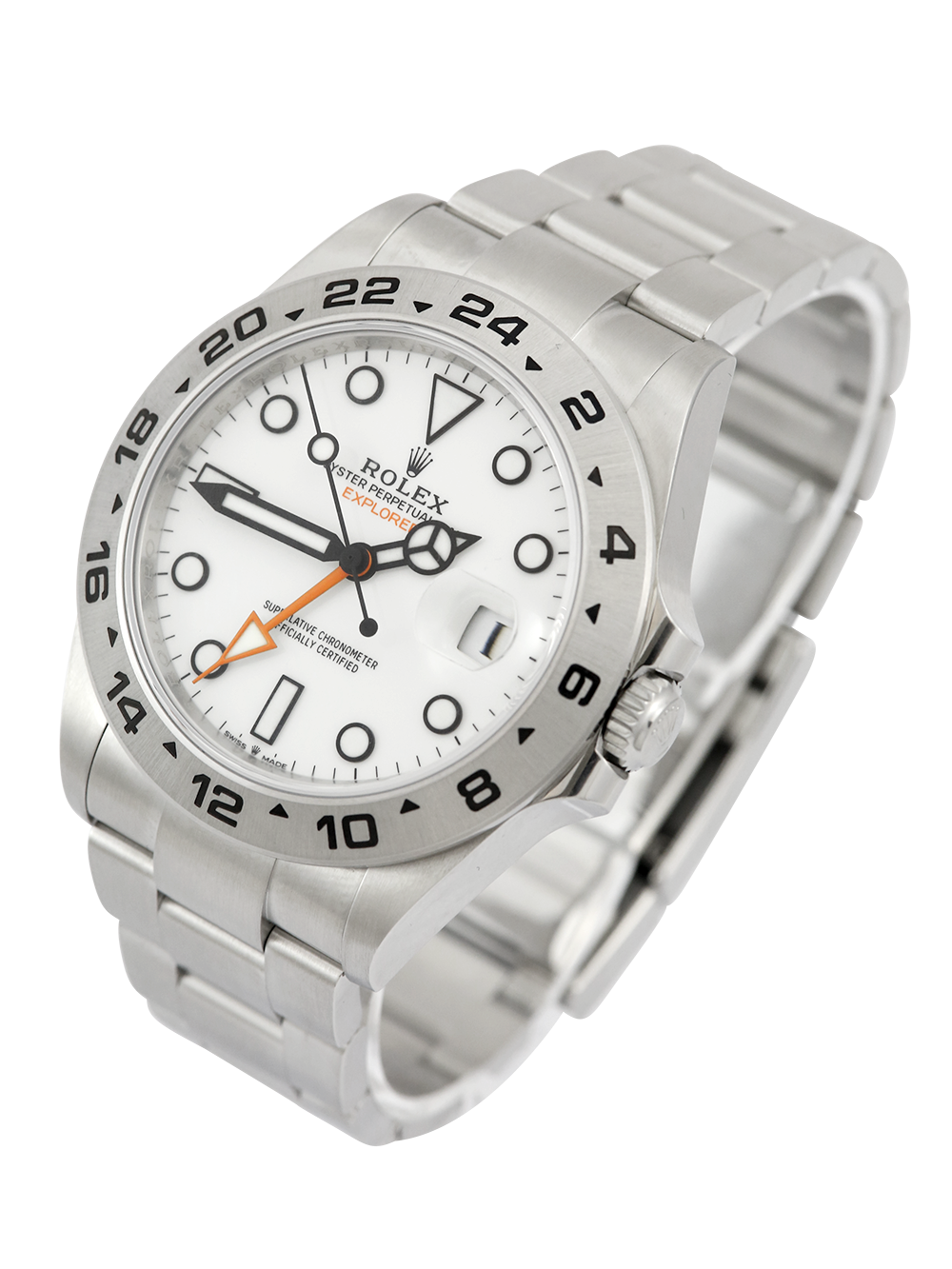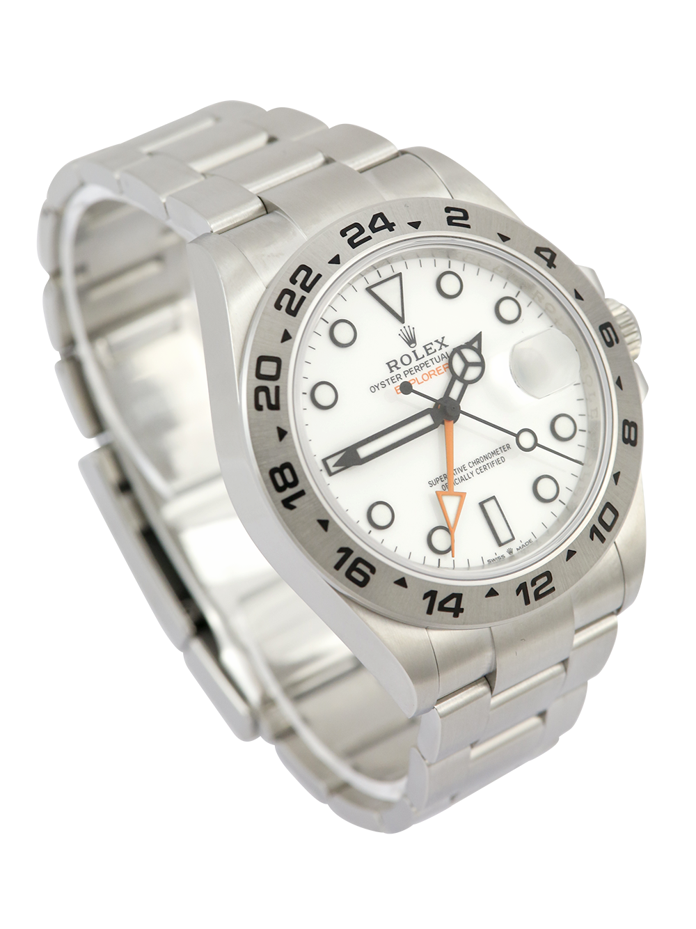 A pre-owned in excellent condition unpolished 42mm case size Oyster Steel superlative chronometer, calibre 3285, automatic movement Rolex Explorer II model reference 226570 featuring a white baton dial housing a date aperture at 3 O’clock and an orange GMT hand which is true to the original Rolex Explorer design. The dial is surrounded by a non-moving 24-hour bezel and the watch comes on a full retail length brushed finish Oyster Steel Rolex Oyster bracelet.