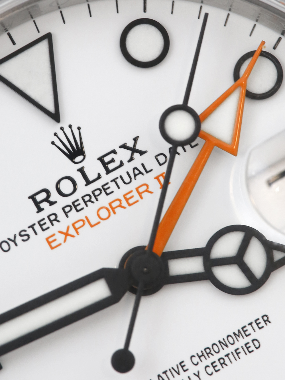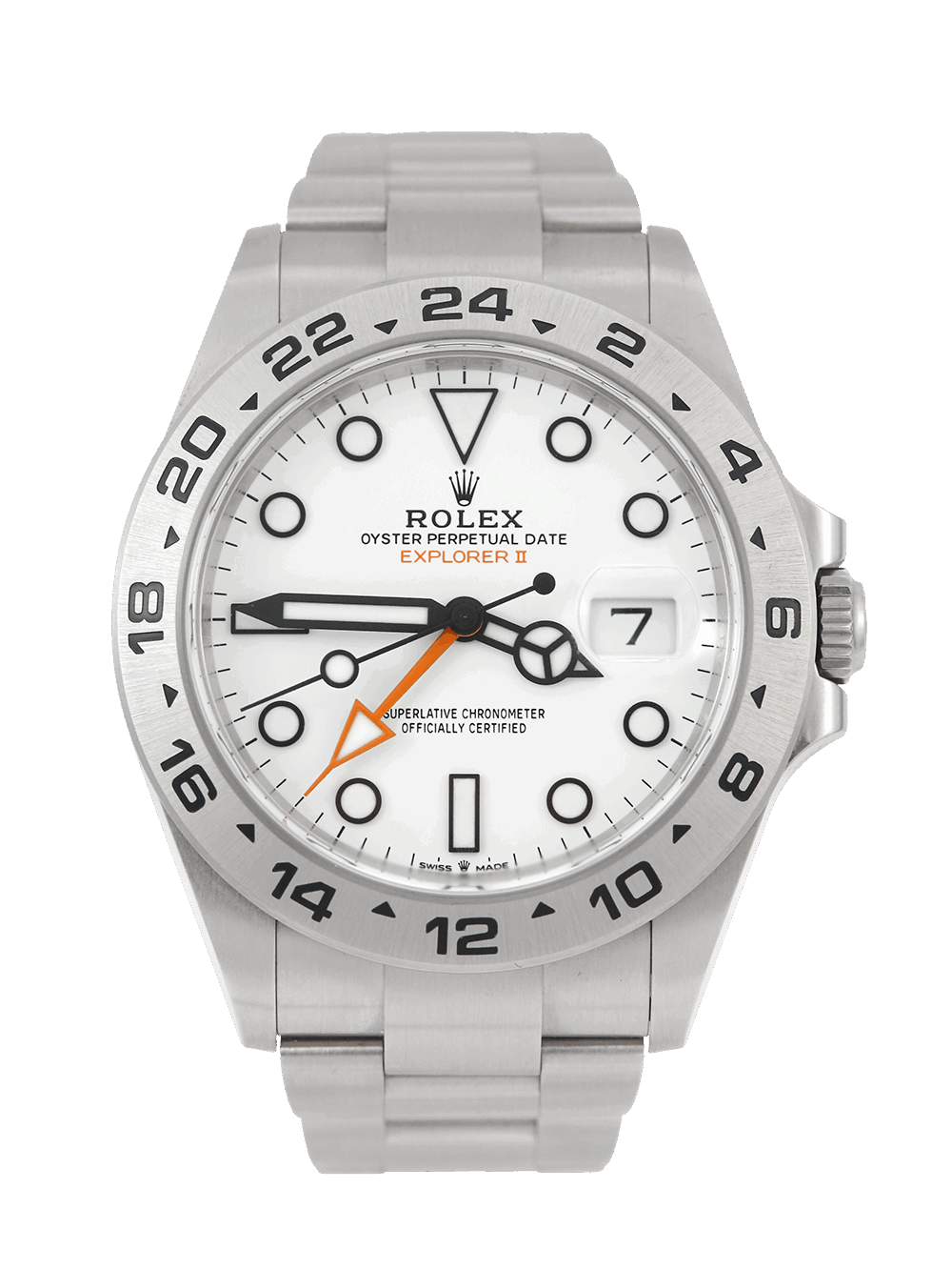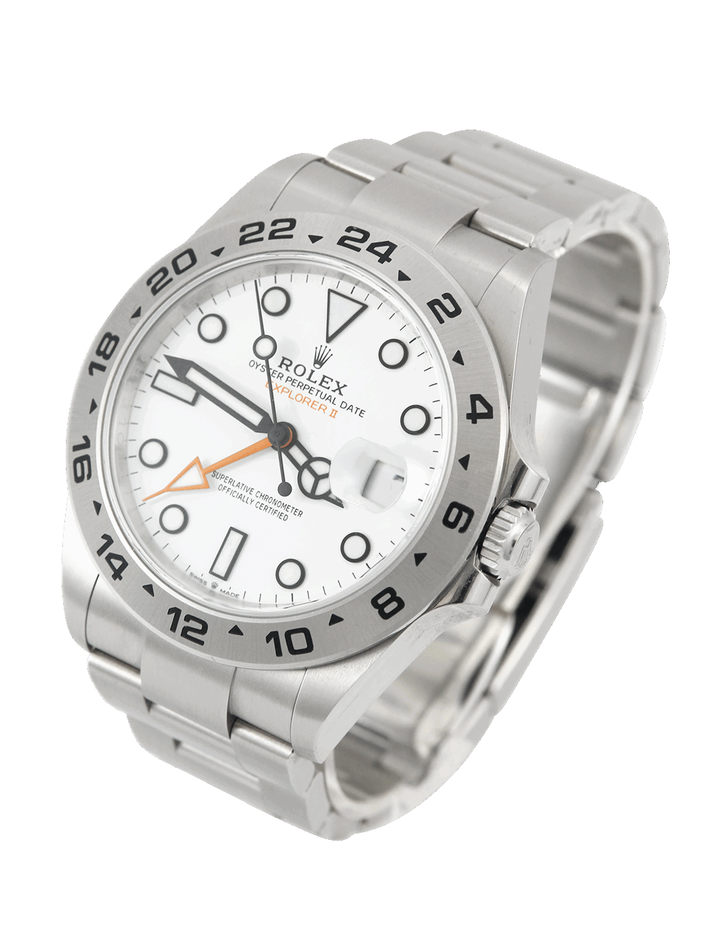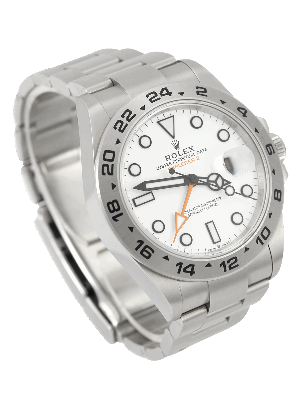 A pre-owned in excellent condition unpolished 42mm case size Oyster Steel superlative chronometer, calibre 3285, automatic movement Rolex Explorer II model reference 226570 featuring a white baton dial housing a date aperture at 3 O’clock and an orange GMT hand which is true to the original Rolex Explorer design. The dial is surrounded by a non-moving 24-hour bezel and the watch comes on a full retail length brushed finish Oyster Steel Rolex Oyster bracelet.