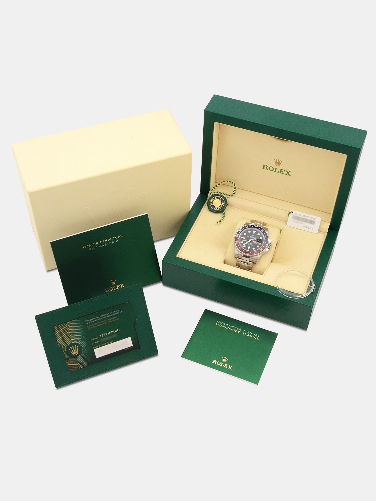 This particular watch is supplied as shown in the detailed images with both of the original inner and outer Rolex boxes, the two original Rolex swing tags, the two original Rolex manuals, the original Rolex warranty card holder and the original Rolex warranty card. The card is dated July 2022 when the watch was first supplied new by an authorised dealer.