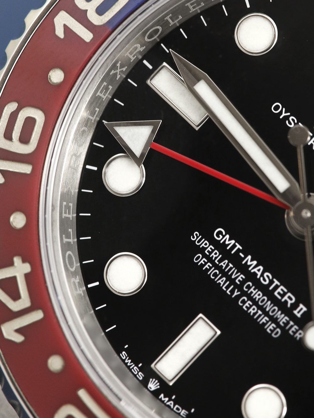 A pre-owned in pristine condition superlative chronometer-certified, automatic movement Rolex GMT-Master II model reference 126710BLRO. Featuring a 40mm stainless steel case, housing a black dial with luminous hour markers, a red GMT hand, and a date aperture at 3 o’clock. The dial is surrounded by a rotating stainless steel bezel with a ceramic red and blue GMT “Pepsi” bezel insert. Supplied on a full retail length Rolex Oyster bracelet, completed by an Oysterlock folding clasp.