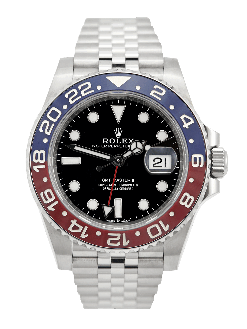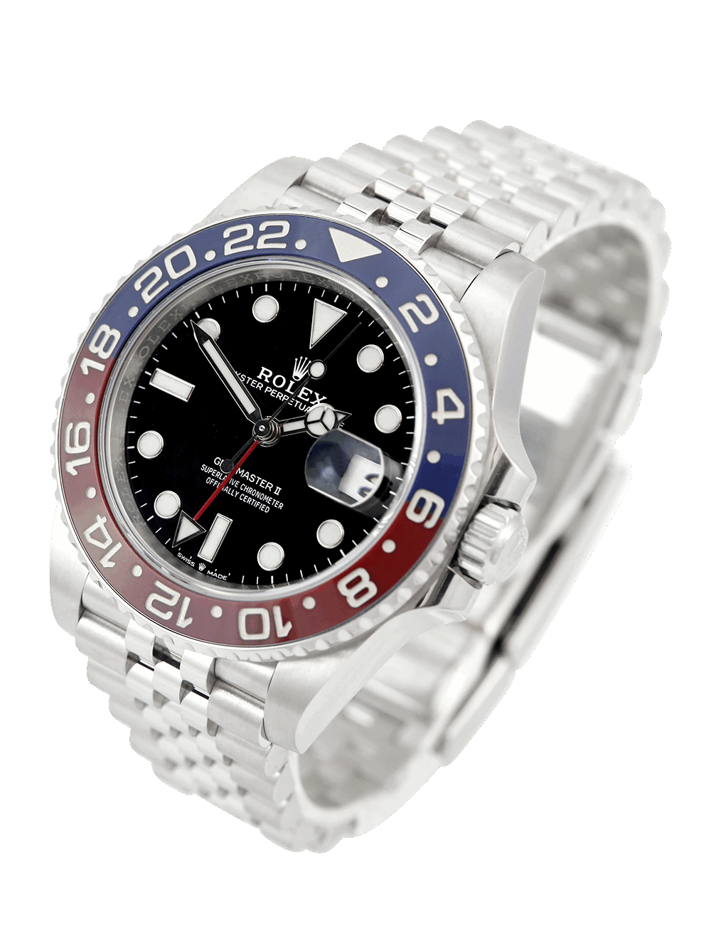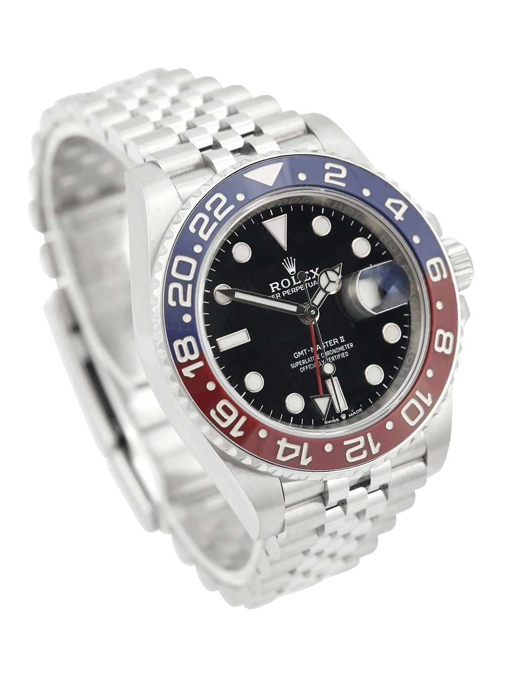 A pre-owned in pristine condition superlative chronometer-certified, automatic movement Rolex GMT-Master II model reference 126710BLRO. Featuring a 40mm stainless steel case, housing a black dial with luminous hour markers, a red GMT hand, and a date aperture at 3 o’clock. The dial is surrounded by a rotating stainless steel bezel with a ceramic red and blue GMT “Pepsi” bezel insert. Supplied on a full retail length Rolex Jubilee bracelet, completed by an Oysterlock folding clasp.