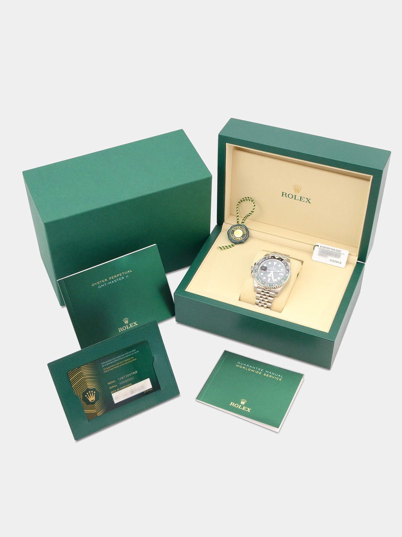 This watch is supplied as shown in the images with the original Rolex inner and outer boxes, the two original Rolex swing tags, the two original Rolex booklets, the original Rolex warranty card holder and the original Rolex warranty card. The card is dated November 2025 when the watch was first supplied new by the UK based authorised dealer.