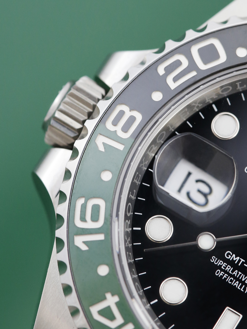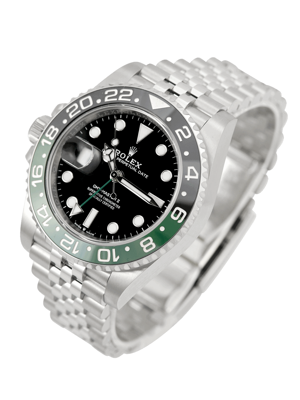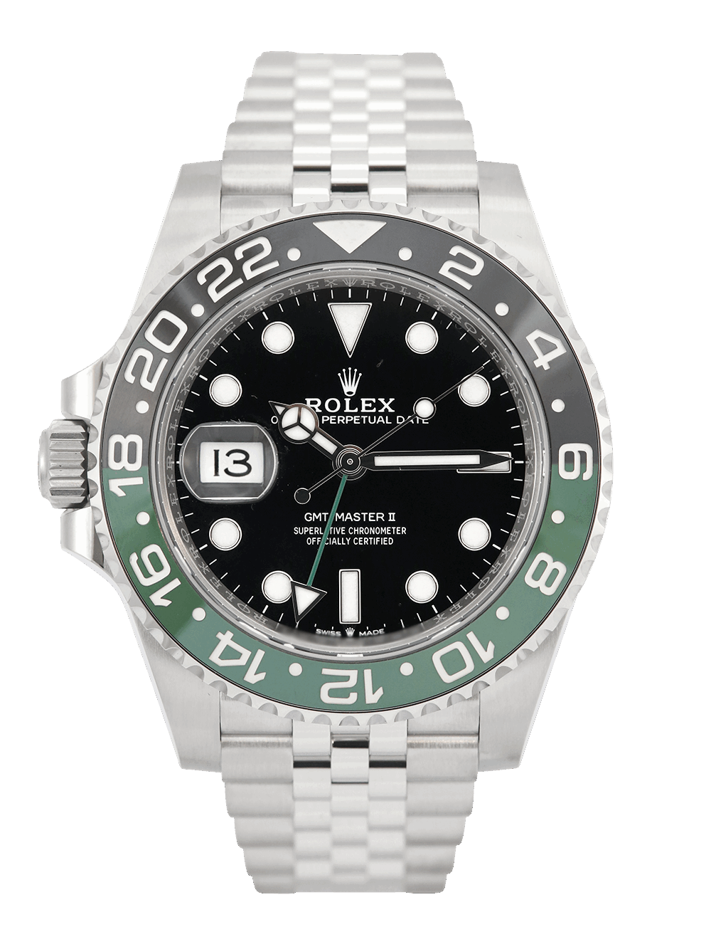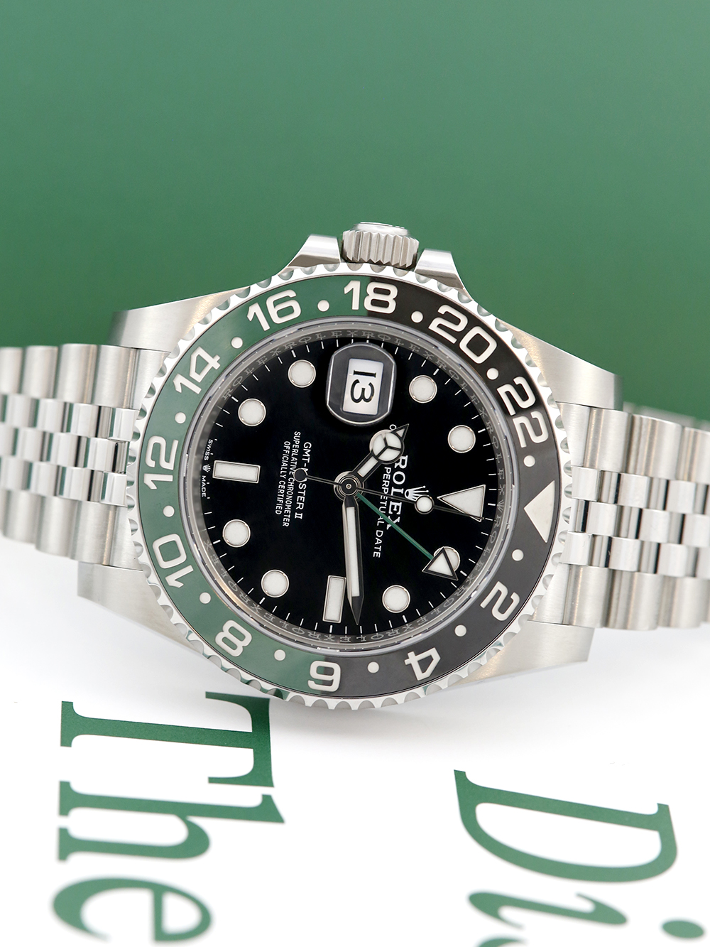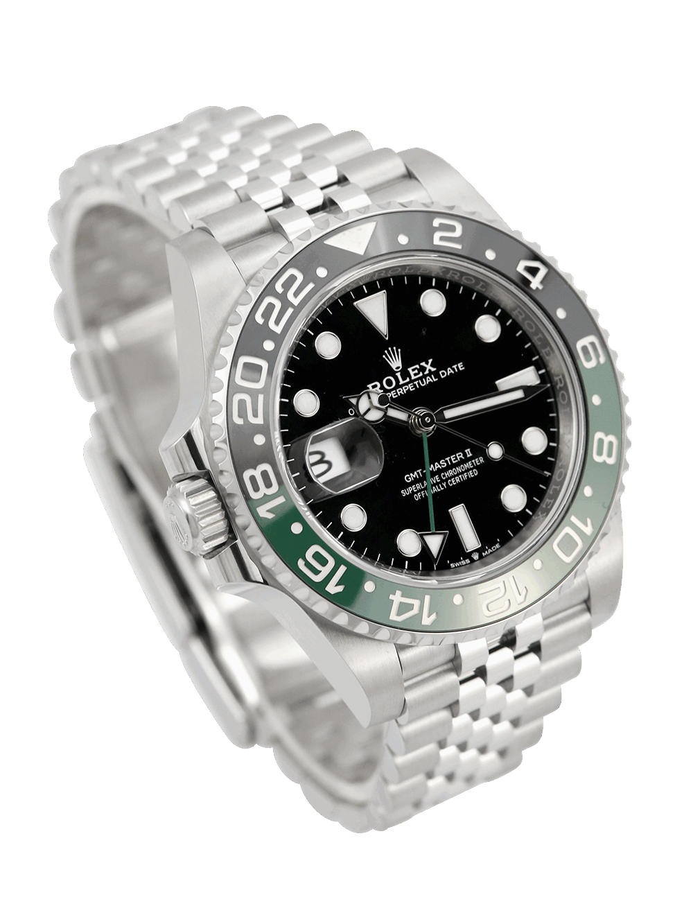 We are delighted to offer for sale this unworn, unsized and brand new 40mm case size Oystersteel superlative chronometer, calibre 3285, automatic movement Rolex GMT Master II model reference 126720VTNR featuring a black baton dial surrounded by a black and green ceramic 24-hour ‘Sprite’ bezel on a full retail length Oystersteel Rolex Jubilee bracelet.