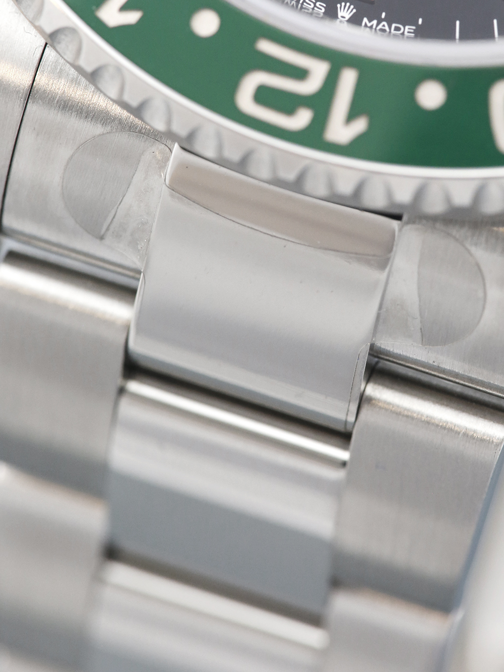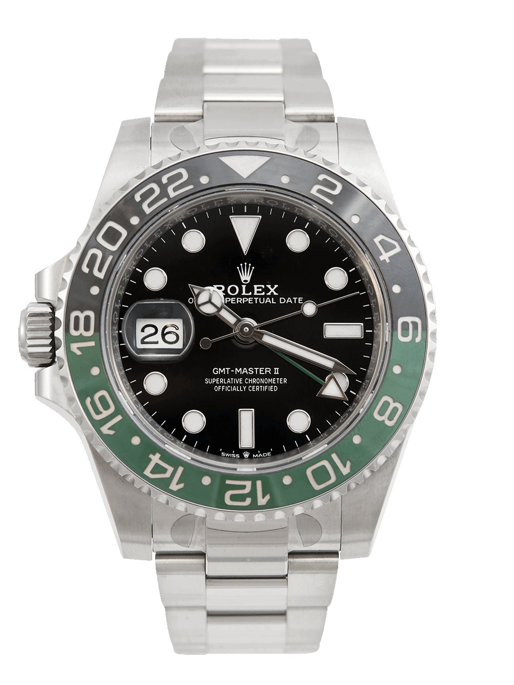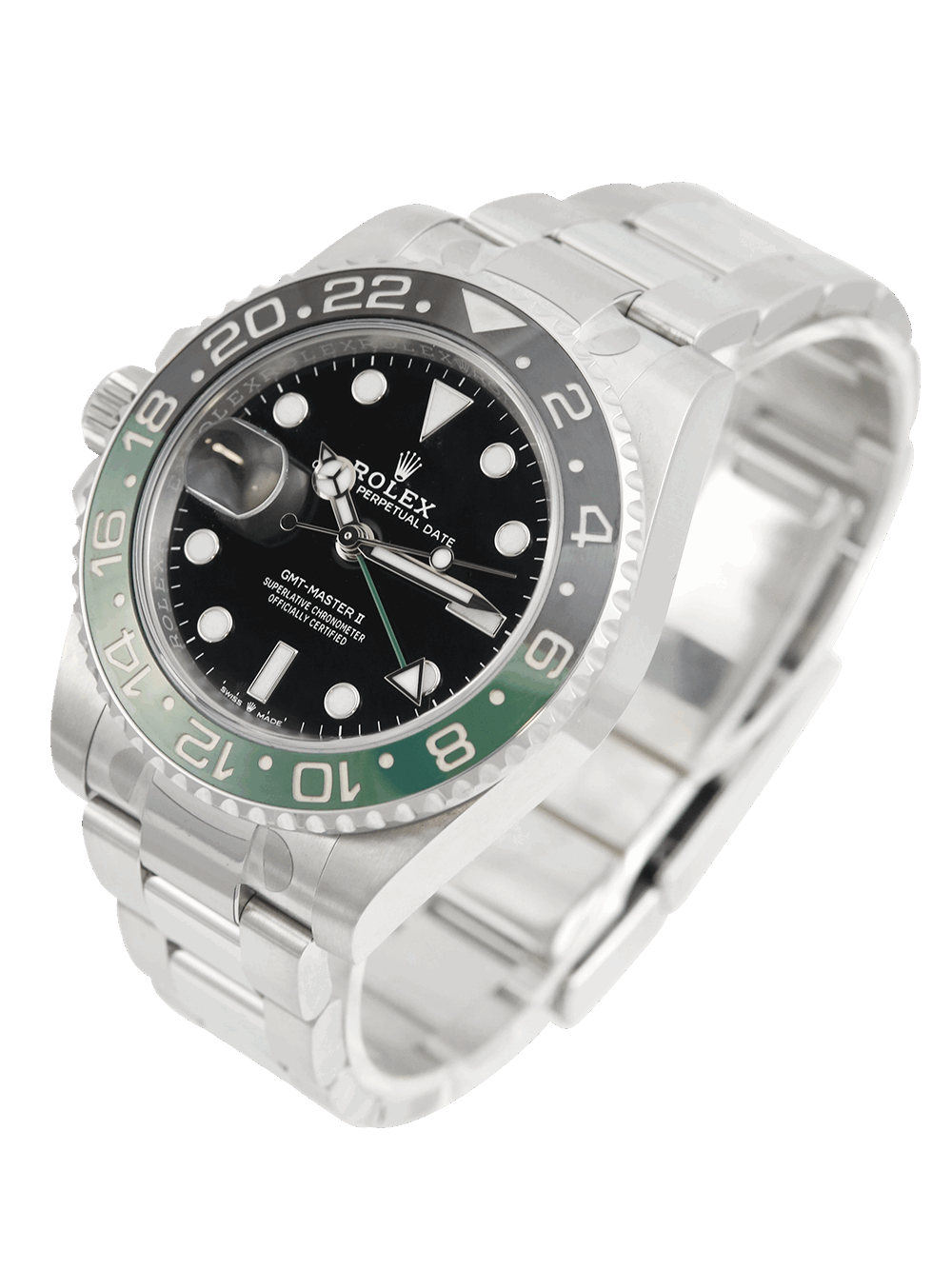 A preowned in excellent condition and perfect working order a 40mm case size Oystersteel superlative chronometer, calibre 3285, automatic movement Rolex GMT Master II model reference 126720VTNR featuring a black baton dial surrounded by a black and green ceramic 24-hour ‘Sprite’ bezel on a full retail length Oystersteel Rolex Oyster bracelet with brushed finished outer links and polished finish centre links.