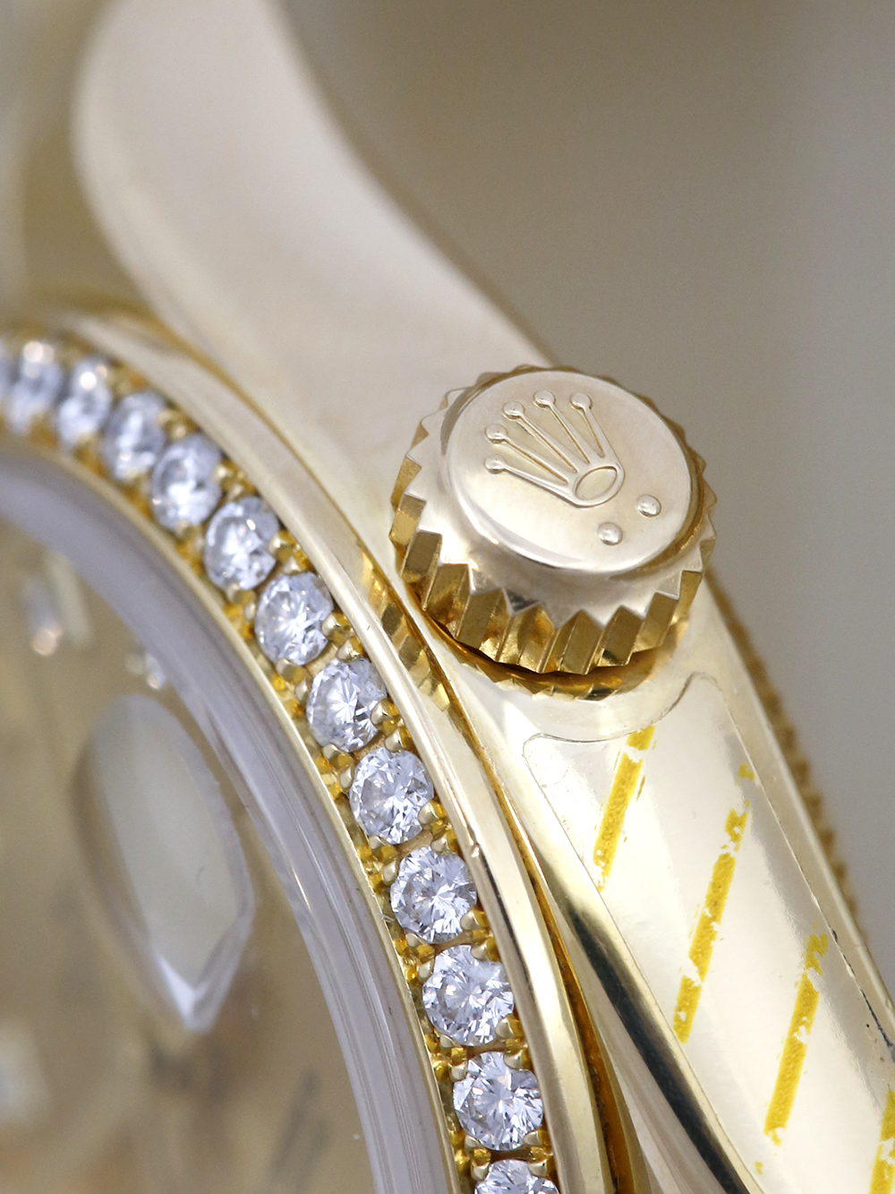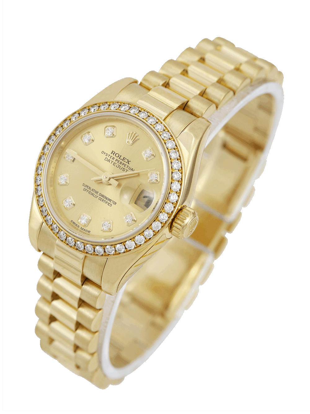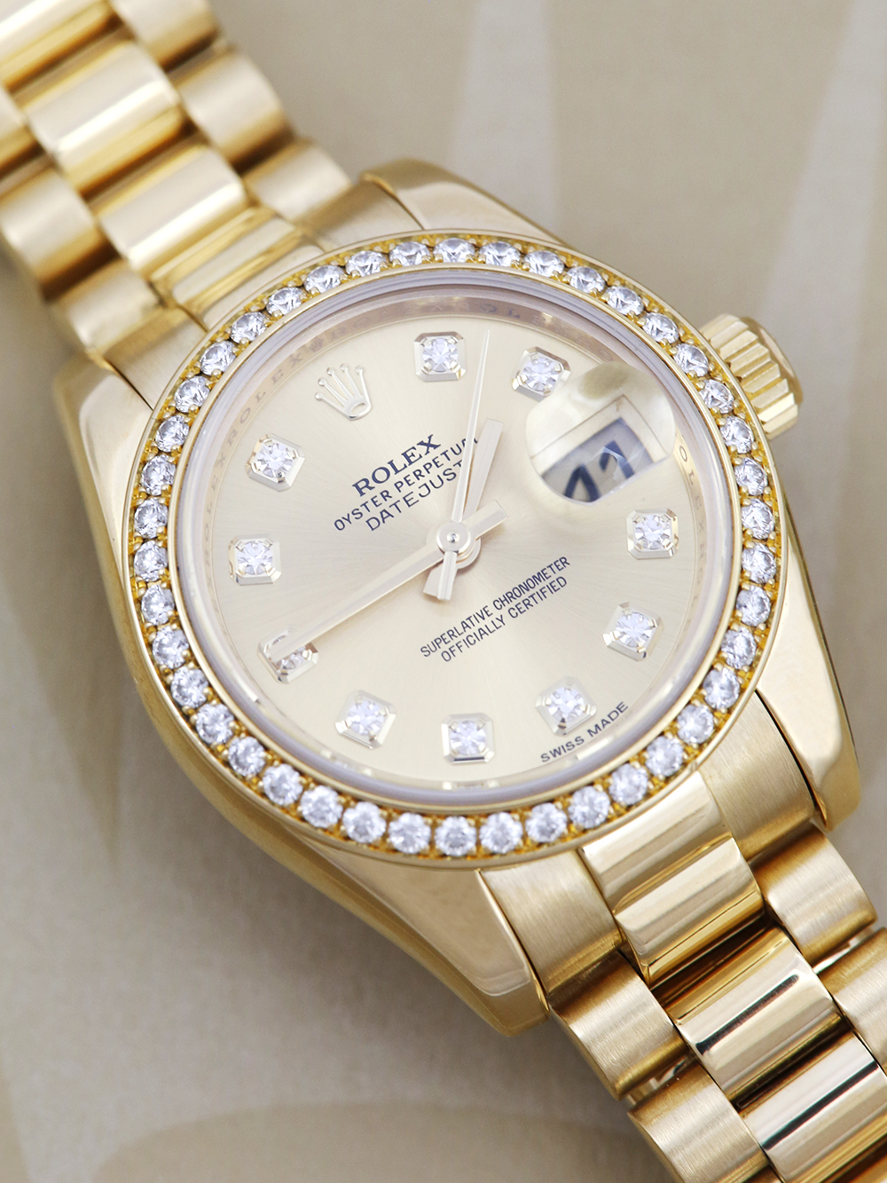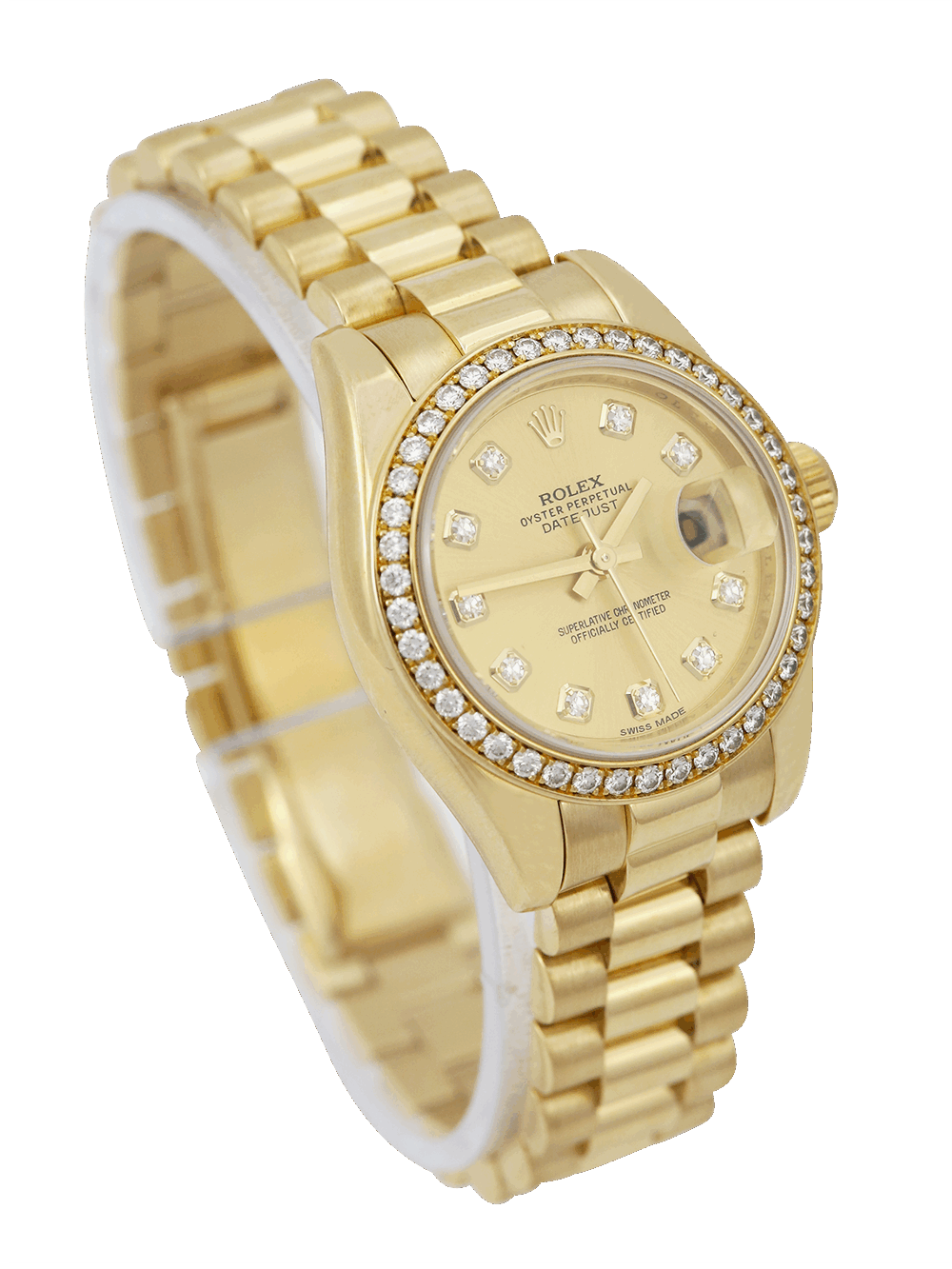 An excellent condition pre-owned 26mm case size yellow gold superlative chronometer, calibre 2235, automatic movement Rolex Datejust 26 model reference 179138 featuring a champagne diamond dot dial housing a date aperture at 3 O’clock surrounded by a yellow gold factory set diamond bezel on a full retail length yellow gold Rolex President bracelet.