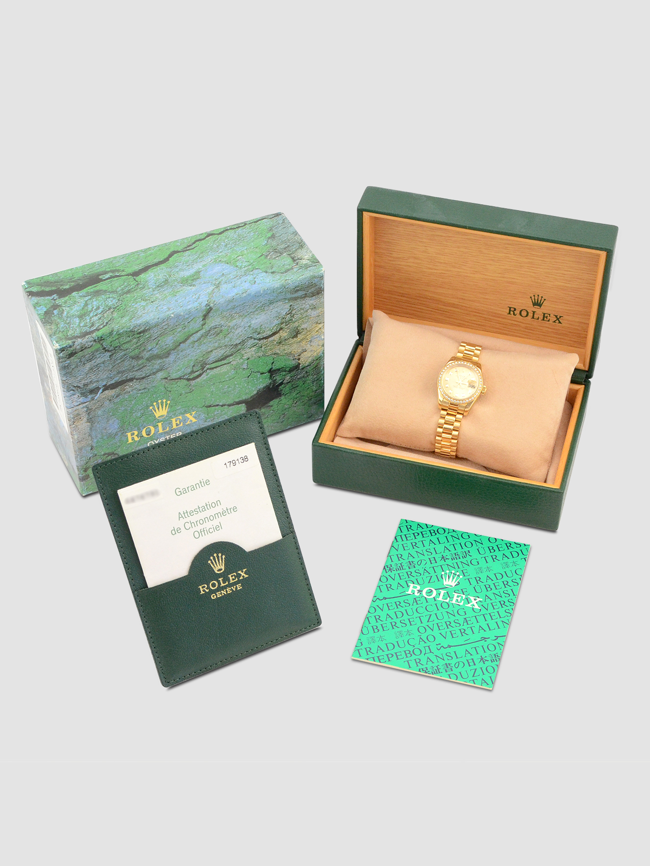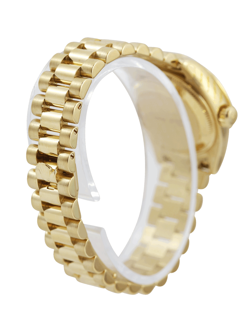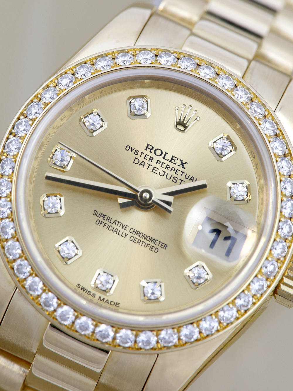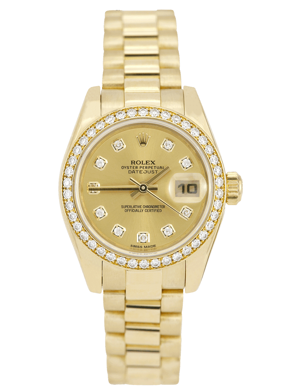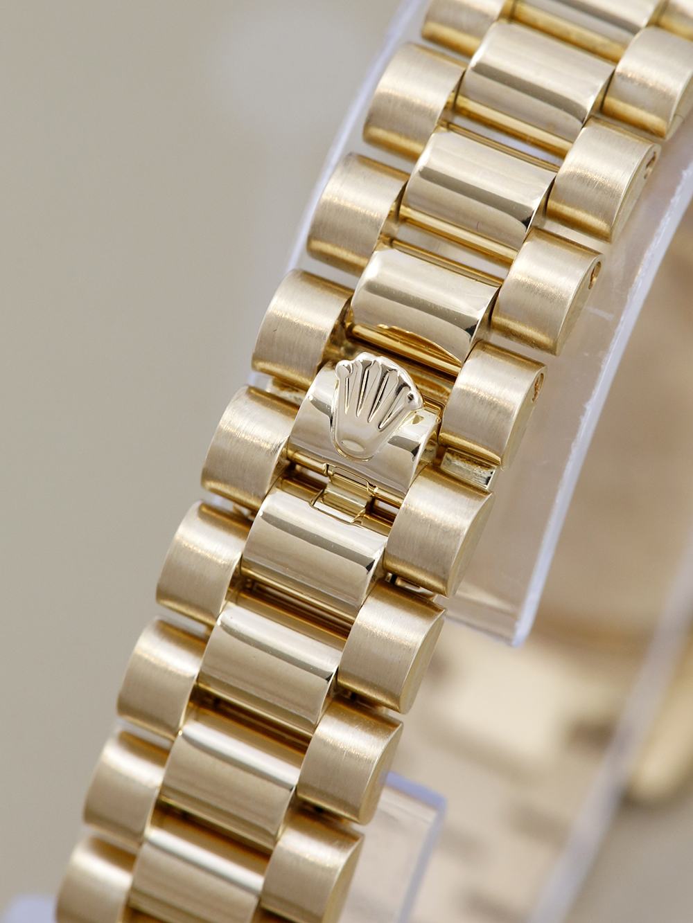 An excellent condition pre-owned 26mm case size yellow gold superlative chronometer, calibre 2235, automatic movement Rolex Datejust 26 model reference 179138 featuring a champagne diamond dot dial housing a date aperture at 3 O’clock surrounded by a yellow gold factory set diamond bezel on a full retail length yellow gold Rolex President bracelet.