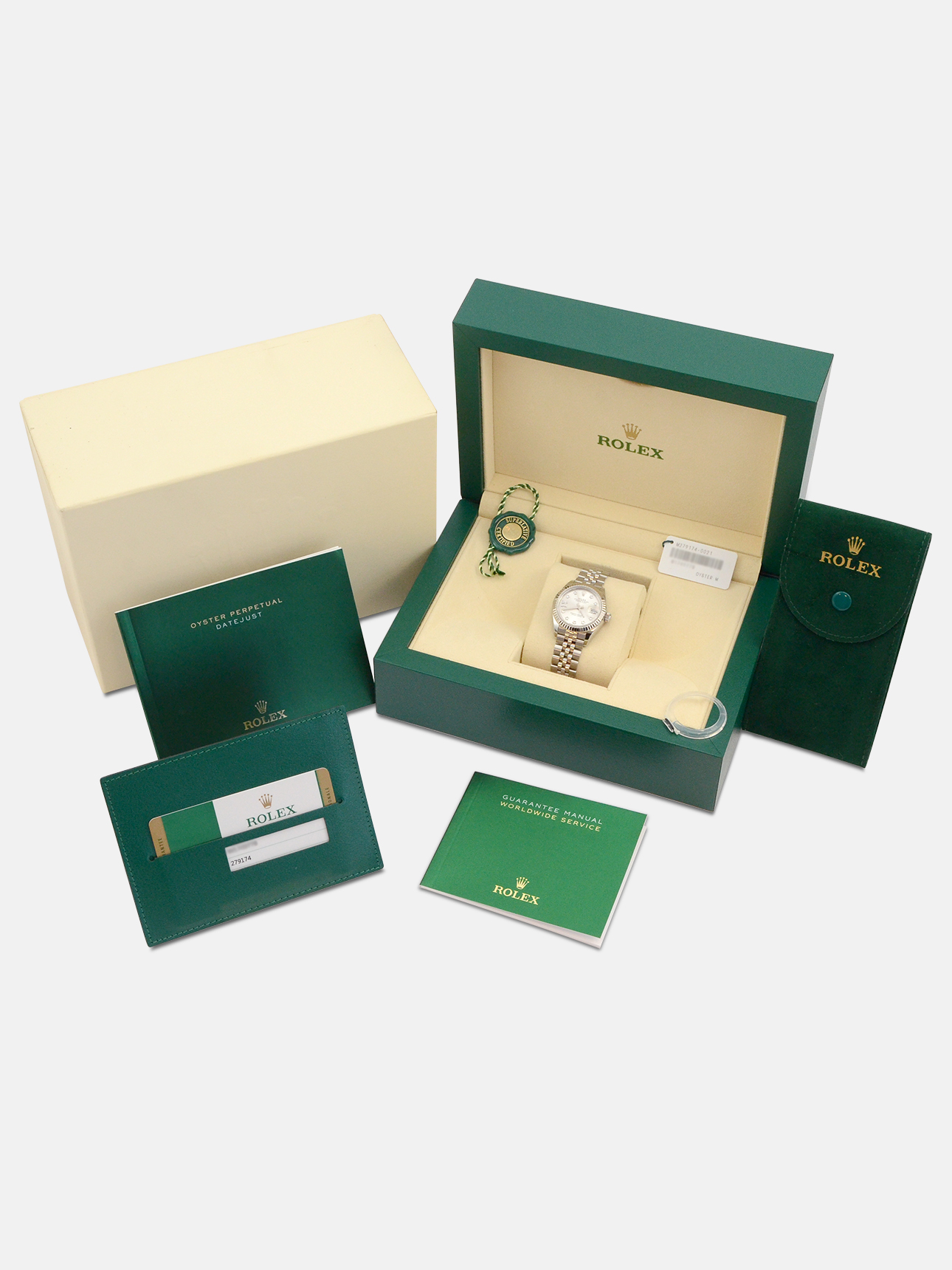This particular watch is supplied as shown in the detailed images with both of the original Rolex inner and outer boxes, two original Rolex booklets, two original Rolex swing tags, the original Rolex warranty card holder and the original new style Rolex warranty card which is dated November 2018 when the watch was first purchased new from a UK based authorised dealer.