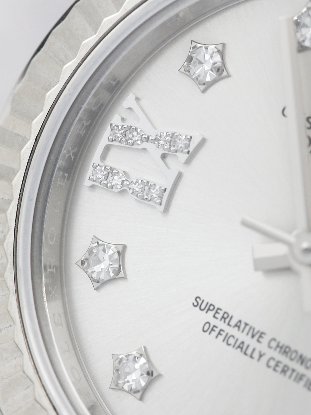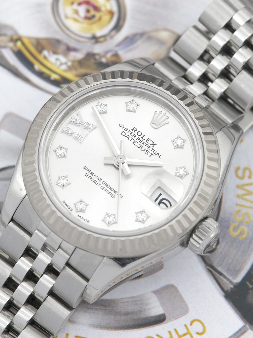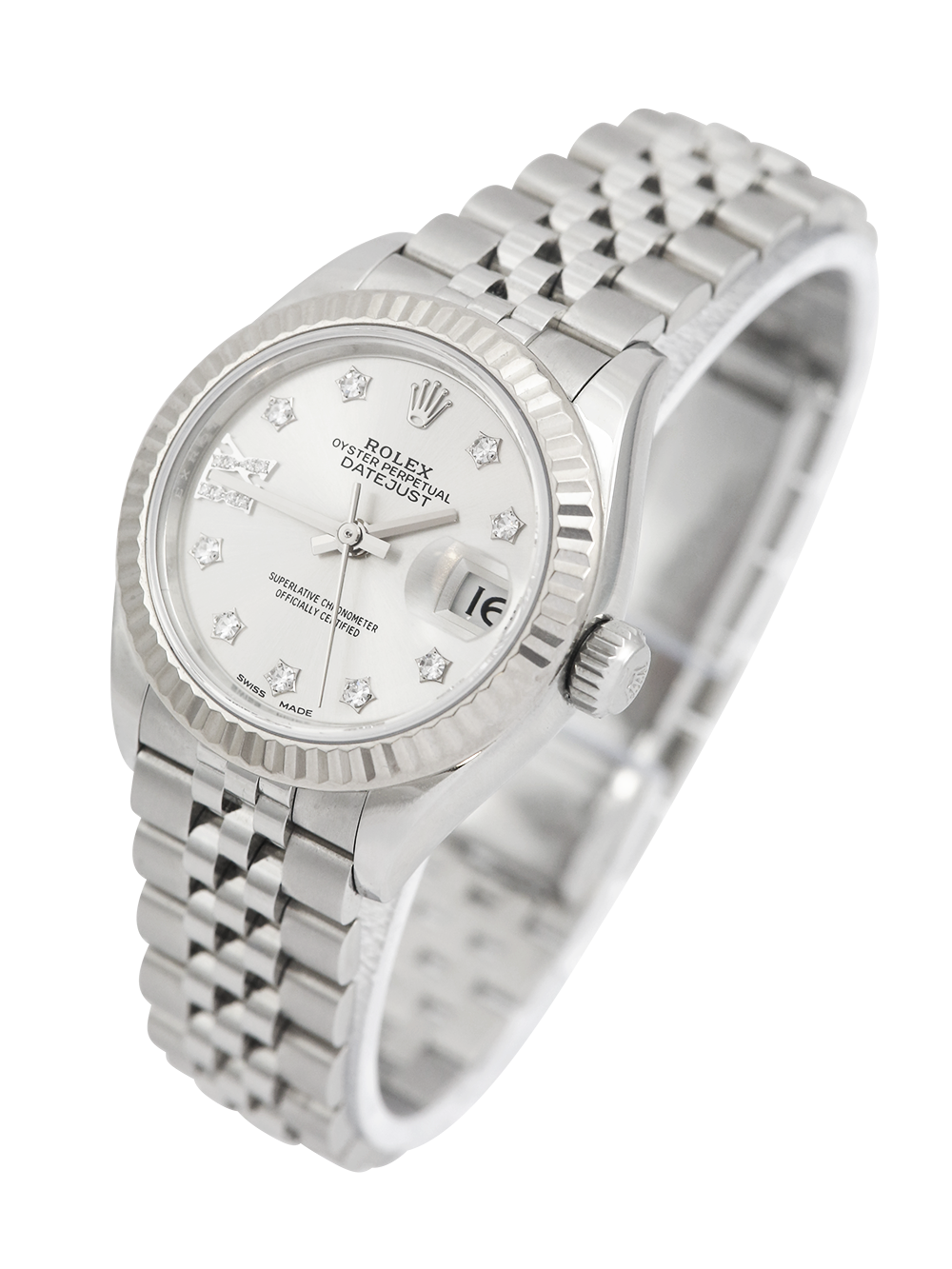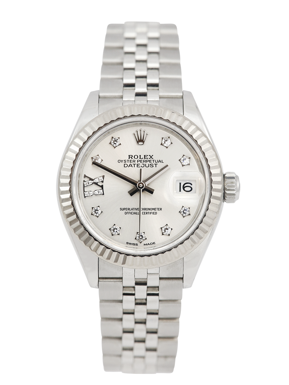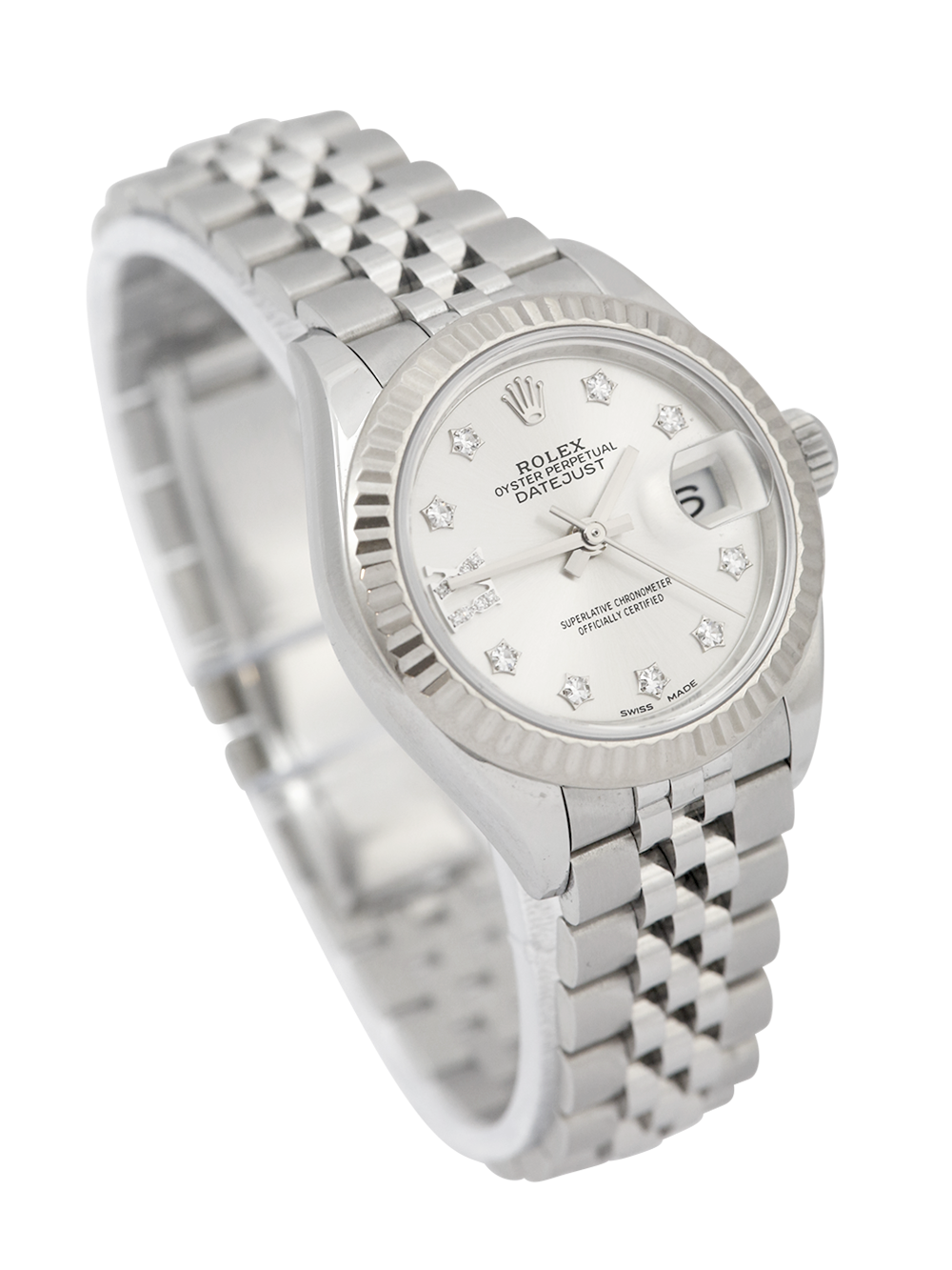 A previously owned, serviced by Rolex and unworn since (rear case service sticker still intact) a stainless steel 28mm case size chronometer certified automatic movement Rolex Datejust Lady model reference 279174 featuring a silver diamond dot dial housing a date aperture at 3 O’clock surrounded by a white gold fluted bezel on a full retail length stainless steel Rolex Jubliee bracelet.