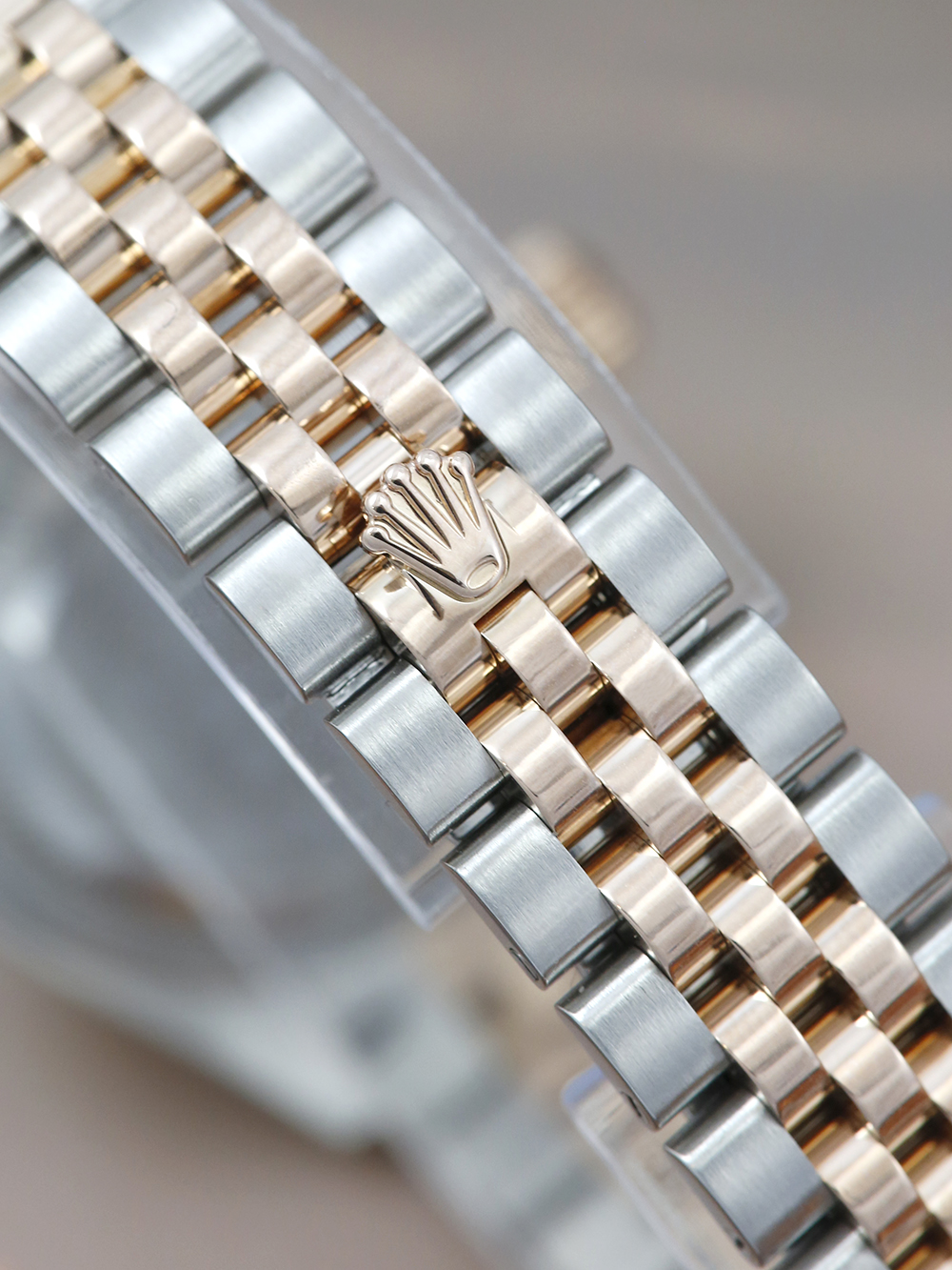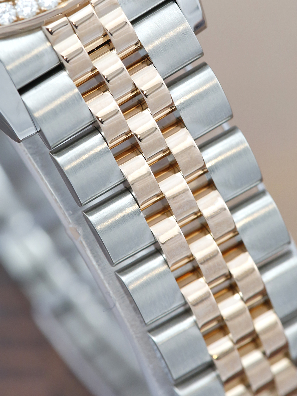 An excellent condition pre-owned unworn stainless steel and rose gold chronometer certified automatic movement 28mm case size Rolex Lady Datejust model reference 279381RBR featuring a chocolate diamond dot dial housing a date aperture at 3 O’clock surrounded by a factory set rose gold diamond bezel on a full retail length stainless steel and rose gold Rolex Jubilee bracelet.