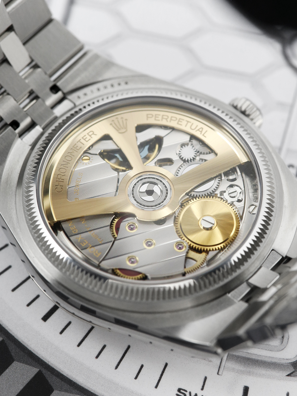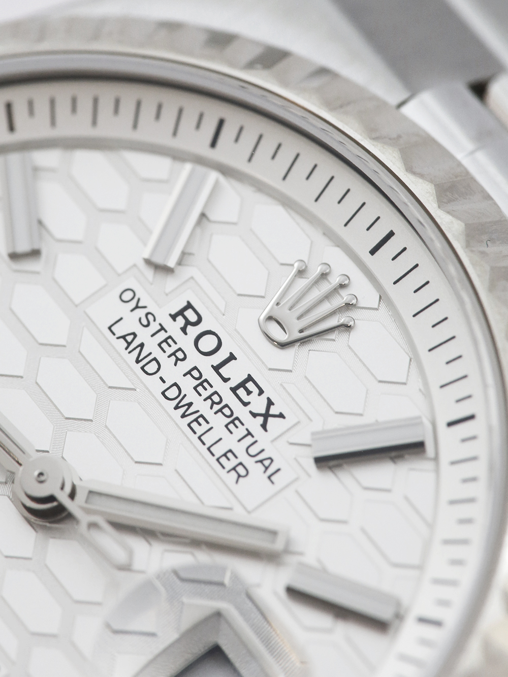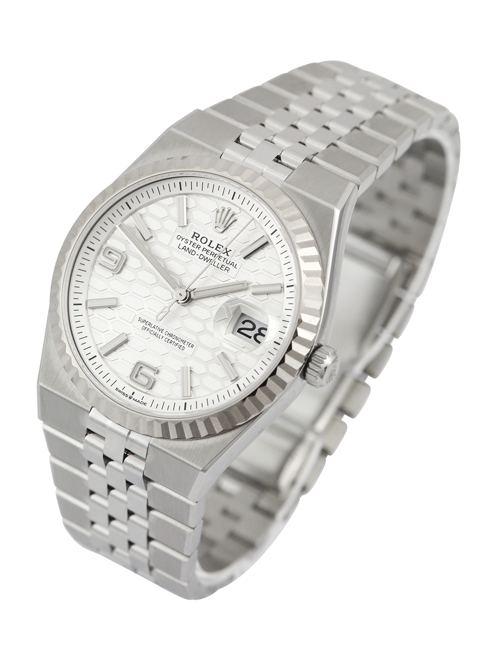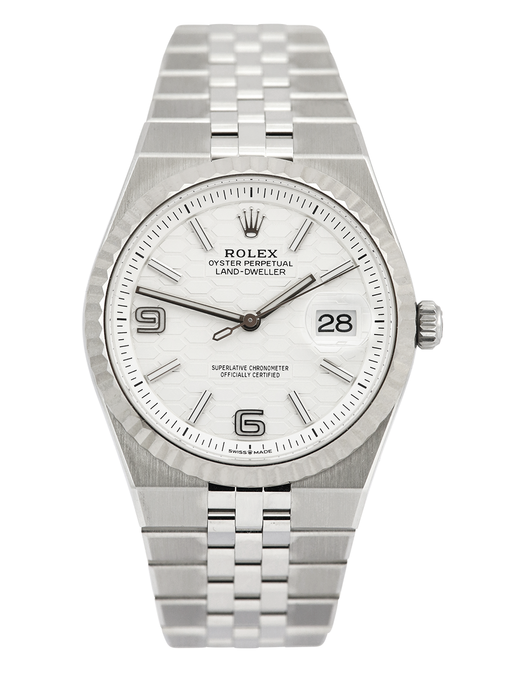 A brand new unworn, unsized Rolex Land-Dweller model reference 127234, a stainless steel 36mm case powered by a calibre 7135 automatic movement, an intense white honeycombe motif dial with Chromalight display and the luminescent open numerals and index hour markers with a date aperture at 3 o’clock, presented on a full retail length flat Jubilee bracelet with a concealed folding clasp.