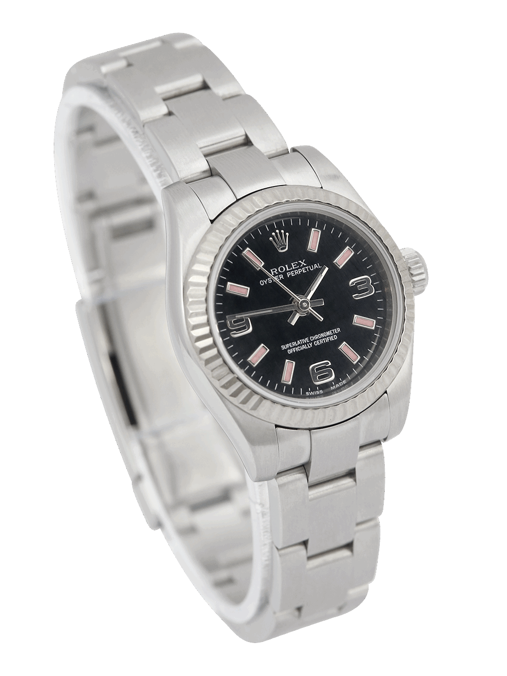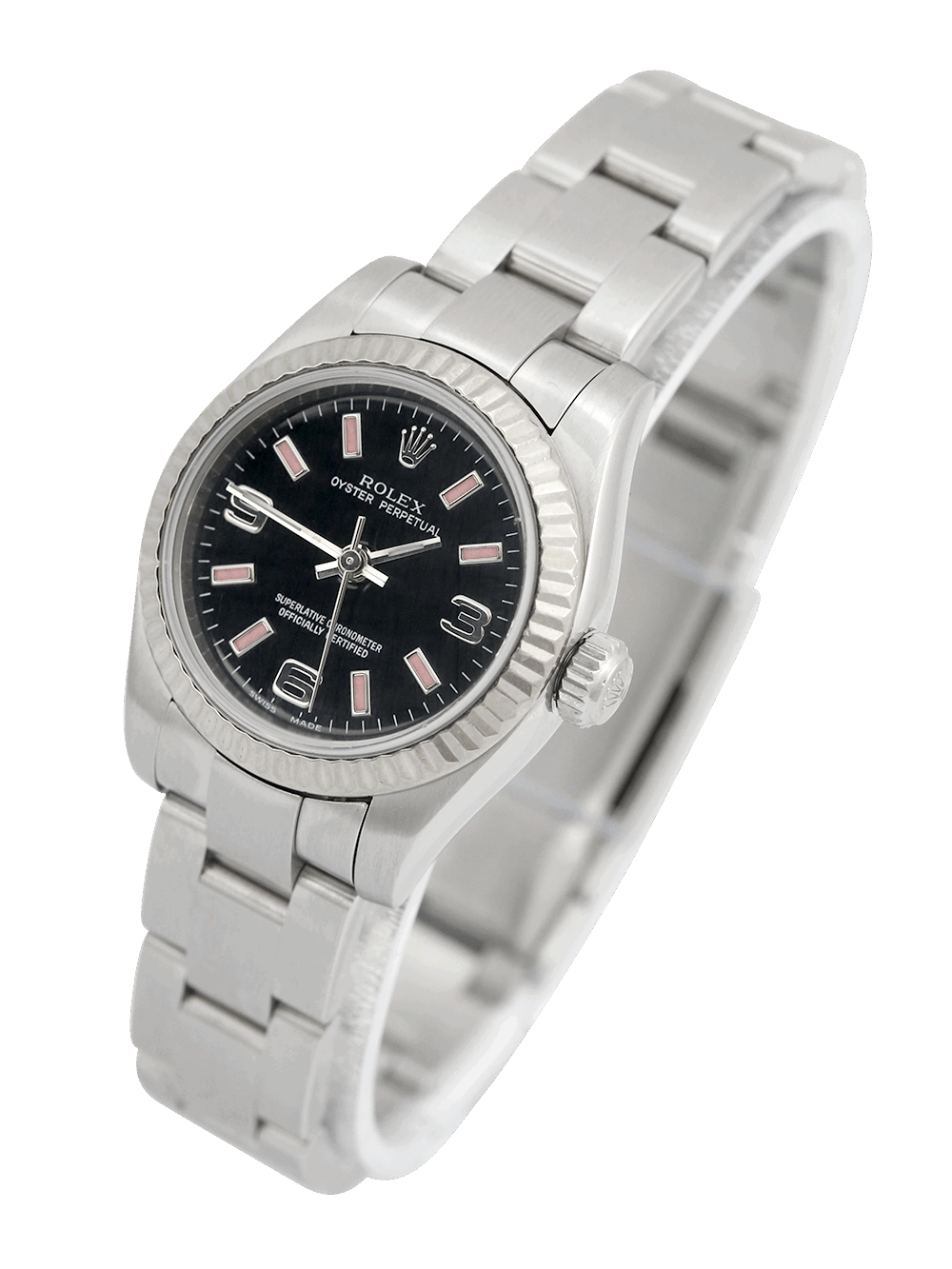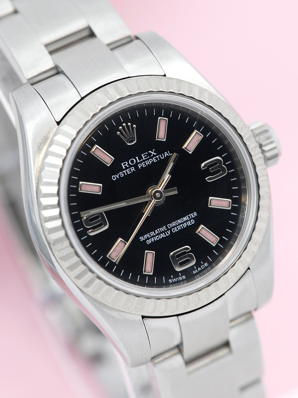 A one previous owner pre-owned stainless steel 26mm case size chronometer certified automatic movement Rolex Datejust Lady model reference 176234. Featuring a desirable black dial with pink baton hour markers and stainless steel numerals at 3/6/9 which is surrounded by a white gold fluted bezel. All presented on a full retail length stainless steel Rolex Oyster bracelet with a folding clasp.