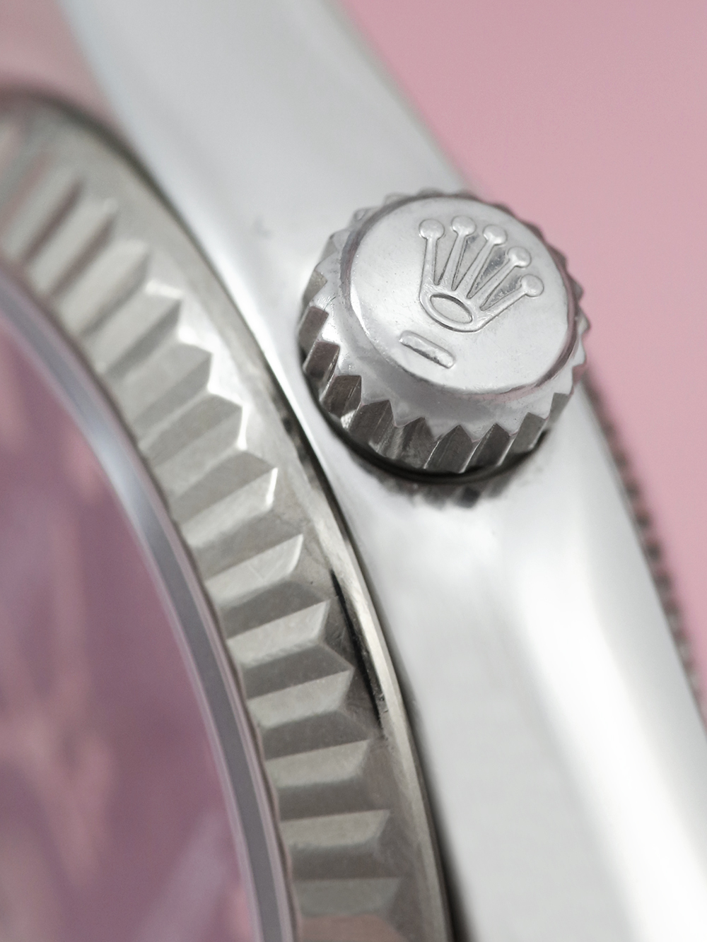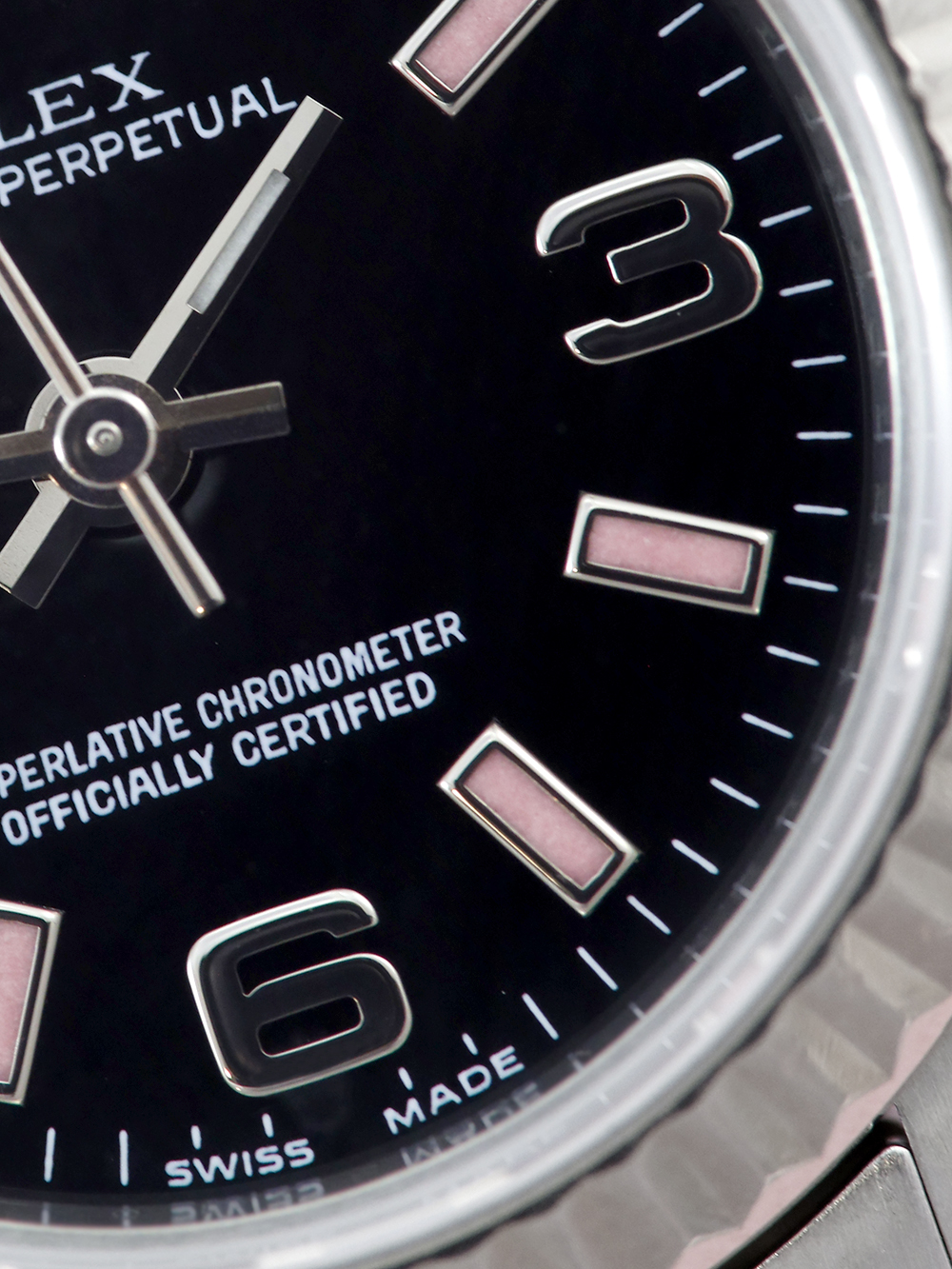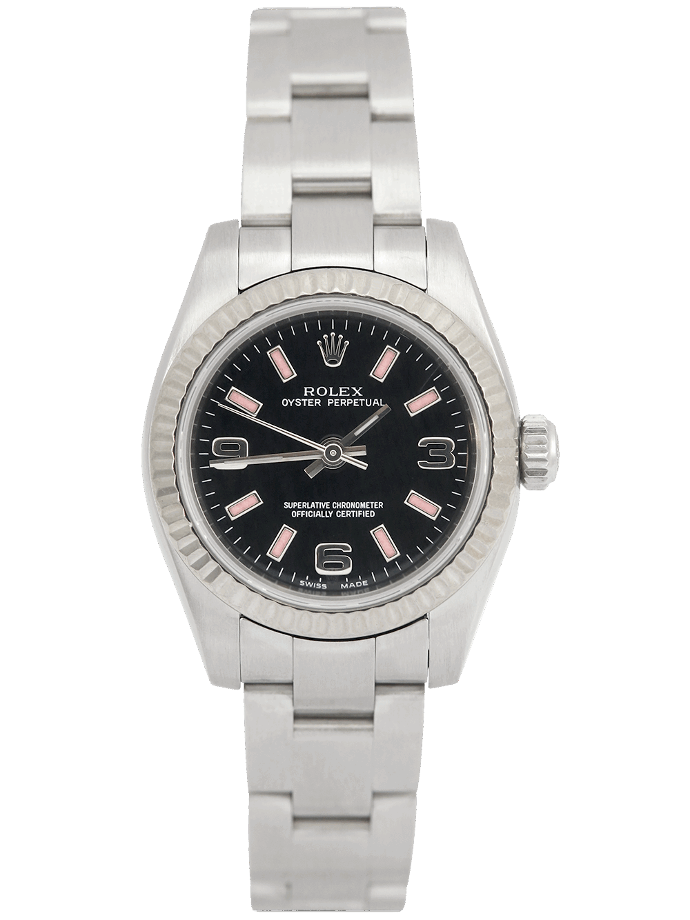A one previous owner pre-owned stainless steel 26mm case size chronometer certified automatic movement Rolex Datejust Lady model reference 176234. Featuring a desirable black dial with pink baton hour markers and stainless steel numerals at 3/6/9 which is surrounded by a white gold fluted bezel. All presented on a full retail length stainless steel Rolex Oyster bracelet with a folding clasp.