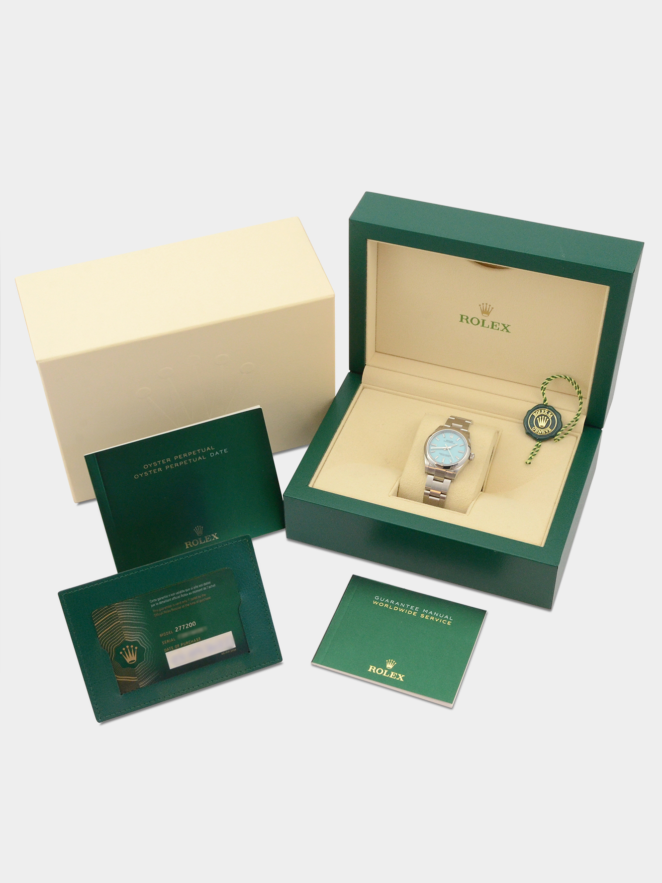 This particular watch is supplied as shown in the detailed images with both of the original inner and outer Rolex boxes, one original Rolex swing tag, the two original Rolex booklets, the original Rolex warranty card holder and the original Rolex warranty card dated September 2022 when first supplied new.