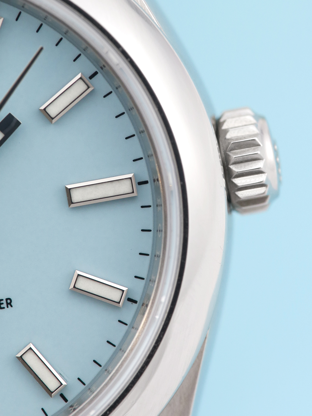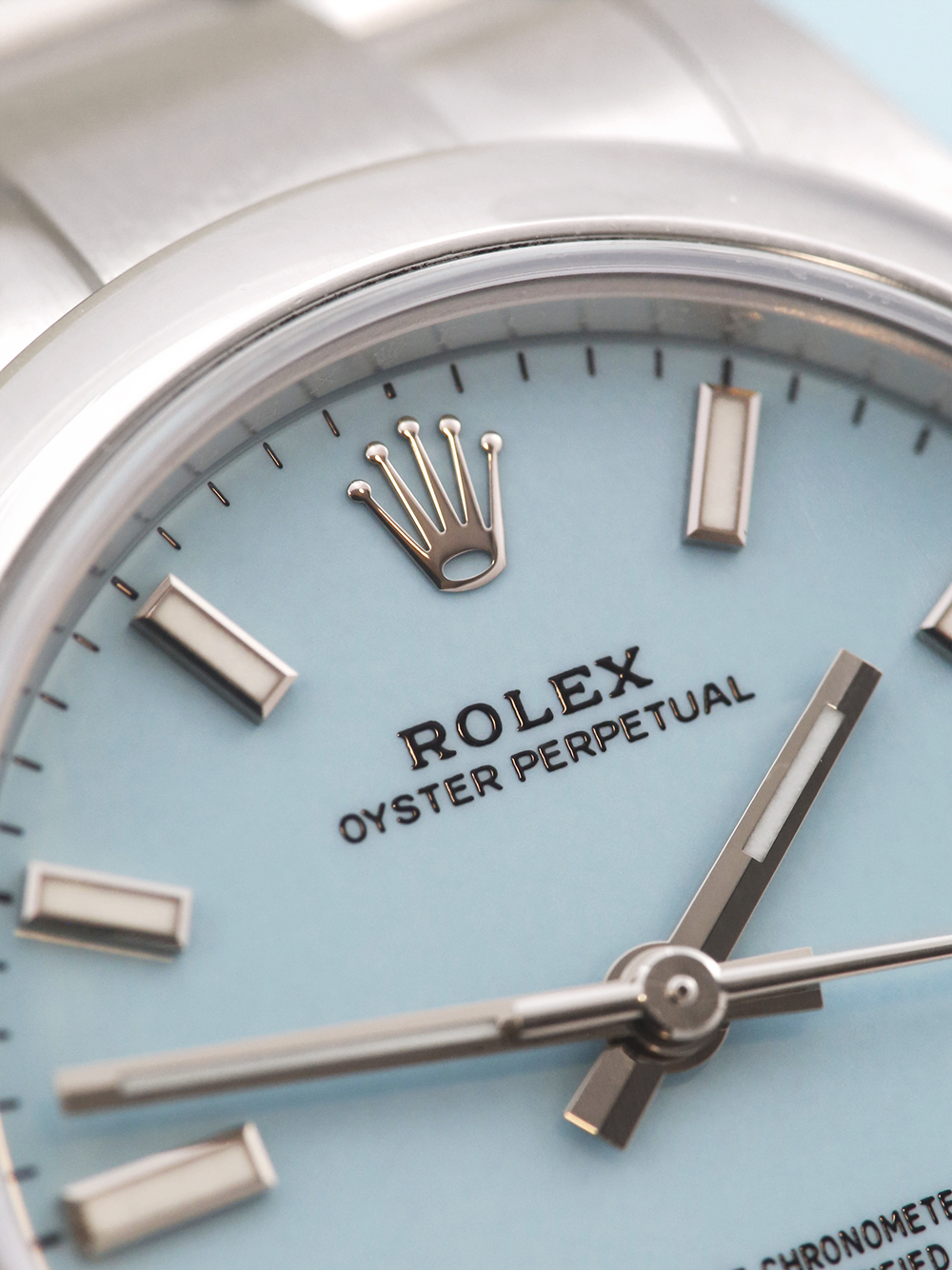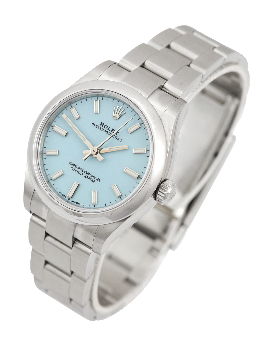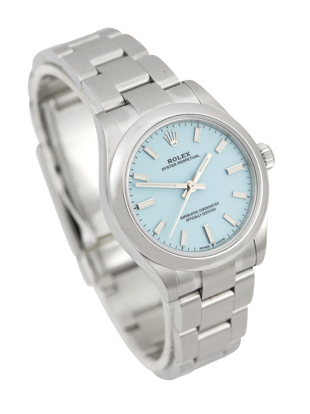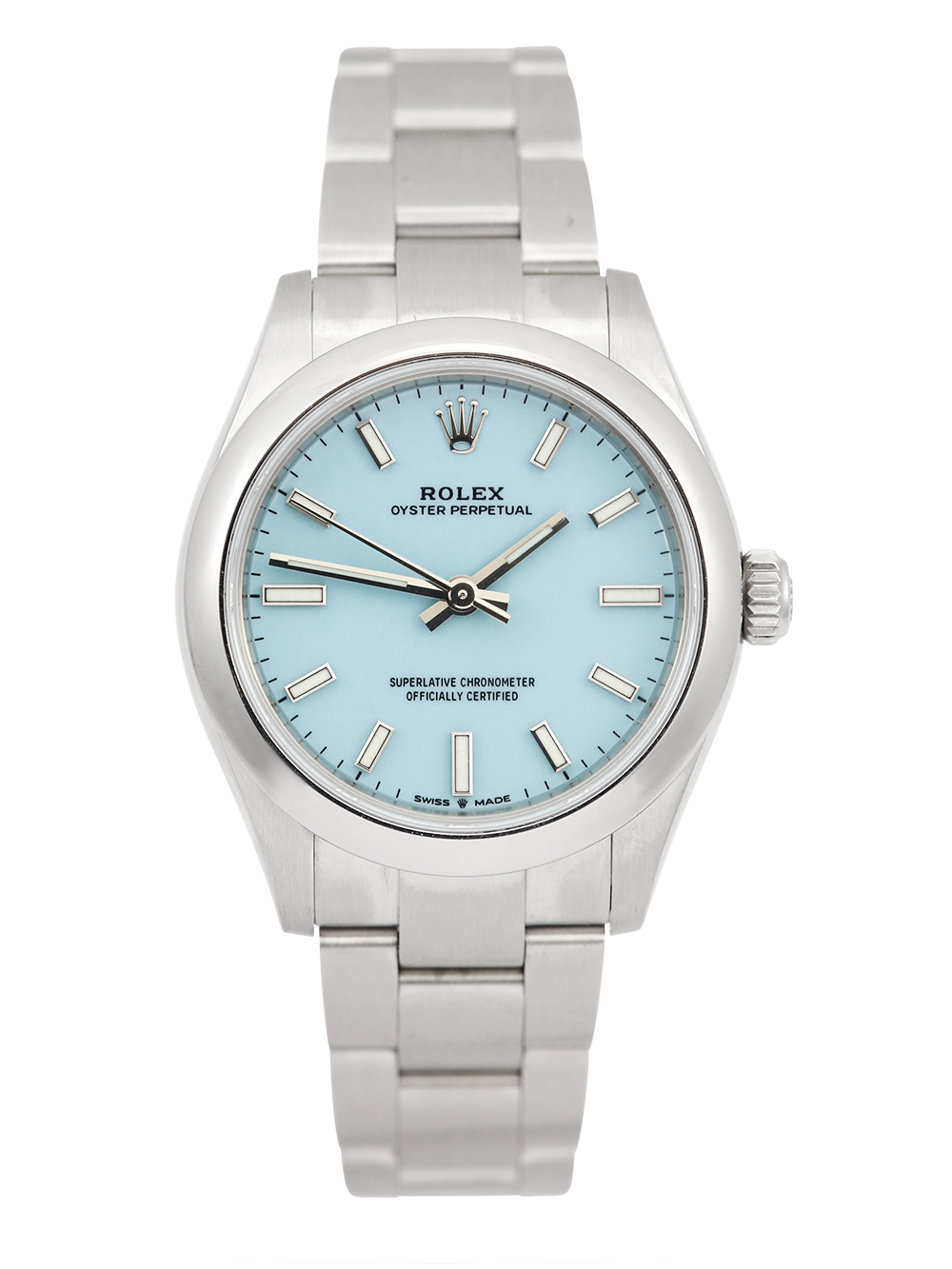 A preowned in excellent condition chronometer-certified automatic movement Rolex Oyster Perpetual 31, model reference 277200. Featuring a 31mm stainless steel case, housing a Tiffany blue (turquoise) dial with luminous hands and baton hour markers. The dial is surrounded by a polished finish stainless steel domed bezel. All presented on a full retail length brushed finish stainless steel Rolex Oyster bracelet.