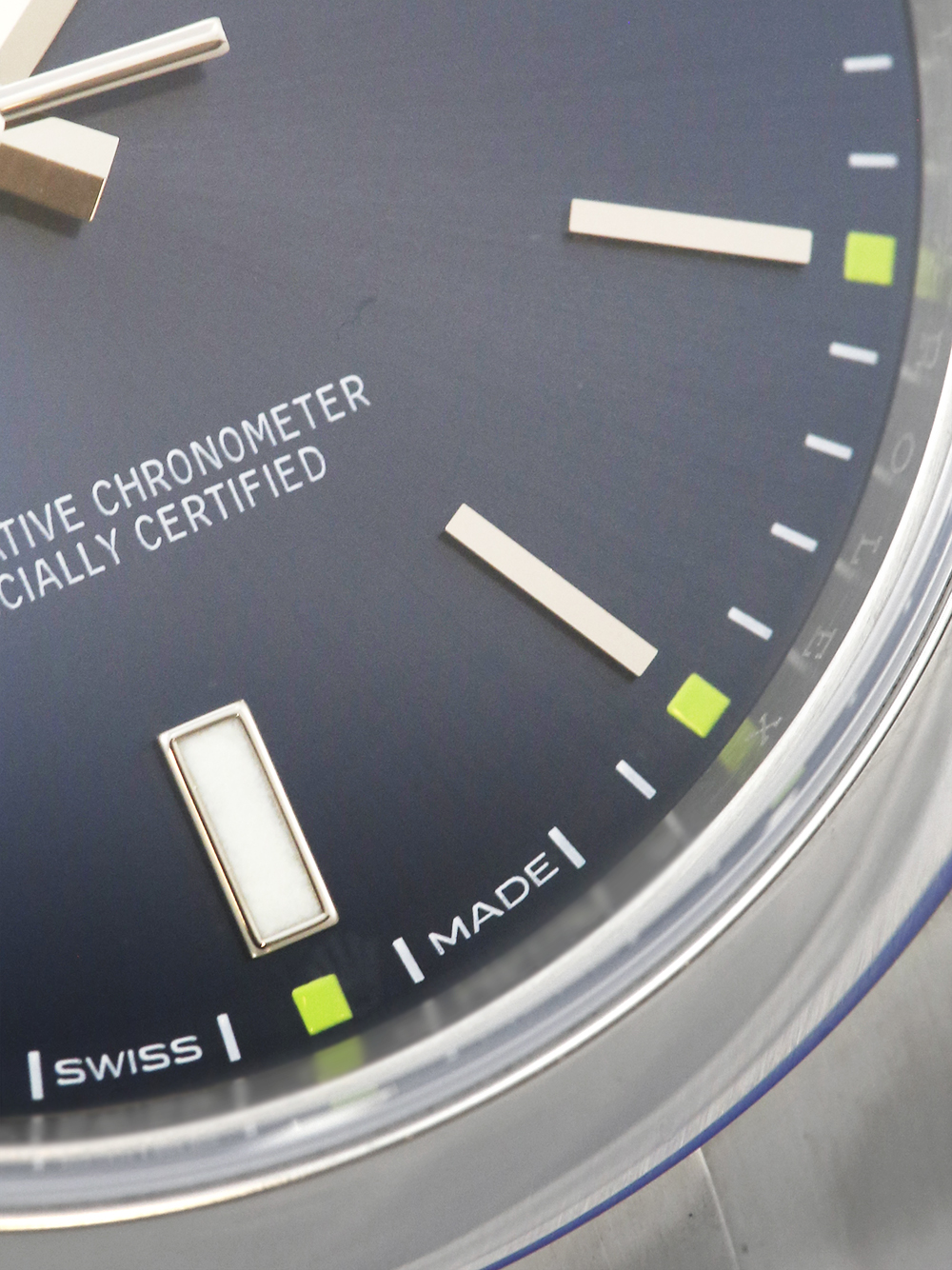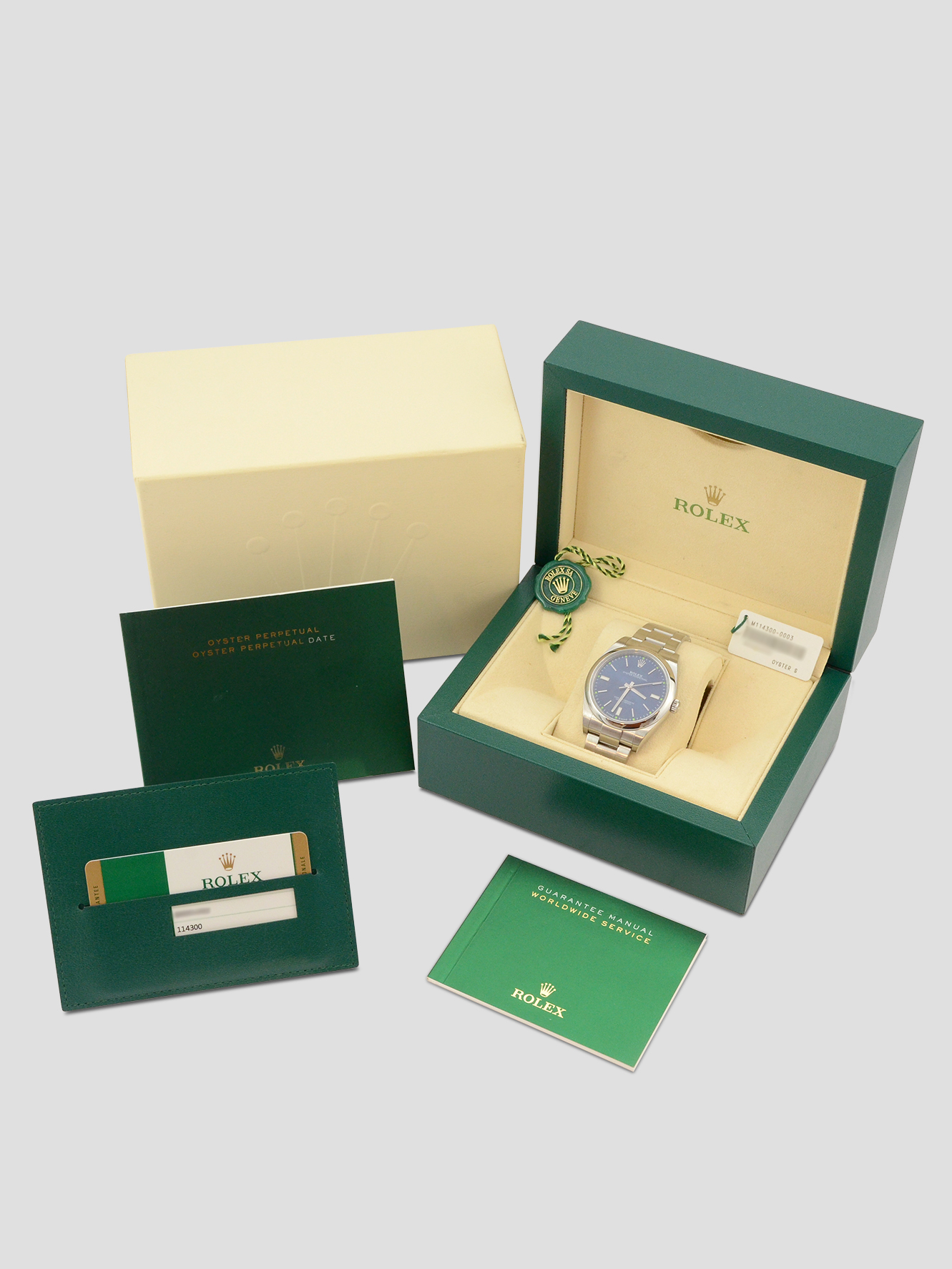 A previously owned, in excellent condition which could easily be mistaken for brand new, chronometer-rated, automatic movement Rolex Oyster Perpetual, model reference 114300. Featuring a 39mm stainless steel case, housing a blue baton dial with luminous markers at 3, 6 and 9 o’clock and blue detail. The dial is surrounded by a polished finish stainless steel domed bezel & protected by a sapphire crystal. Presented on a full retail length stainless steel Rolex Oyster bracelet with a folding Oysterclasp.