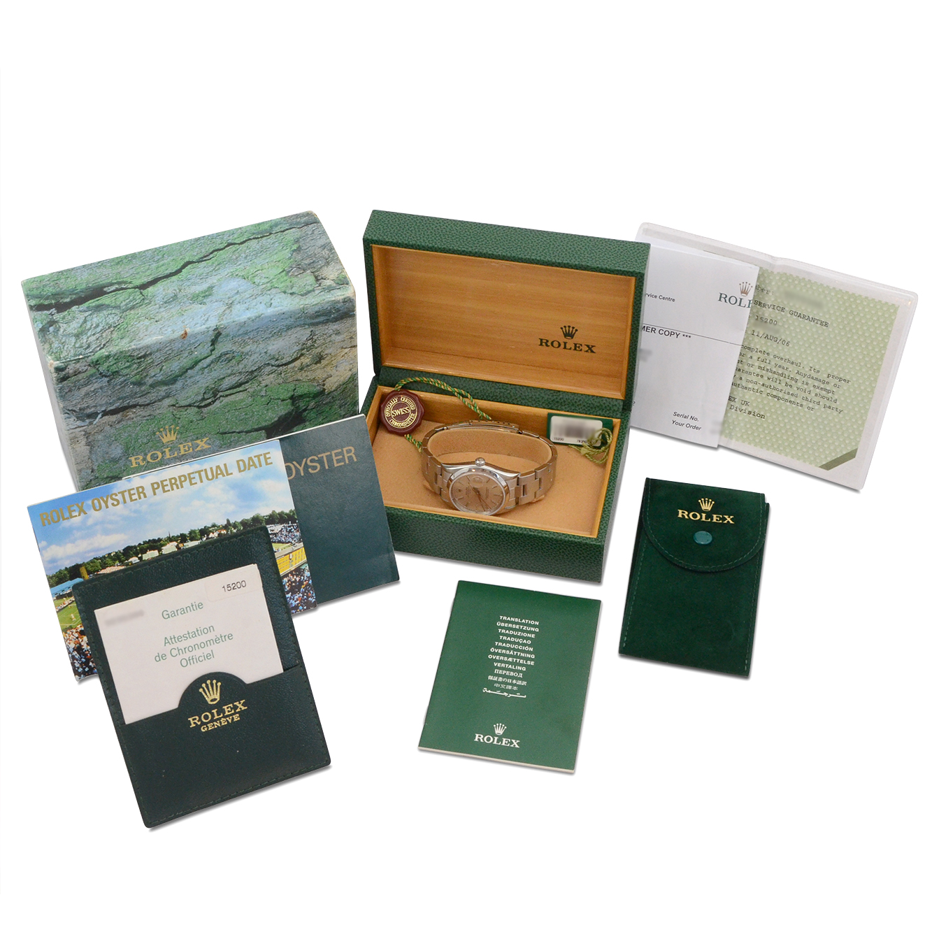 As shown in the detailed images this watch is supplied with the origianl inner and outer boxes, the two original swing tags, three original Rolex manuals, the original Rolex certificate holder and the original Rolex certificate dated August 2003 when first supplied new by the UK based authorised dealer.