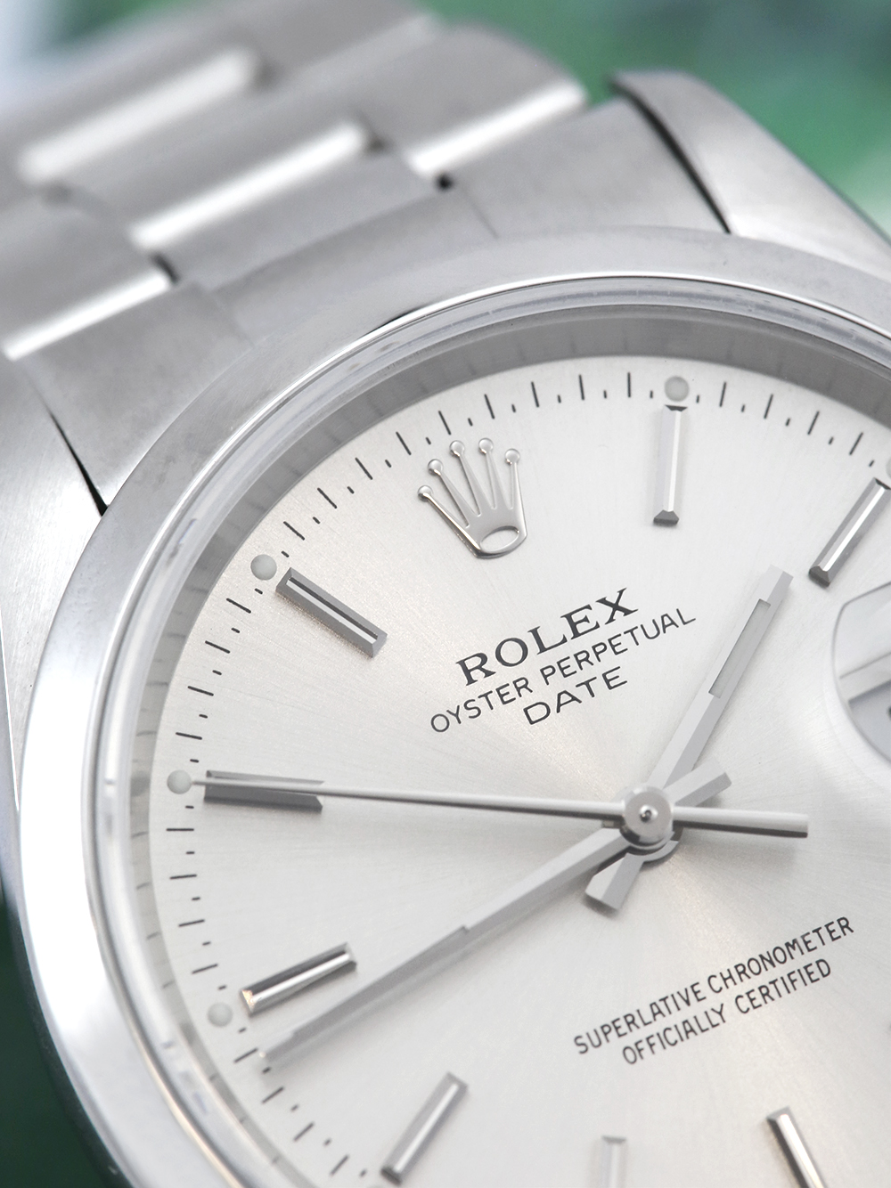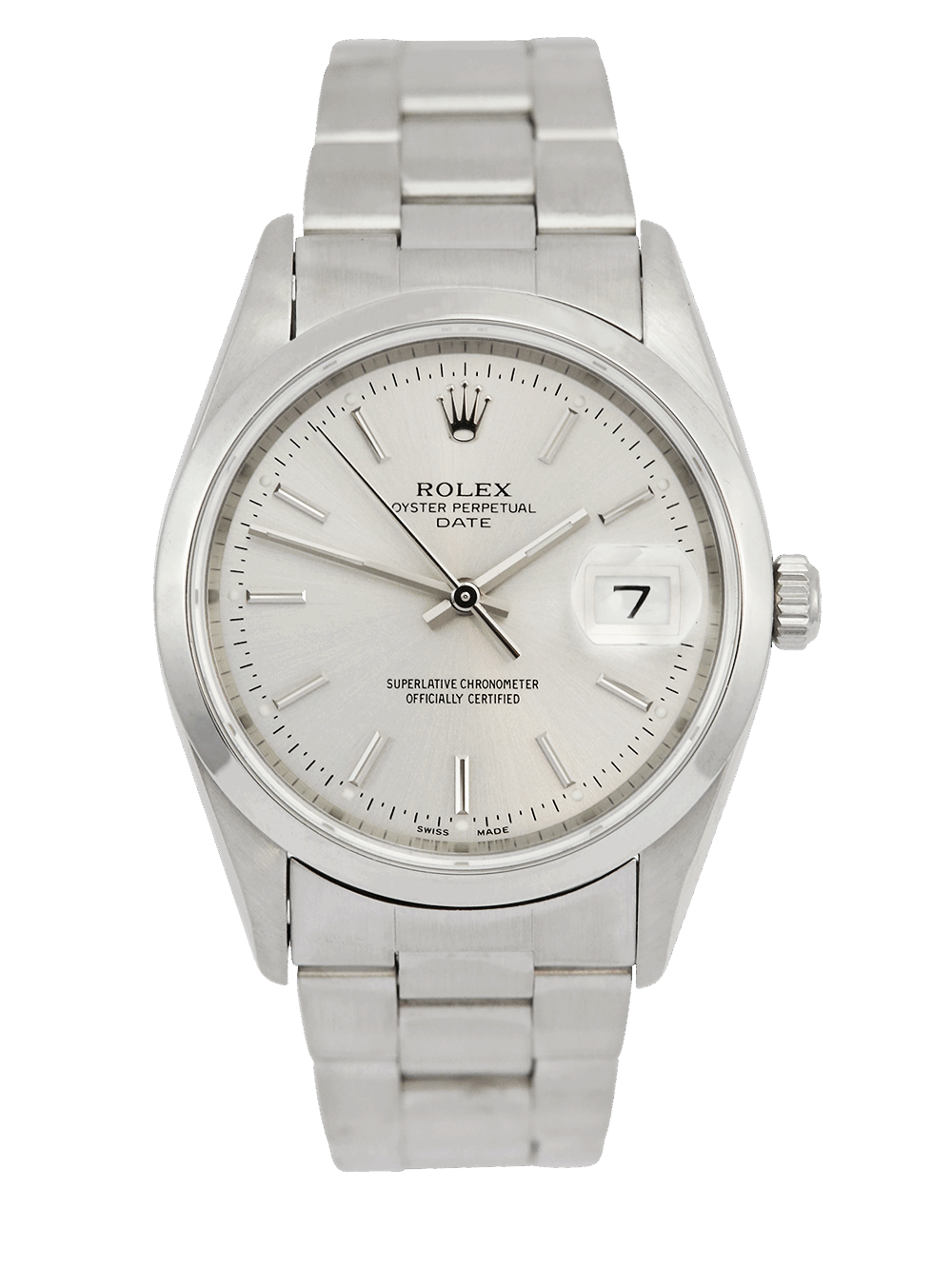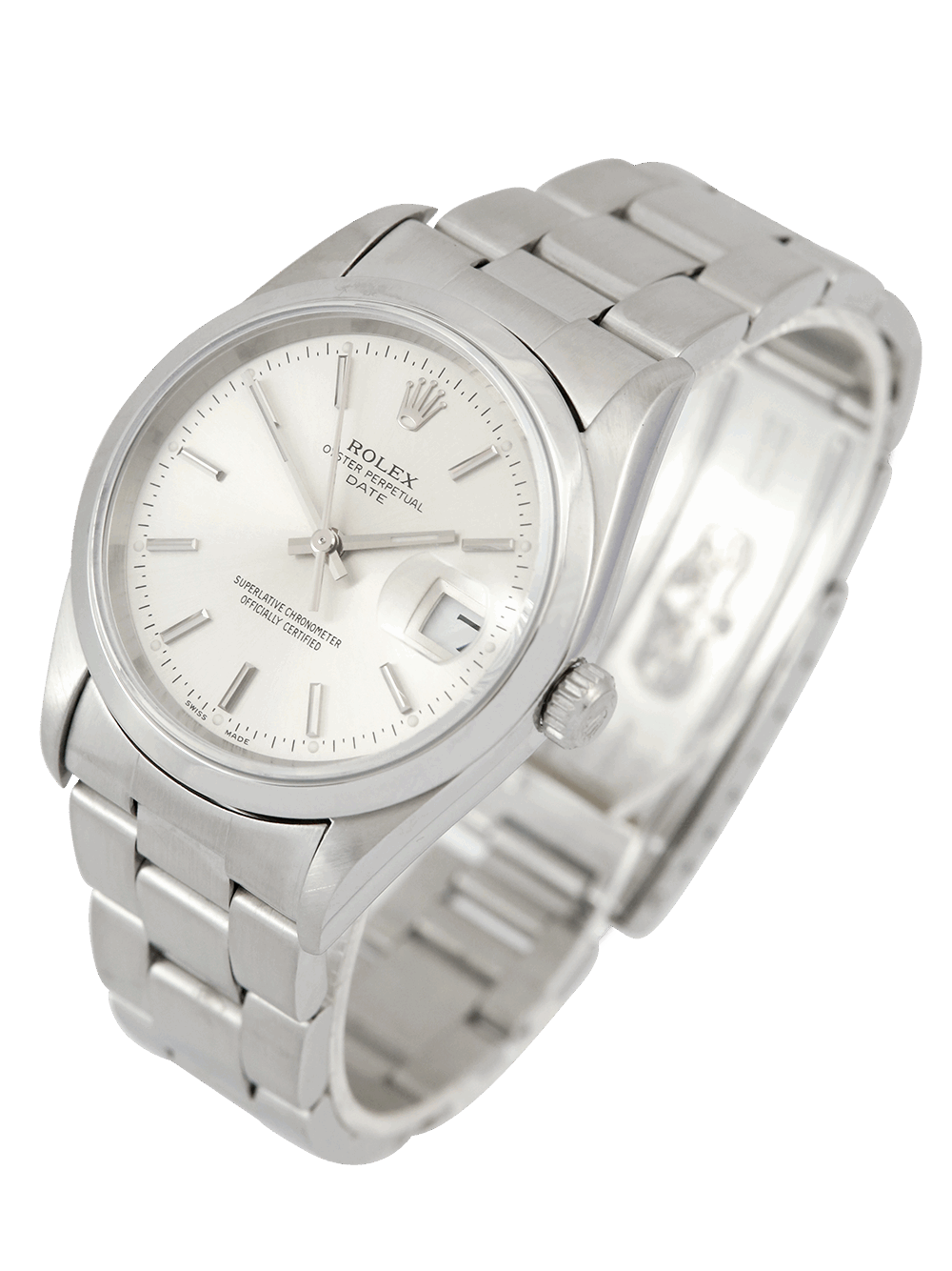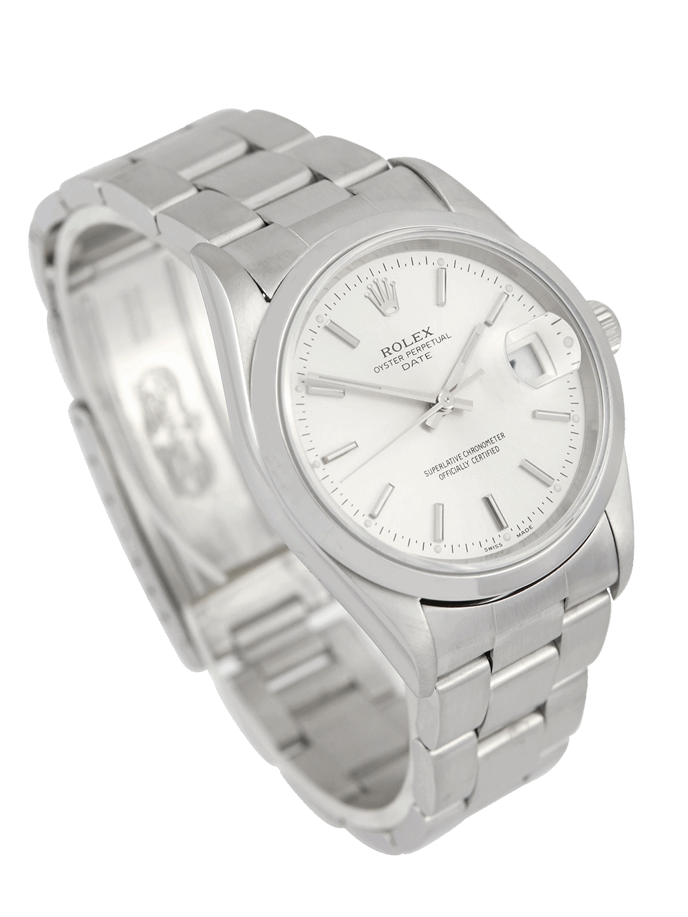 An excellent condition pre-owned 34mm case size ‘Y’ serial stainless steel superlative chronometer, calibre 3135, automatic movement Rolex Oyster Perpetual Date 34 model reference 15200 featuring a silver baton dial housing a date aperture at 3 O’clock surrounded by a polished finish stainless steel domed bezel on a full retail length stainless steel Rolex Oyster bracelet.