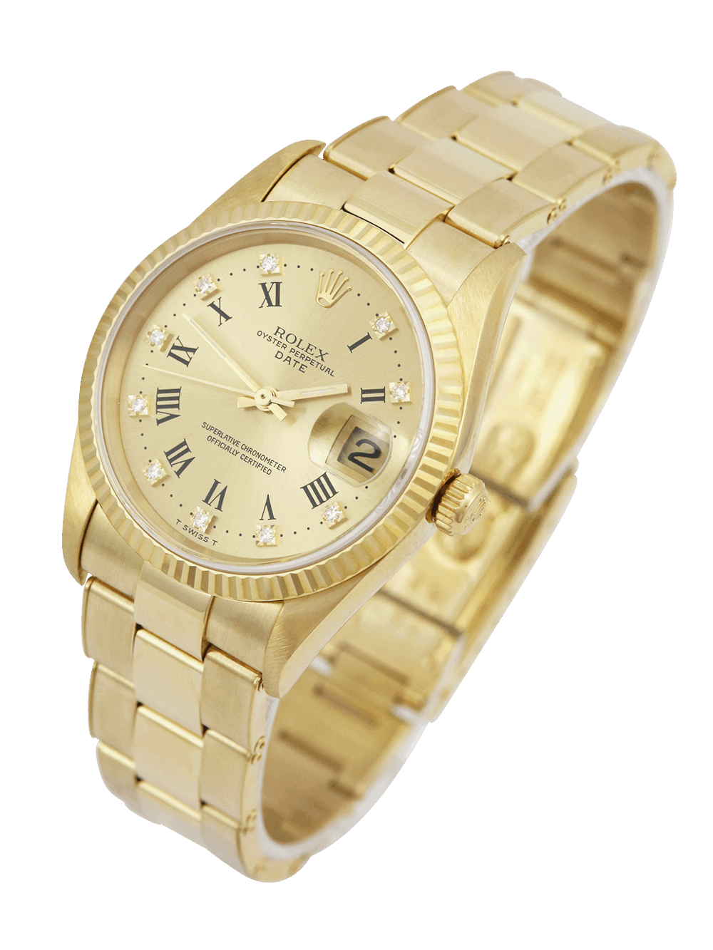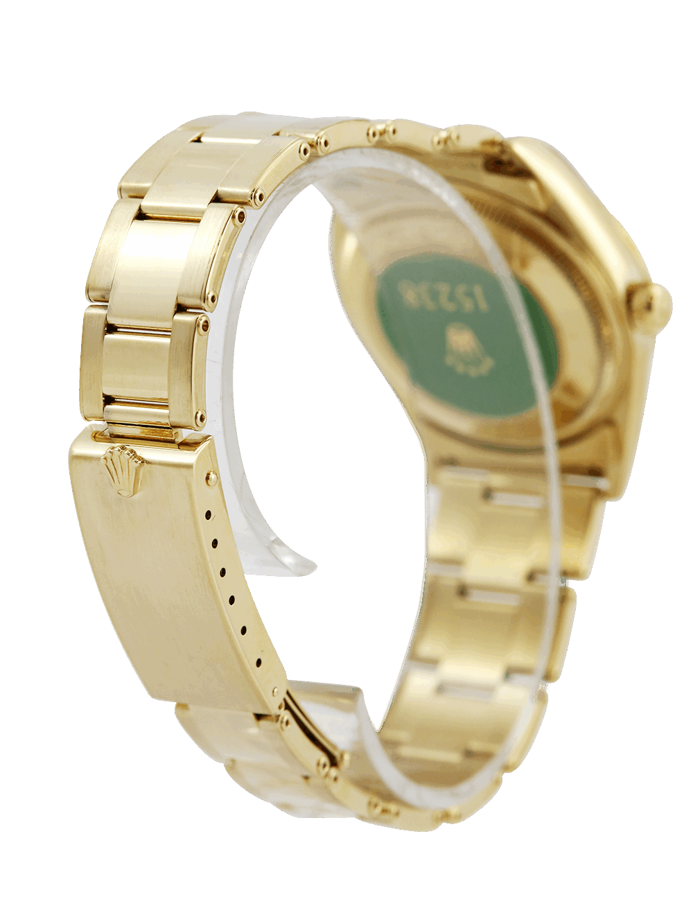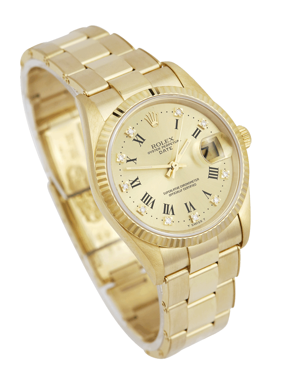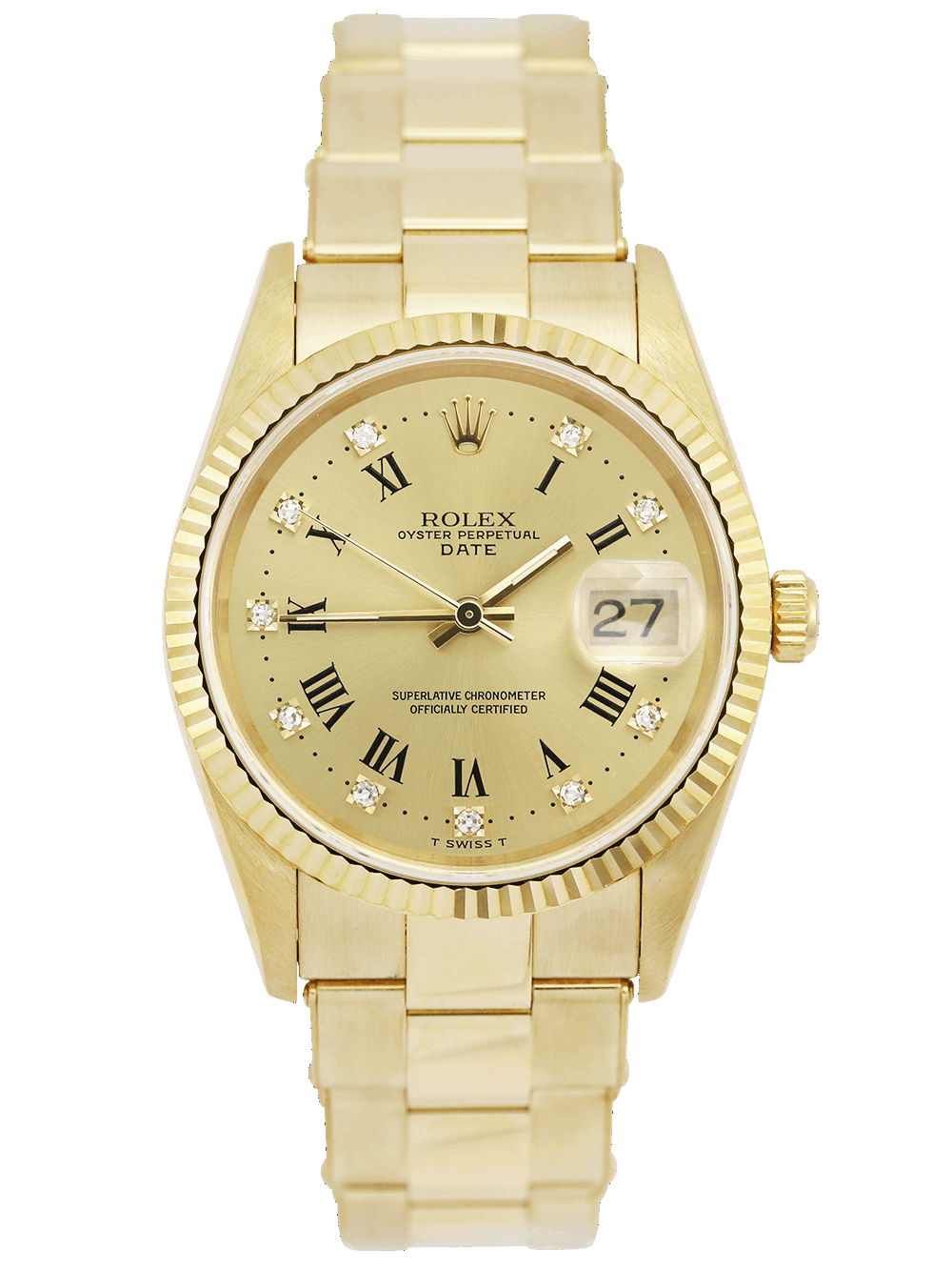 We are please to offer for sale this pre-owned in pristine condition a Rolex Oyster Perpetual Date model reference 15238. Featuring a 34mm yellow gold case, housing a champagne diamond dot & Roman numeral hour markers. The dial is surrounded by a yellow gold fluted bezel. All presented on a full retail length yellow gold Rolex Oyster bracelet with a folding clasp.