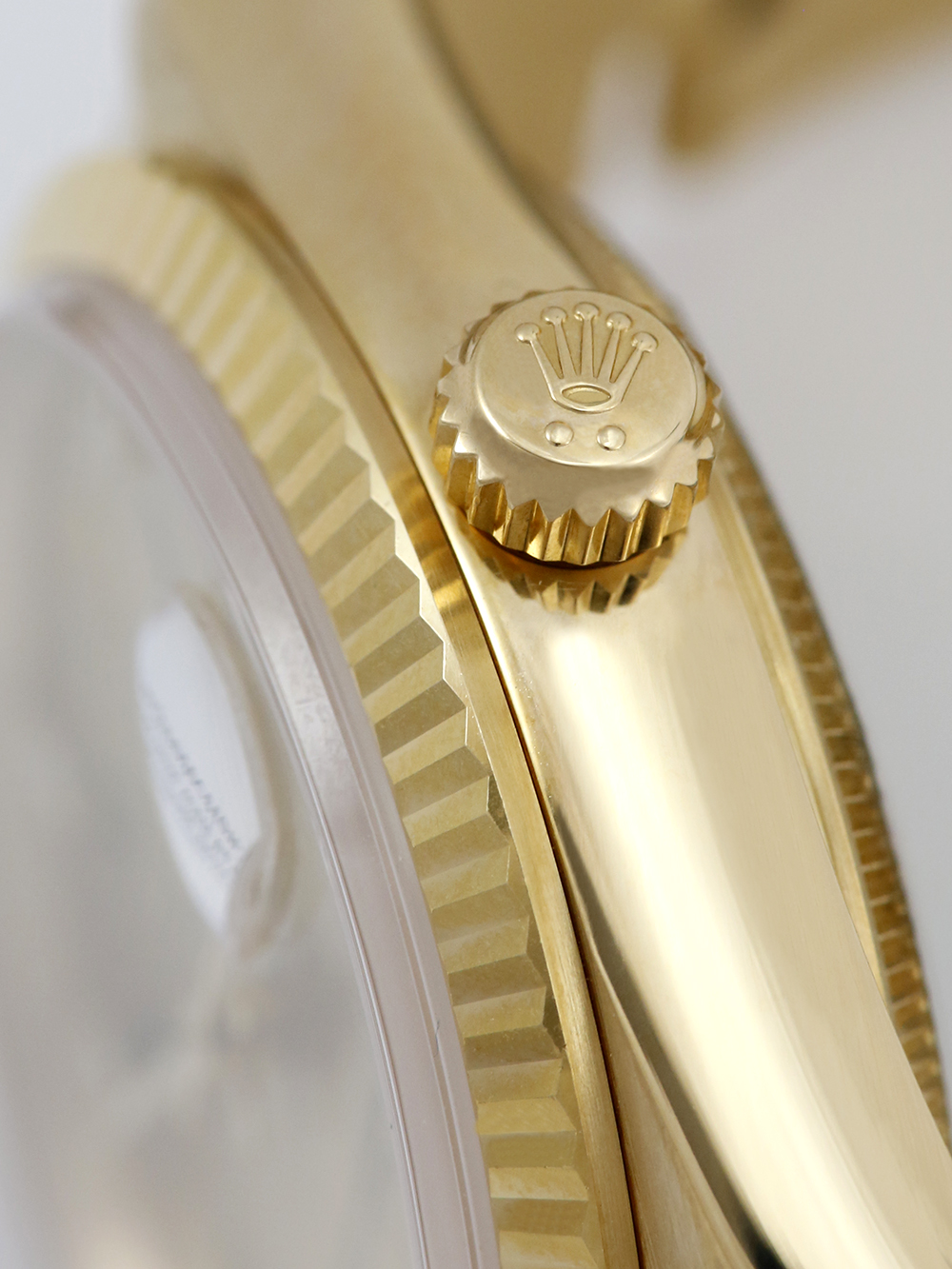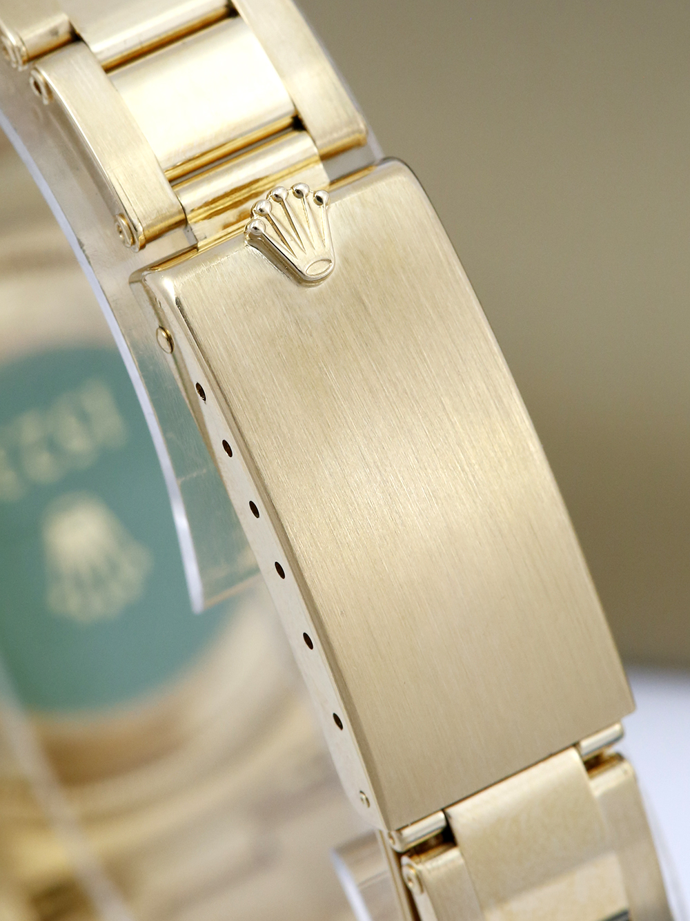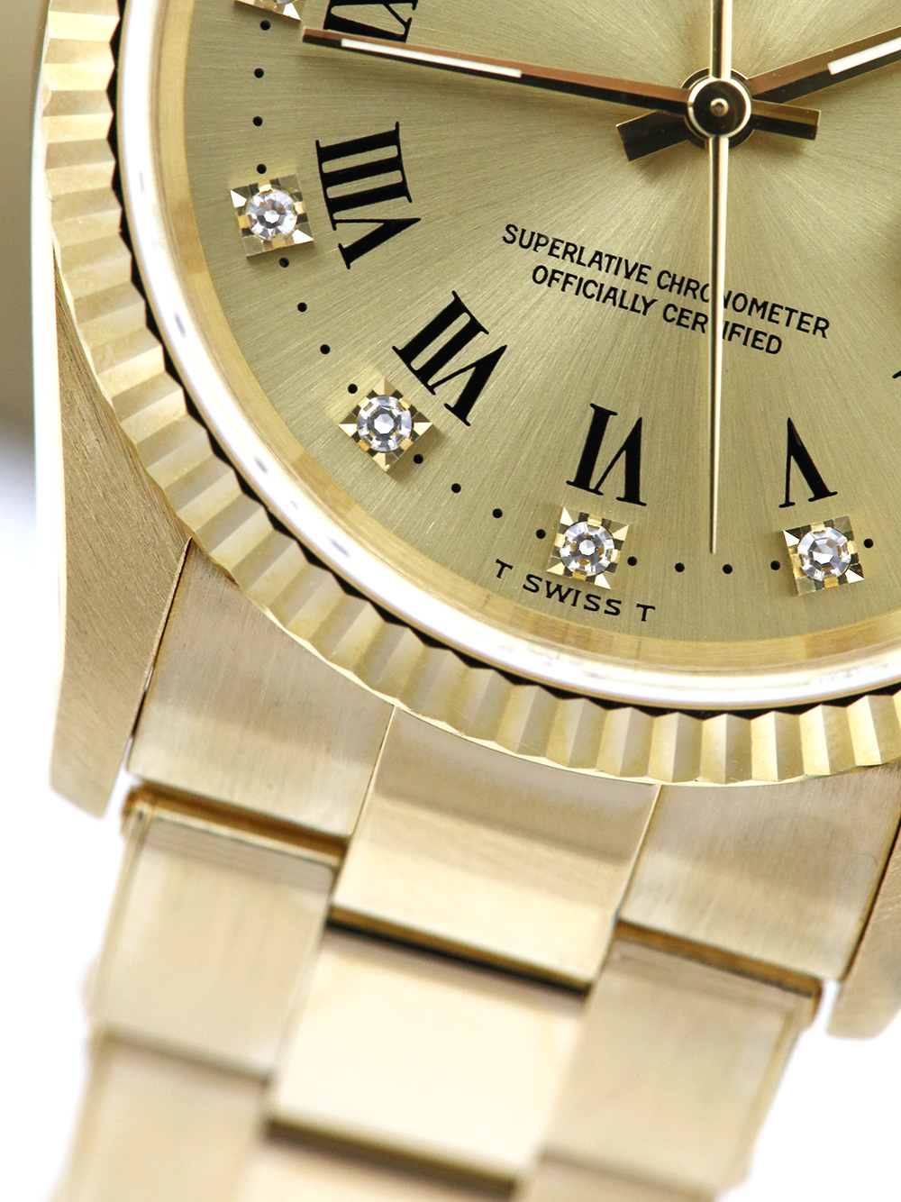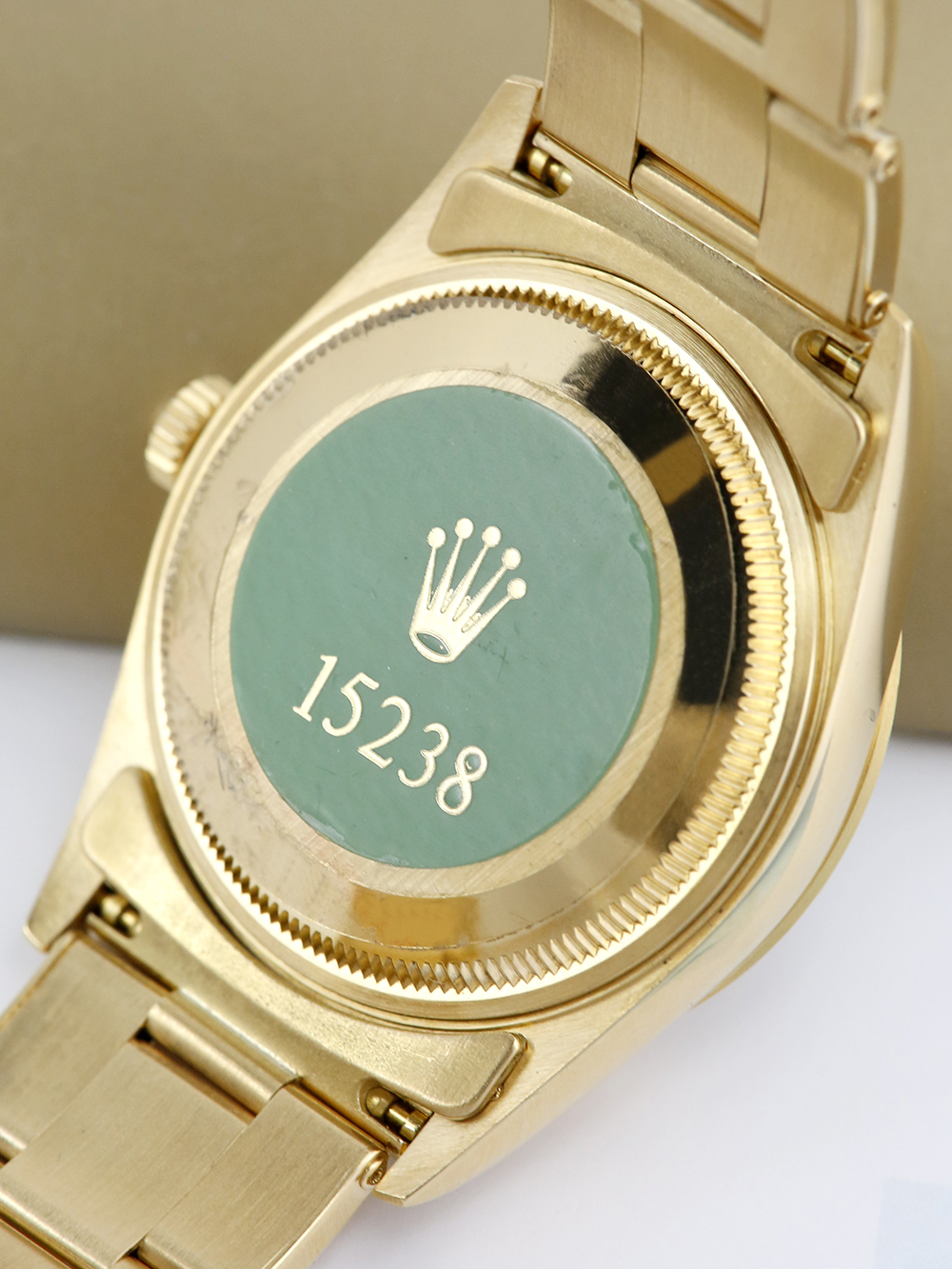 We are please to offer for sale this pre-owned in pristine condition a Rolex Oyster Perpetual Date model reference 15238. Featuring a 34mm yellow gold case, housing a champagne diamond dot & Roman numeral hour markers. The dial is surrounded by a yellow gold fluted bezel. All presented on a full retail length yellow gold Rolex Oyster bracelet with a folding clasp.