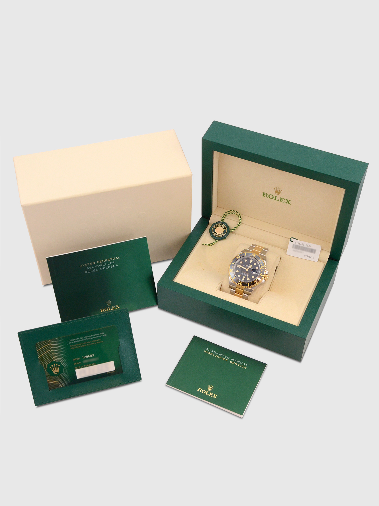 This watch is supplied as shown in the detailed images with both of the original Rolex inner and outer boxes, two original Rolex swing tags, two original Rolex booklets, the original Rolex warranty card holder and the original Rolex warranty card dated January 2023.