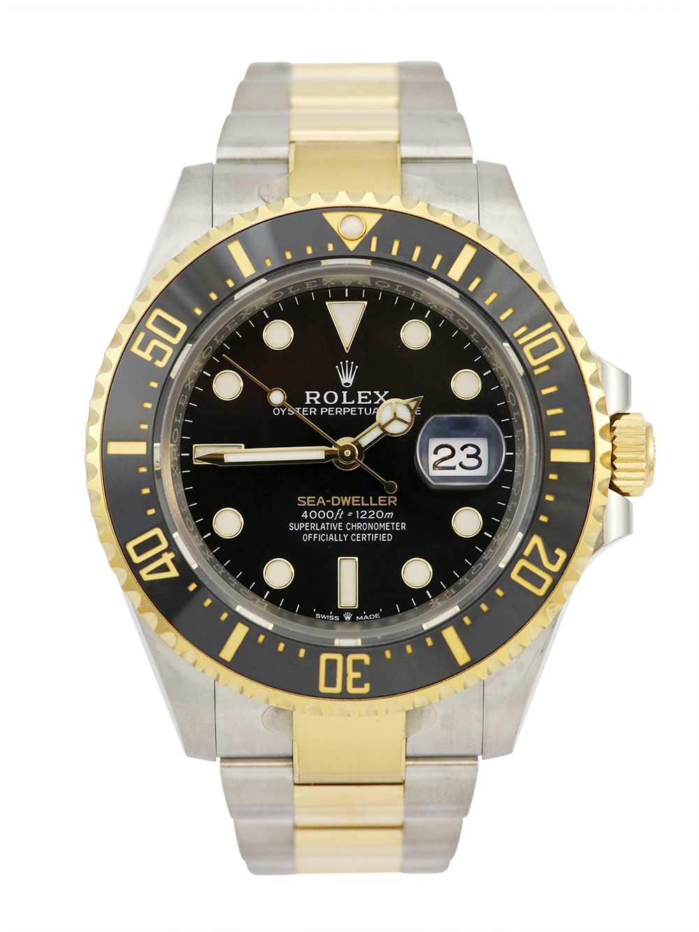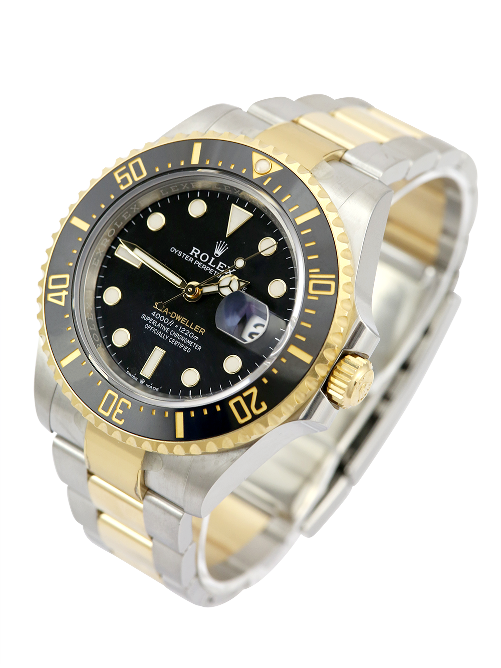 A preowned in pristine condition Oyster Steel and yellow gold Bi-Metal superlative chronometer, calibre 3235, automatic movement Rolex Sea-Dweller model reference 126603 featuring a black baton dial bearing the name ‘Sea-Dweller’ in gold surrounded by a black 60-minute unidirectional ceramic divers bezel on a full retail length Oyster Steel and yellow gold Rolex Oyster bracelet.