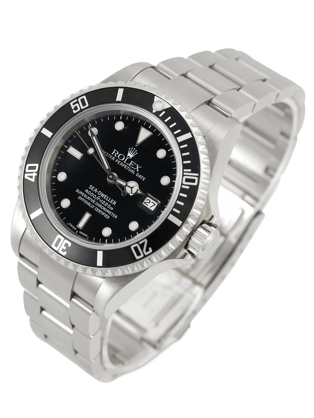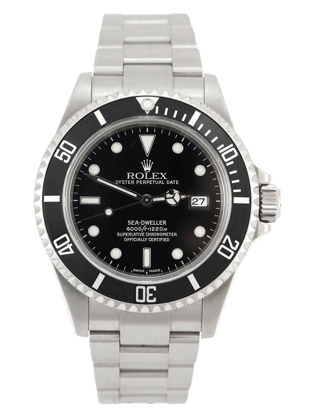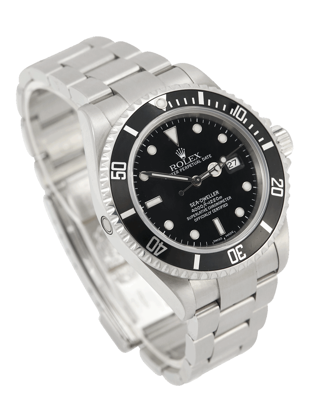 We are delighted to offer for sale this excellent condition pre-owned 40mm case size Oystersteel Superlative Chronometer Rolex Sea-Dweller 16600 featuring a black baton dial housing a date aperture at 3 O’clock surrounded by an Oystersteel unidirectional bezel with a black aluminium 60-minute insert. Presented on a full retail length Oystersteel Rolex Oyster bracelet.