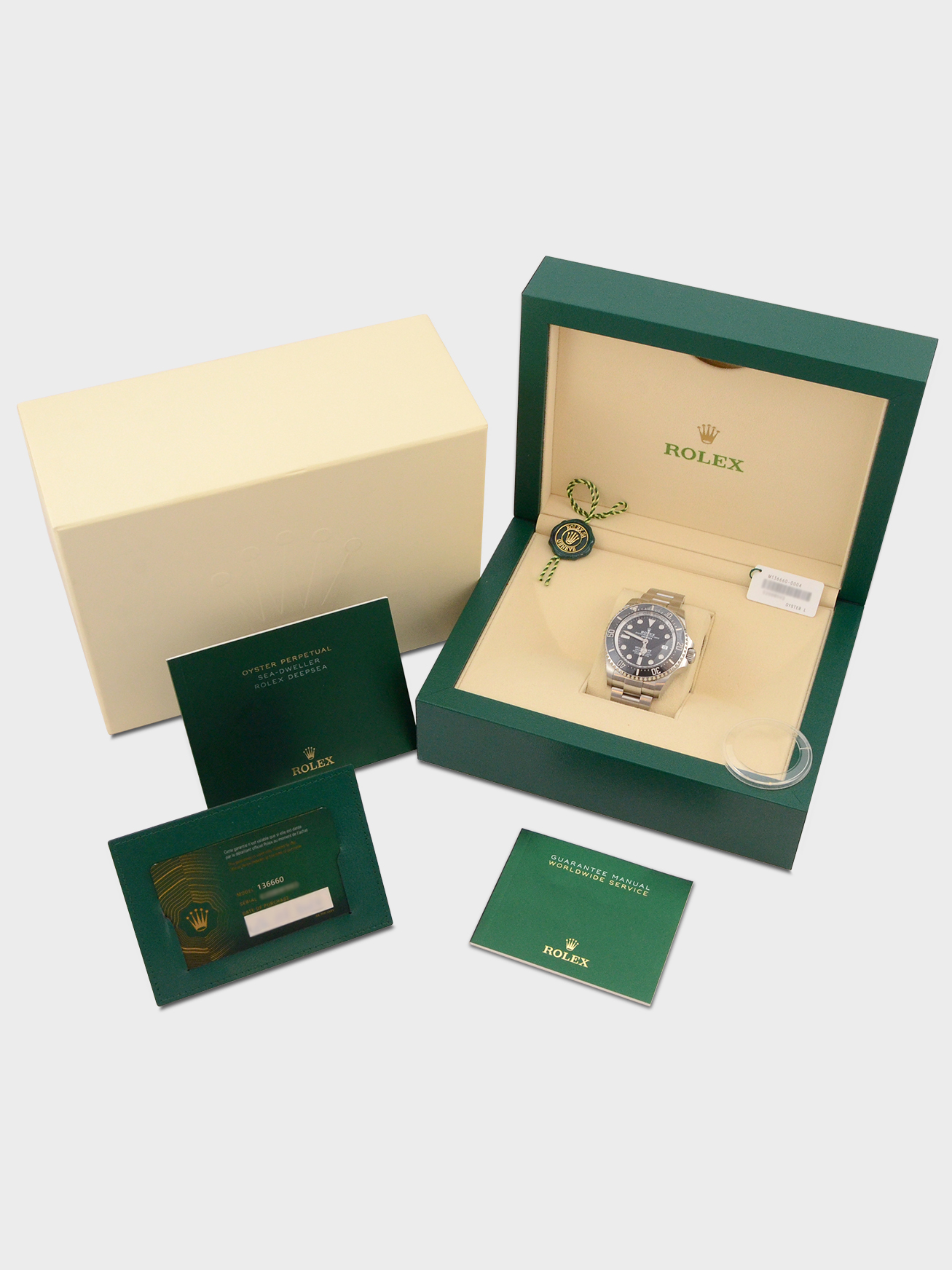 This particular watch is supplied as shown in the detailed images with both of the original Rolex inner and outer boxes, the two original Rolex swing tags, the two original Rolex manuals, the original Rolex warranty card holder and the original Rolex warranty card. The card is dated July 2023 when the watch was first supplied new.