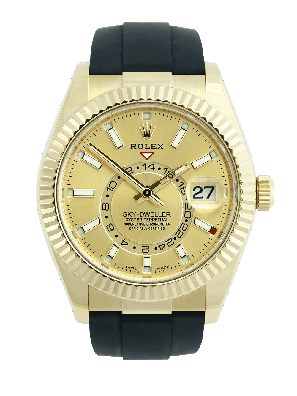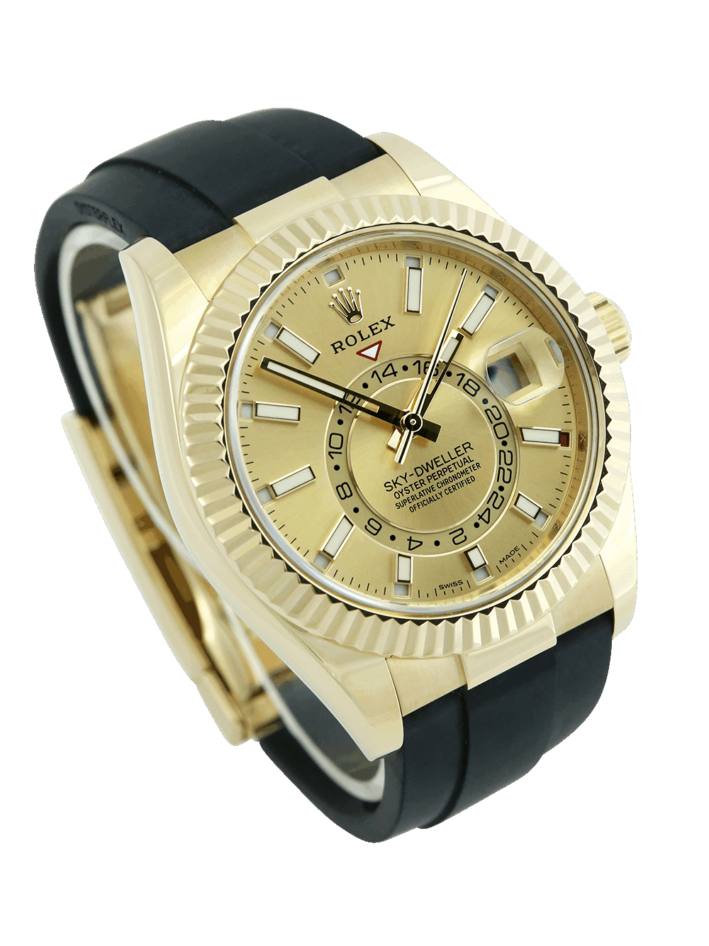 This Rolex Sky-Dweller 326238 was acquired from the original owner and it is presented for sale in an excellent pre-owned condition. It features a 42mm yellow gold case in Oyster technology, which together with the Twinlock screw-down crown ensures the highest standard of waterproofness. The champagne dial is populated by gold-outlined luminous baton hour markers, protected by scratch-resistant sapphire glass and surrounded by an 18ct yellow gold fluted bezel. The watch is powered by the Rolex 9001 calibre, one of the most complex movements ever created by Rolex. Presented on a black rubber Rolex Oysterflex strap with a yellow gold Oysterclasp.