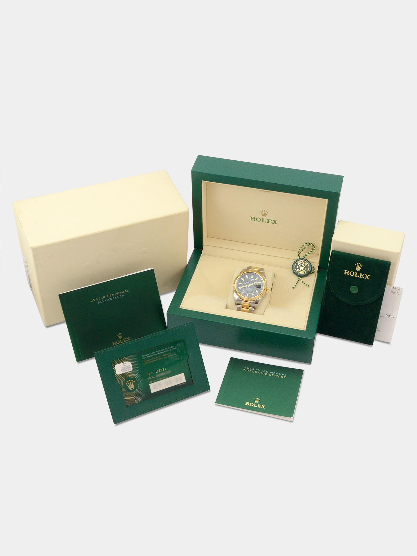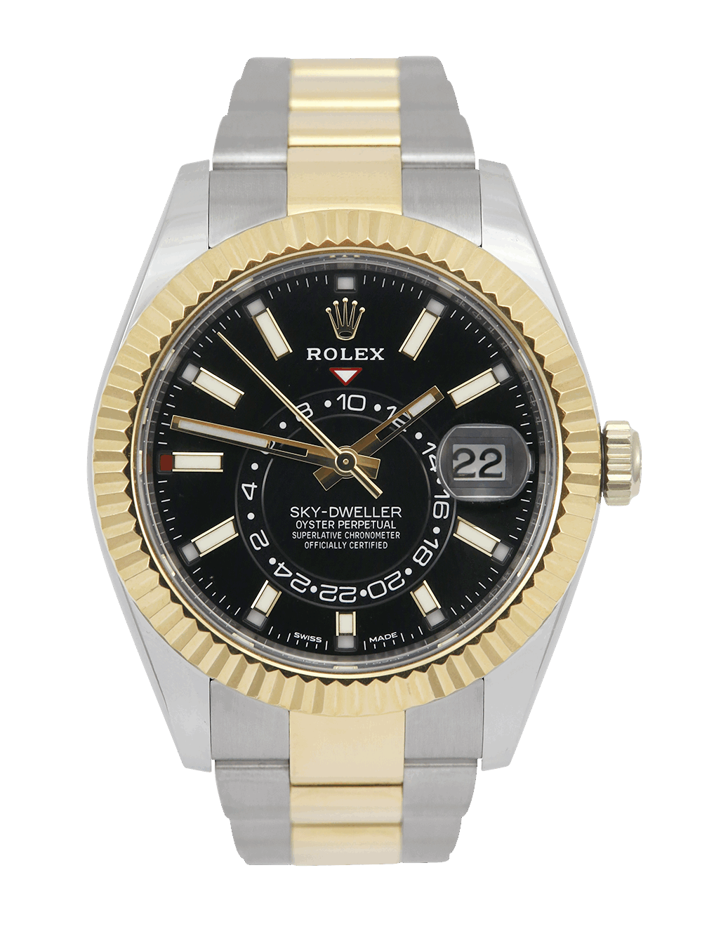 An excellent condition, pre-owned, superlative chronometer certified, automatic movement Rolex Sky-Dweller model reference 326933. Featuring a 42mm bimetal stainless steel and yellow gold case, housing a black baton dial with a central 24h clock, an annual calendar function and a date aperture at 3 o’clock. The dial is surrounded by a yellow gold fluted bezel. All presented on a full retail length stainless steel & yellow gold Rolex Oyster bracelet with an Oysterclasp folding closure.