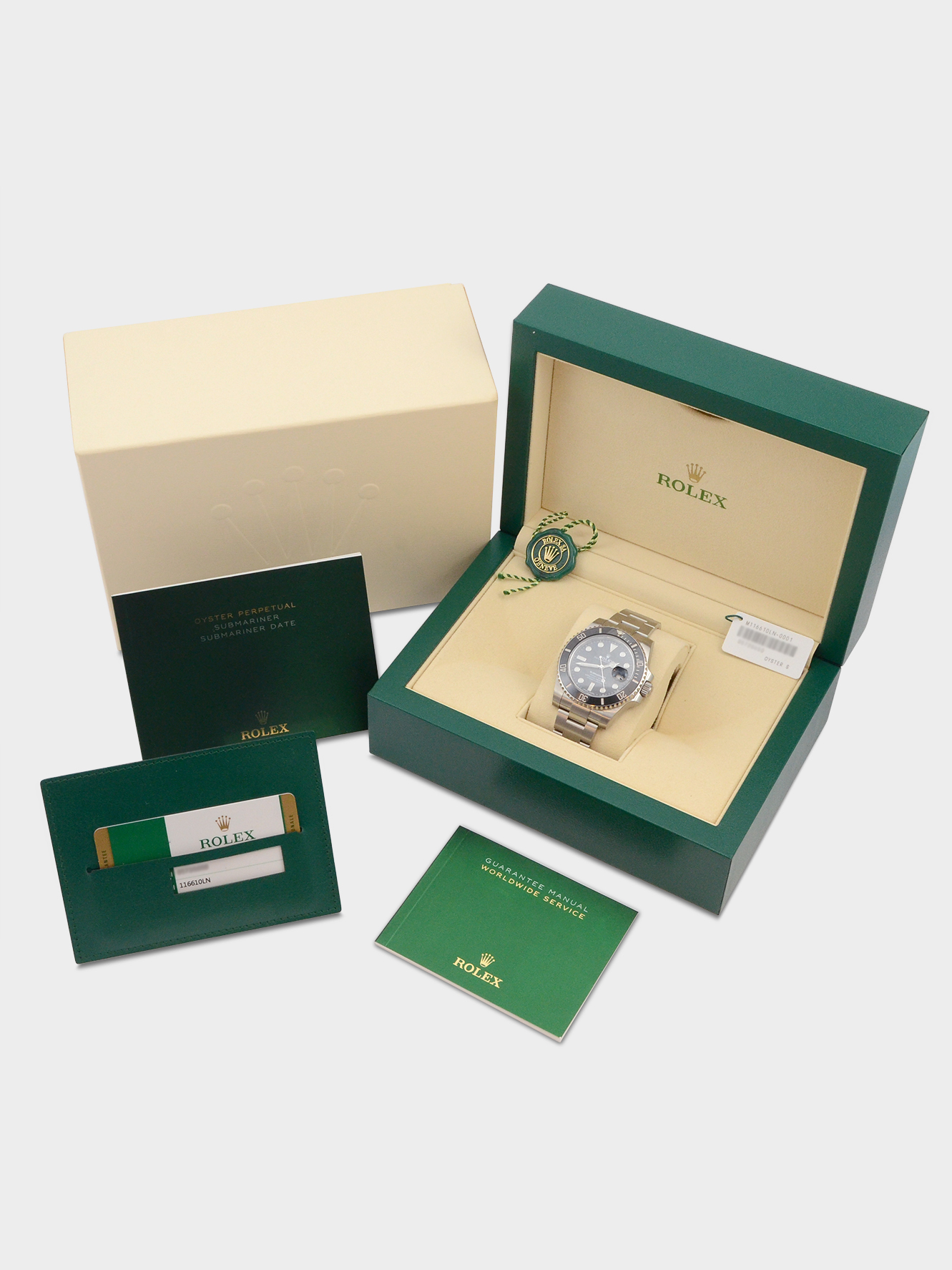 This particular watch is supplied as shown in the detailed images with both of the original inner and outer Rolex boxes, both of the original Rolex manuals, two original Rolex swing tags, the original Rolex warranty card holder and the original Rolex warranty card dated when first supplied new in March 2019 by the U.K based authorised dealer.