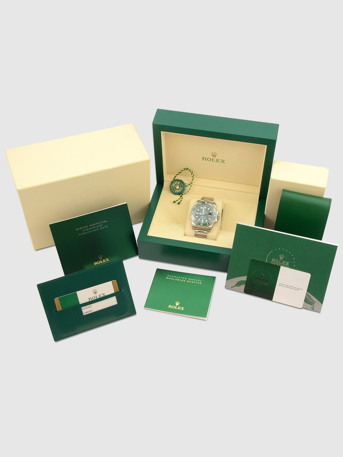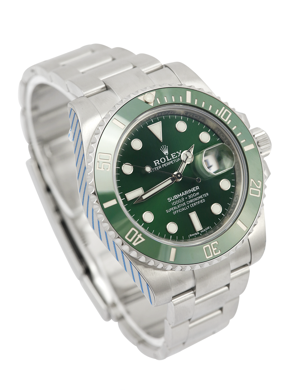A serviced and unworn since pre-owned in pristine cosmetic condition chronometer certified automatic movement Rolex Submariner Date, model reference 116610LV aka “Hulk”. Featuring a 40mm stainless steel case, housing a green ‘sunburst’ effect baton dial with a date aperture at 3 o’clock and an external cyclops. The dial is surrounded by a green ceramic 60 minute uni-directional rotating diver’s bezel. Fitted with a full retail length stainless steel Rolex Oyster bracelet with a secure folding Oysterlock clasp.