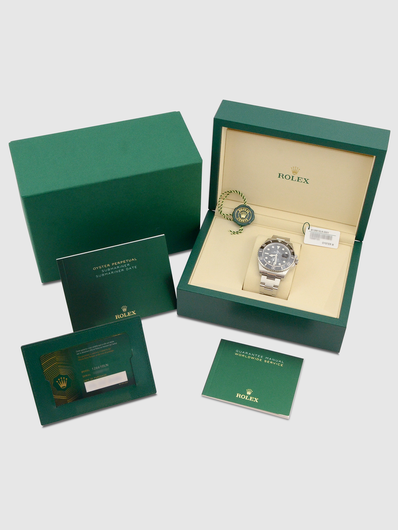 This particular watch is supplied as shown in the detailed images with both of the original new style inner and outer Rolex boxes, the two original Rolex swing tags, the two original Rolex booklets, the original Rolex warranty card holder and the new style Rolex warranty card dated late February 2026 when first supplied new.