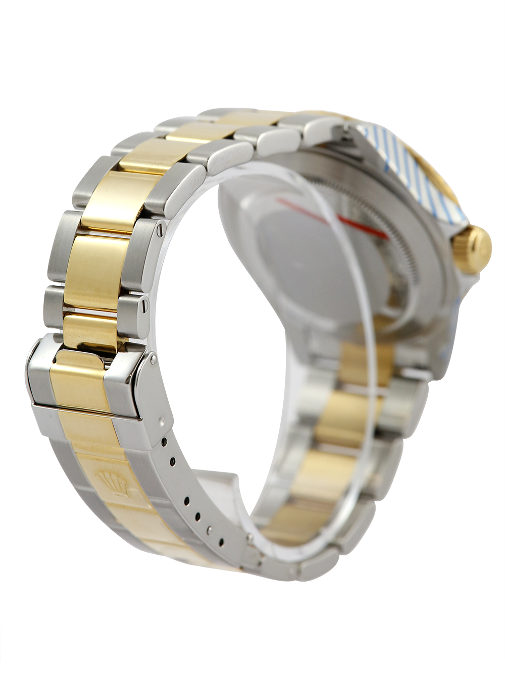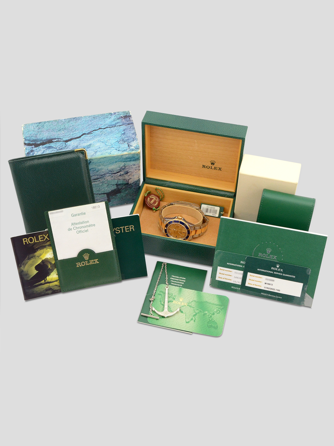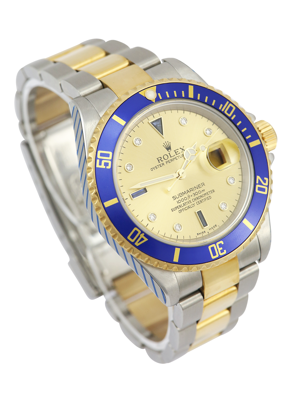 A pre-owned serviced by Rolex in 2022 and unworn since with the Rolex service stickers still intact and untampered therefore presented in excellent condition. A stainless steel and yellow gold bi-metal chronometer certified automatic movement Rolex Submariner Date model reference 16613 featuring a champagne ‘serti’ dial, with eight Diamond dot hour markers and three Sapphire markers, ‘serti’ is French for ‘setting’. The dial is surrounded by a 60 minute uni-directional blue aluminium insert bezel with yellow gold outer. This particular watch is very hard to come by with the ‘Serti’ dial, this stunning example comes on a bi/colour Rolex Oyster bracelet.